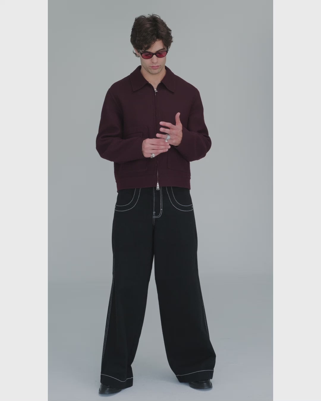 A JNCO classic in Jet Black denim. 13oz 100% cotton rope-dyed with a luxe starch wax finish. 26" bottom opening with contrast stitching and wide double-stitched scoop and back pockets. Features original artwork, labels, and metallic swivel J embroidery on back pocket. Collectible flasher included.