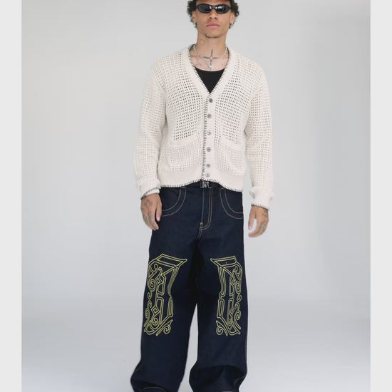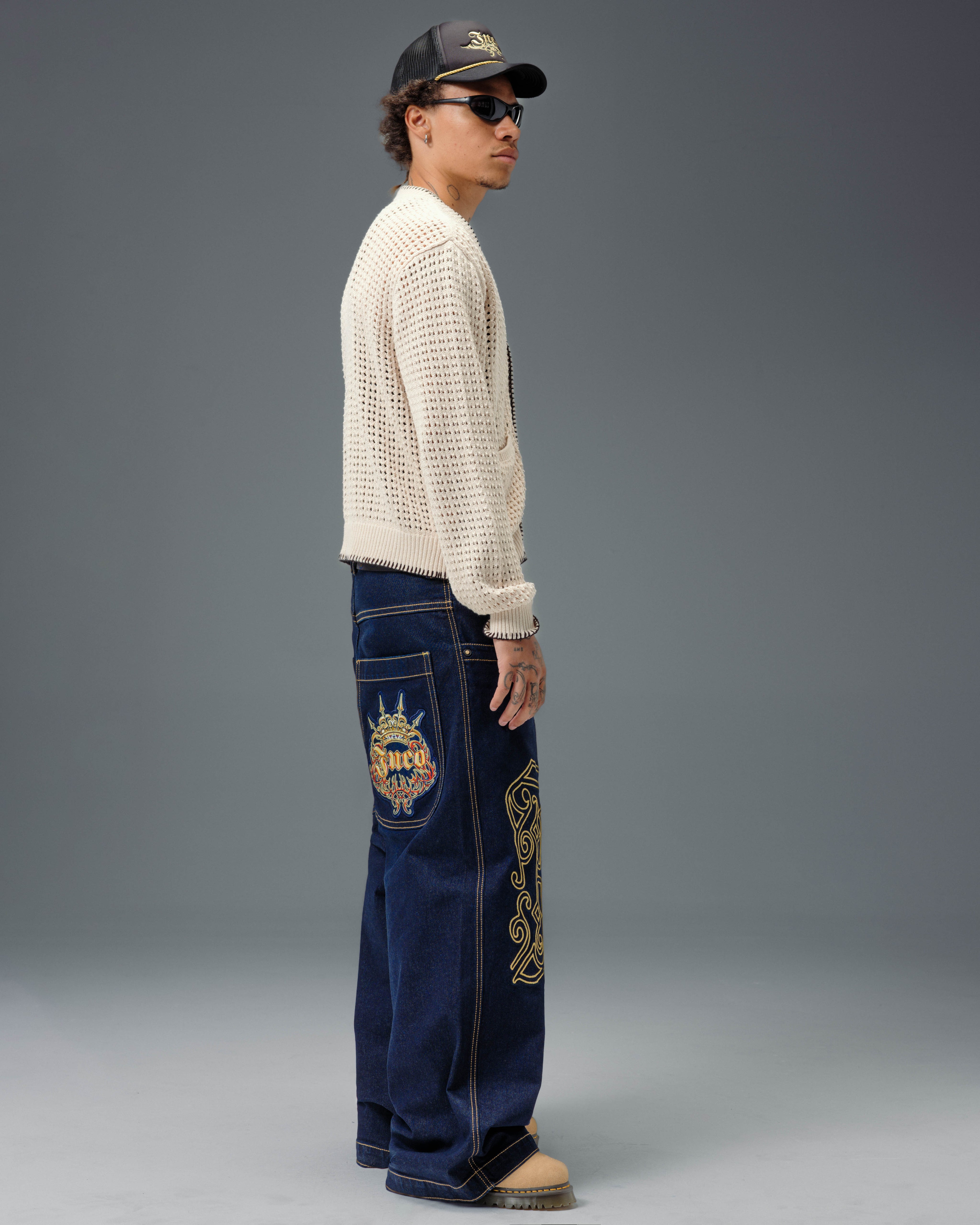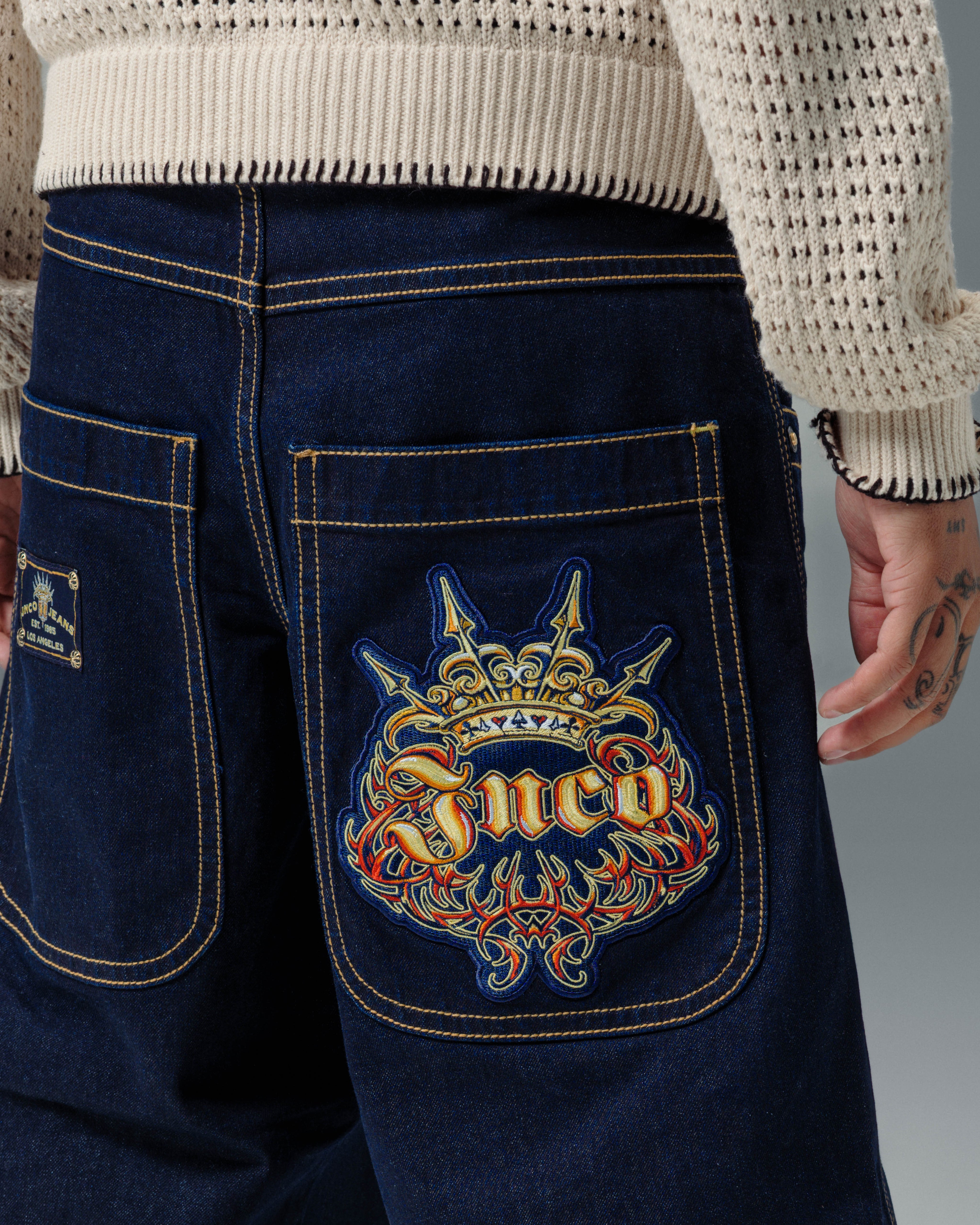 A fusion of JNCO’s Twin Cannons and Royals. Deep indigo with resin treatment, semi-rigid feel. 26" bottom opening with original contrast stitching. Features wide double topstitching, Royal embroidery patch (80,000 stitches), and exclusive “J” monogram (160,000 metallic gold stitches). Custom rivets and collectible flasher included.