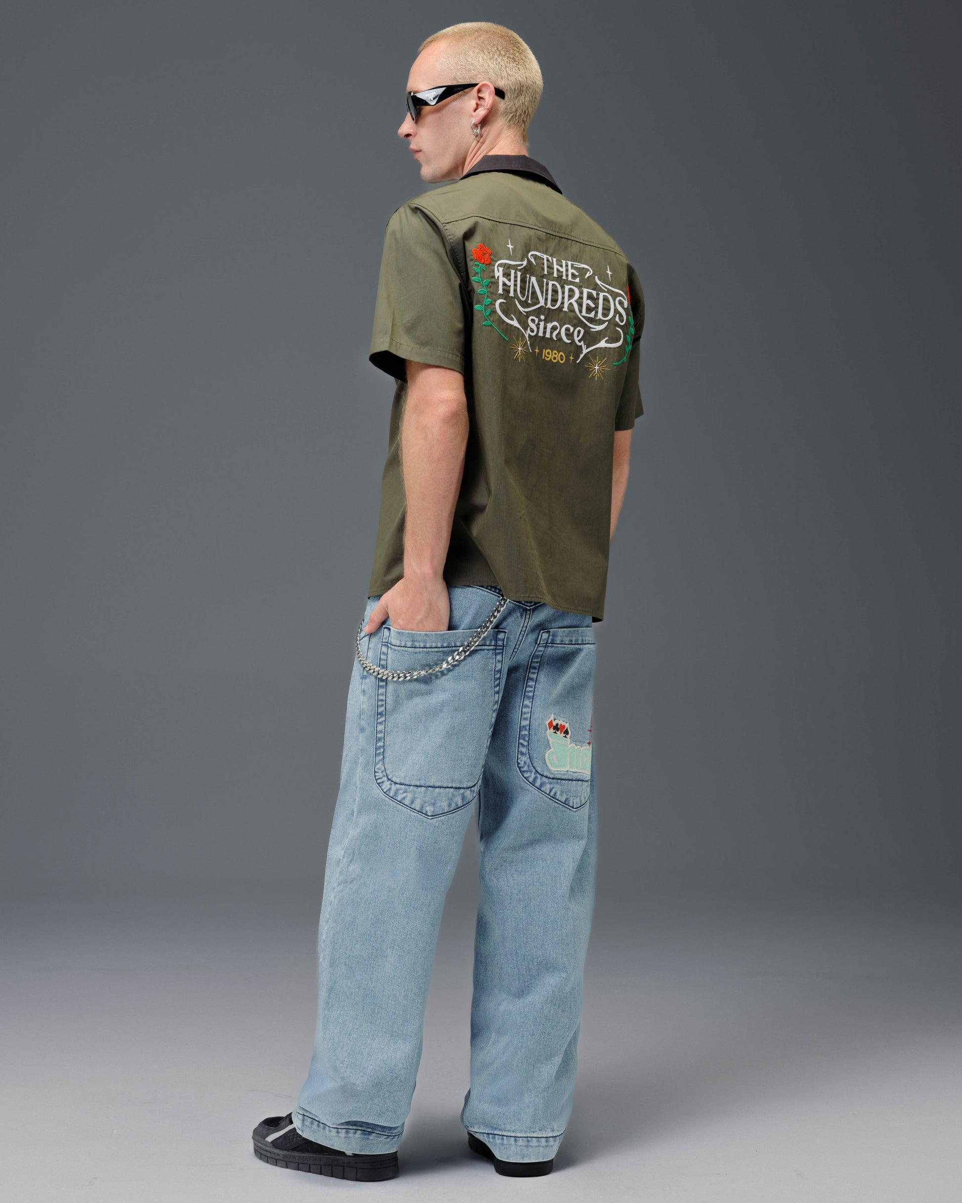 A revamped take of the original Low Down in a classic Antique Wash. 14oz 100% cotton denim with a 3x1 left-hand weave and contrast stitching. 20" bottom opening with double chain stitch detailing at the waistband and hem. Features the new JNCO Deck embroidery inspired by the four card suits, and custom buttons and rivets. Collectible new edition flasher included.