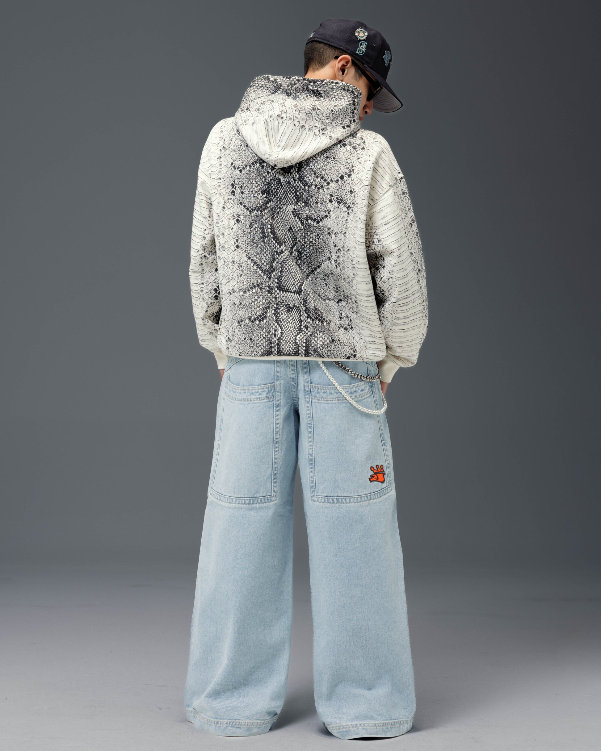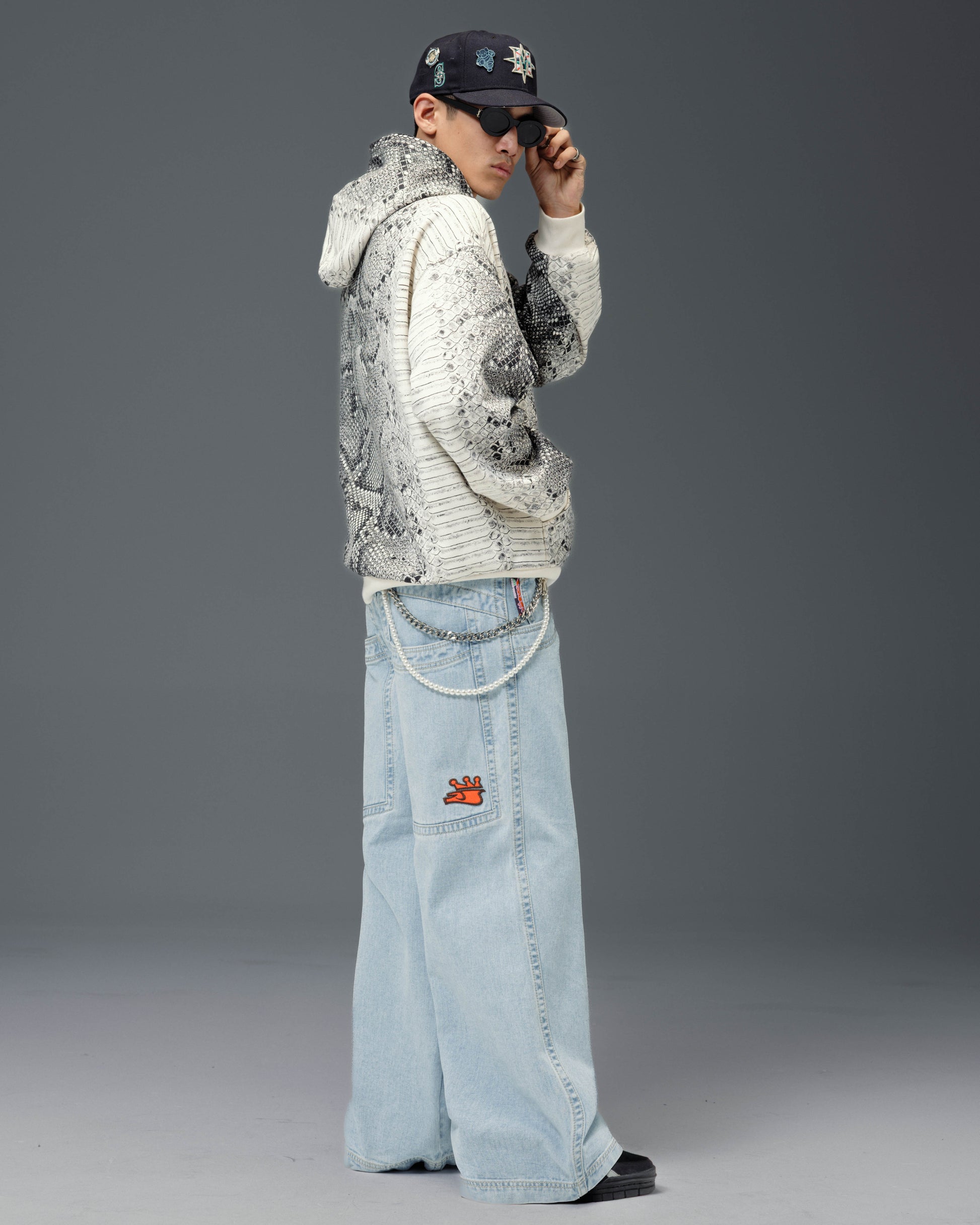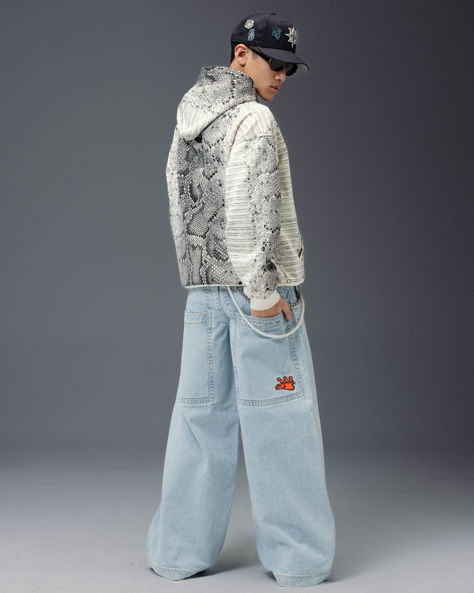 Classic 28" bottom opening in Original Vintage Wash. 14oz 100% cotton denim with heavy double contrast stitching. Features “Royal J” embroidery on back pocket and “Royal JNCO” on front leg. Includes collectible flasher. Limited Edition – limited stock.