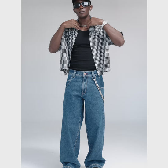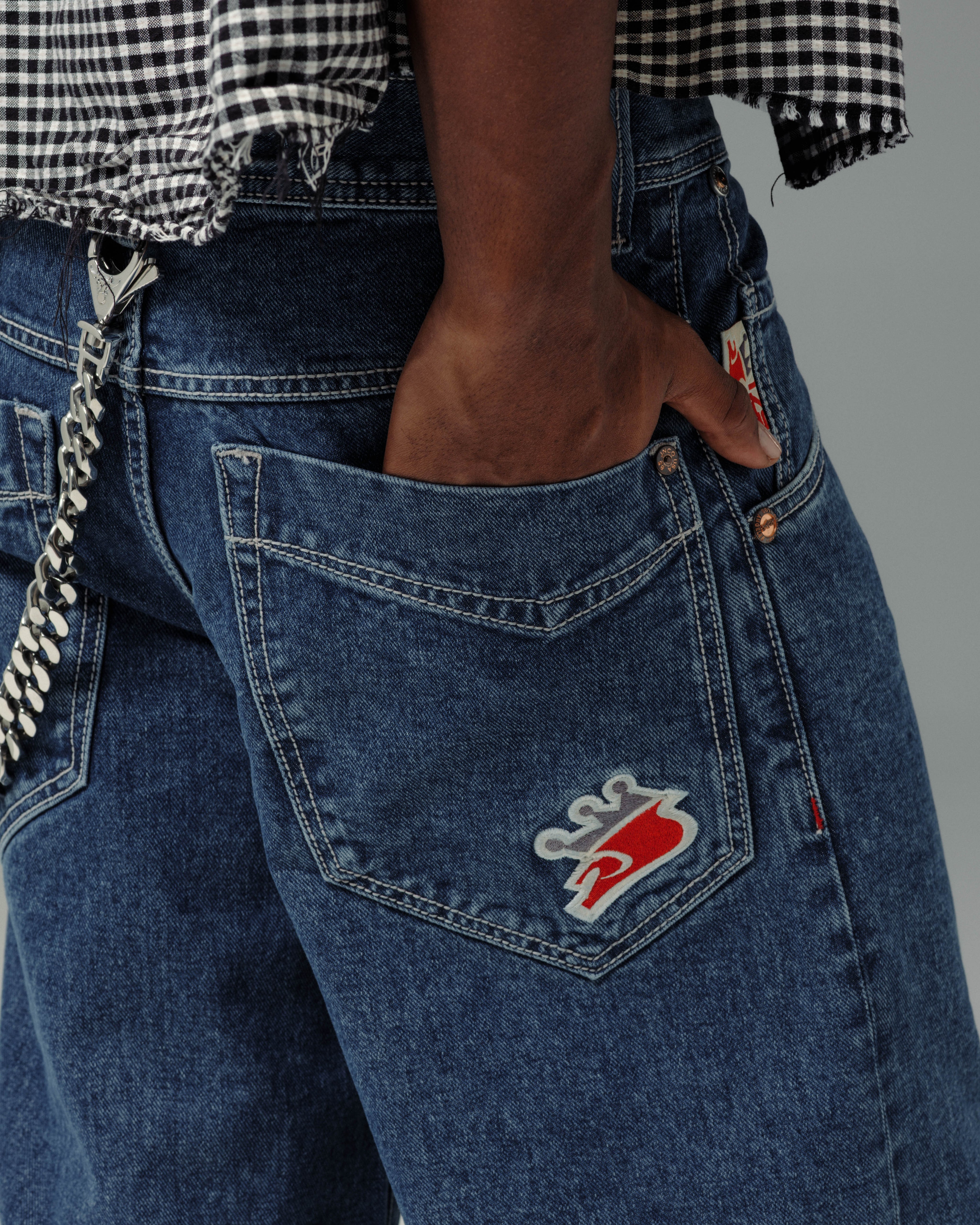 A reinvigorated take on the original Pipes in a classic Dark Stone Wash. 14oz 100% cotton denim with a 3x1 left-hand weave and contrast stitching. 23" bottom opening with angular pockets and double chain stitch details at the waistband and hem. Features the new Easy Wide Pipes “JNCO J” embroidery, custom buttons and rivets, and a collectible new edition flasher.