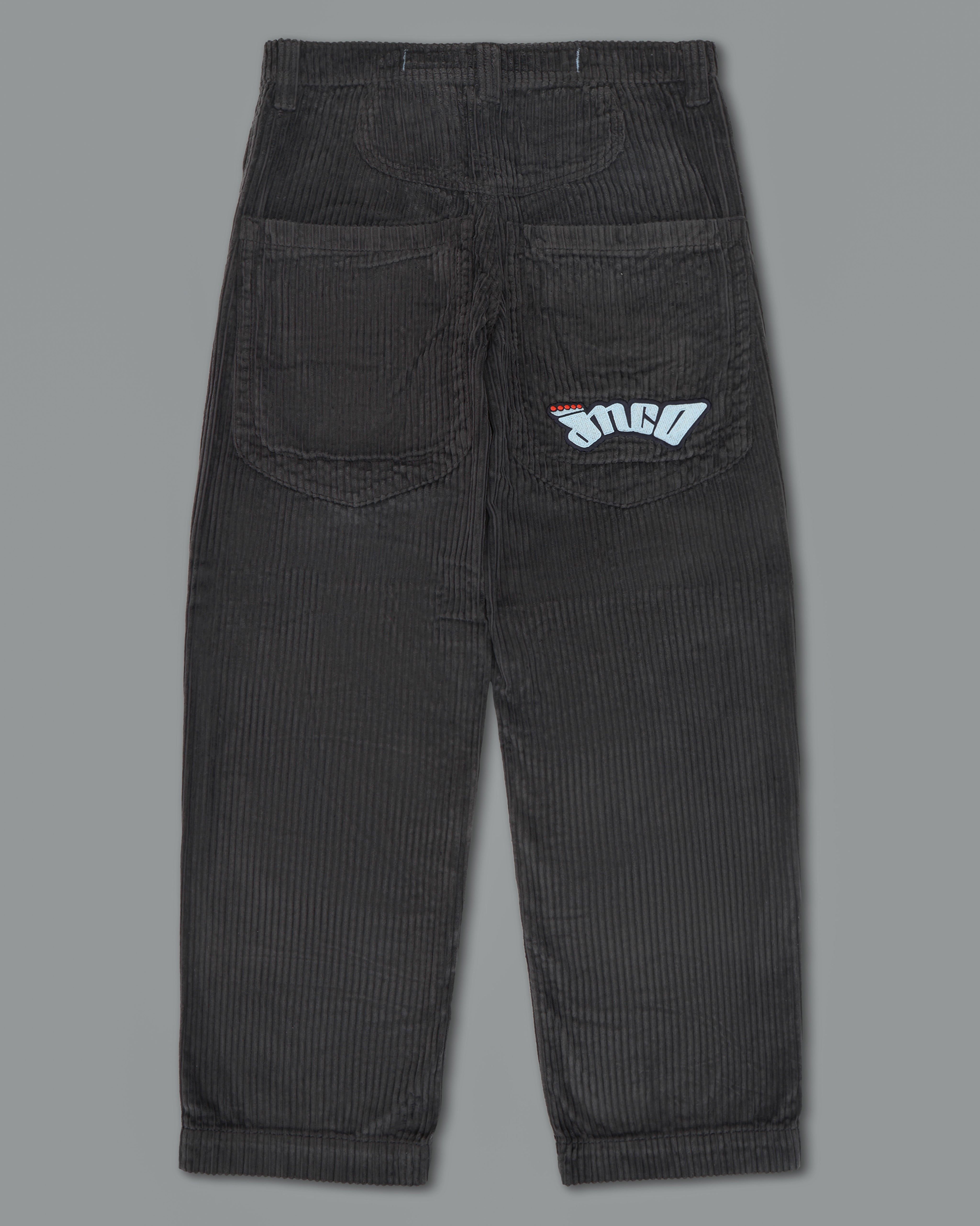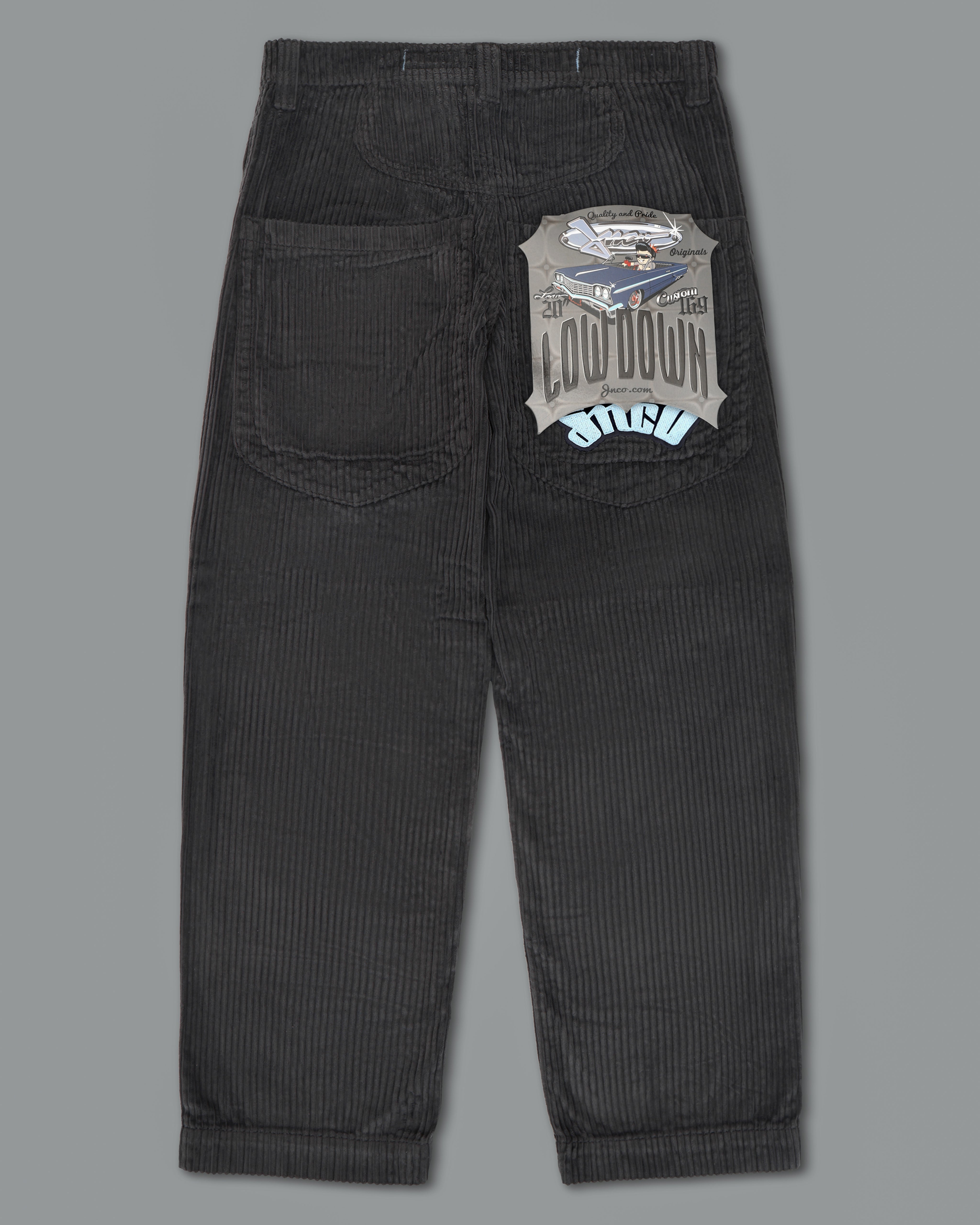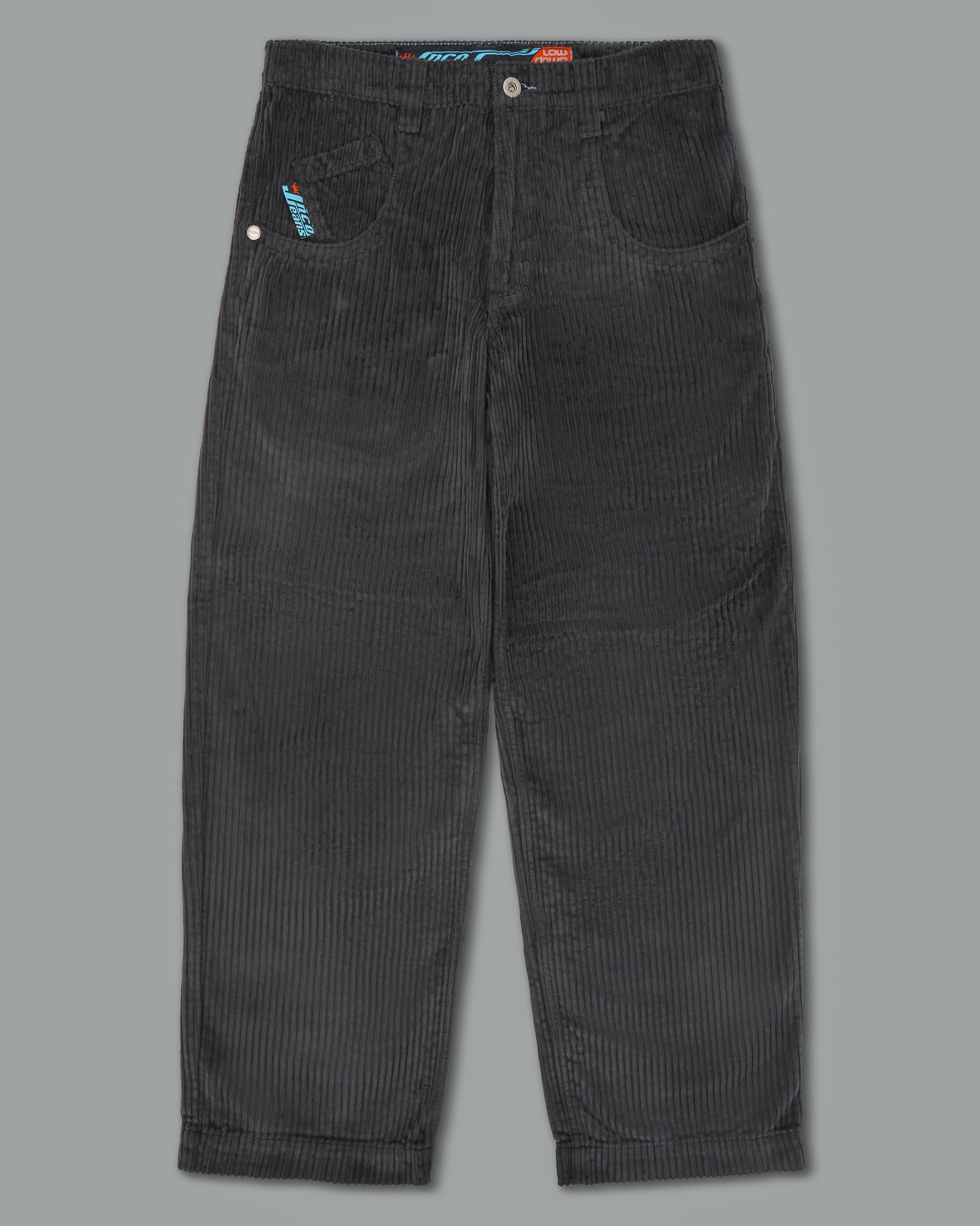 JNCO classic in heavy 4-Wale corduroy in magnet. 20" bottom opening, 12oz 100% cotton, soft finish. Heavy double stitching, original artwork, labels, and back pocket embroidery. Collectible flasher included.