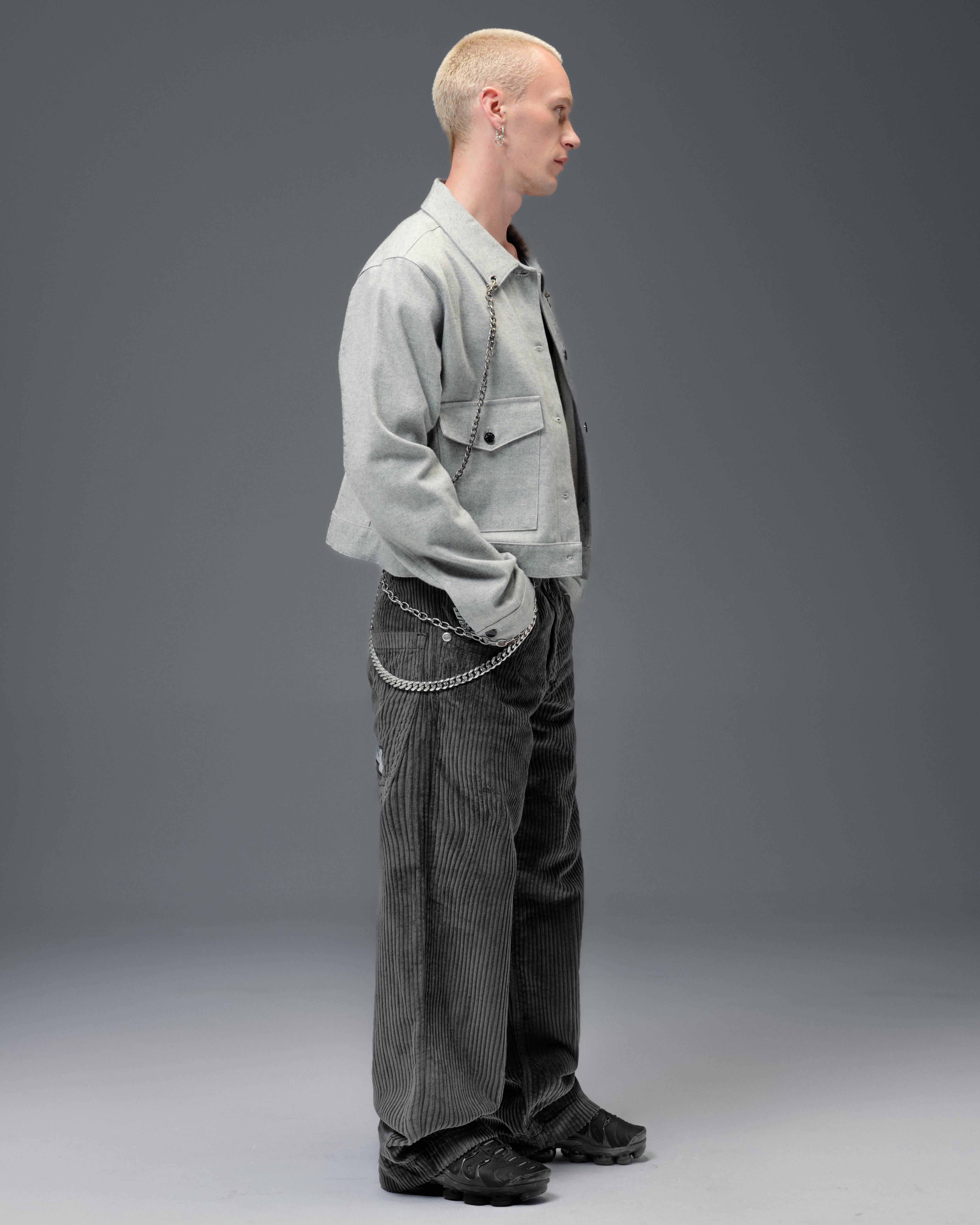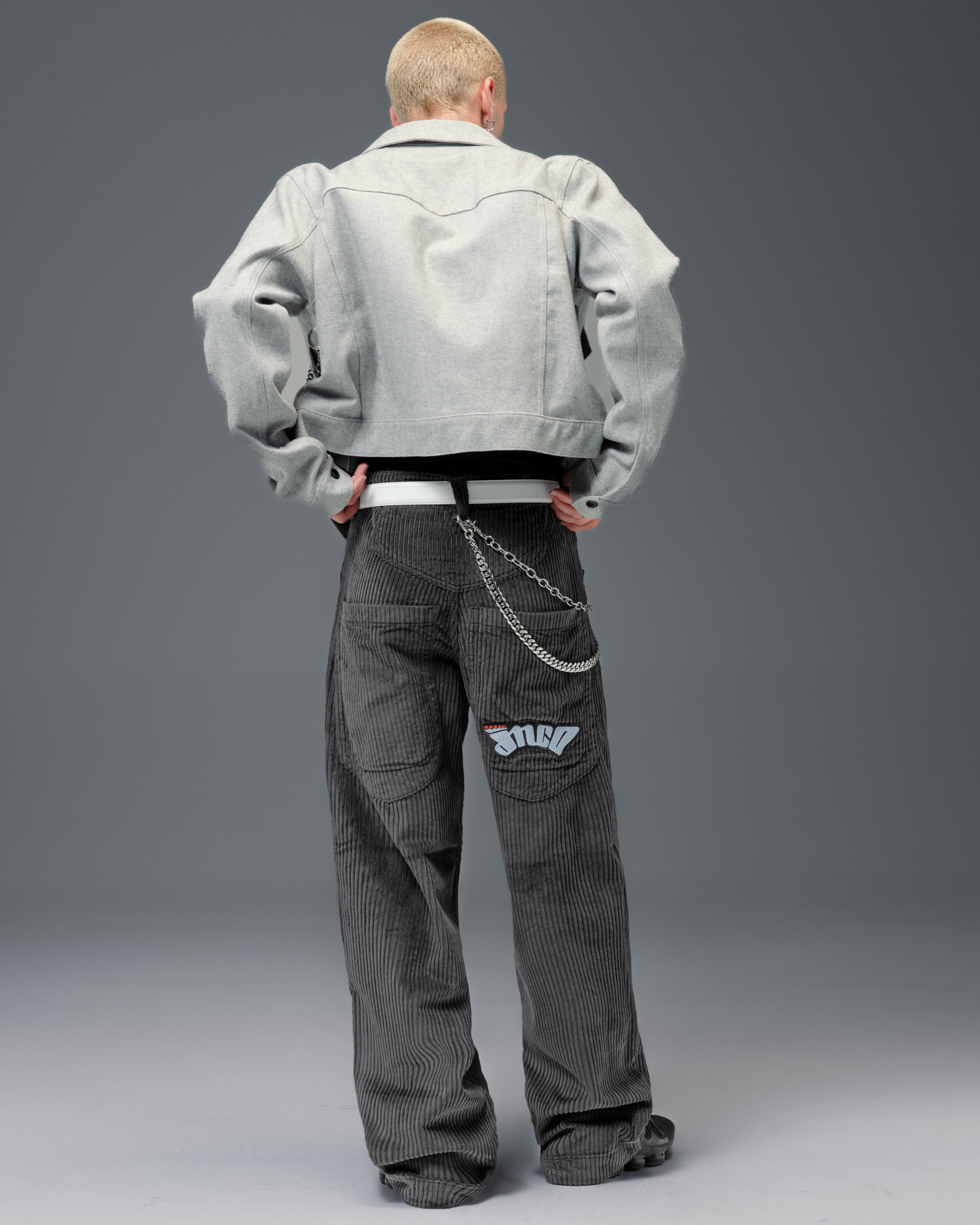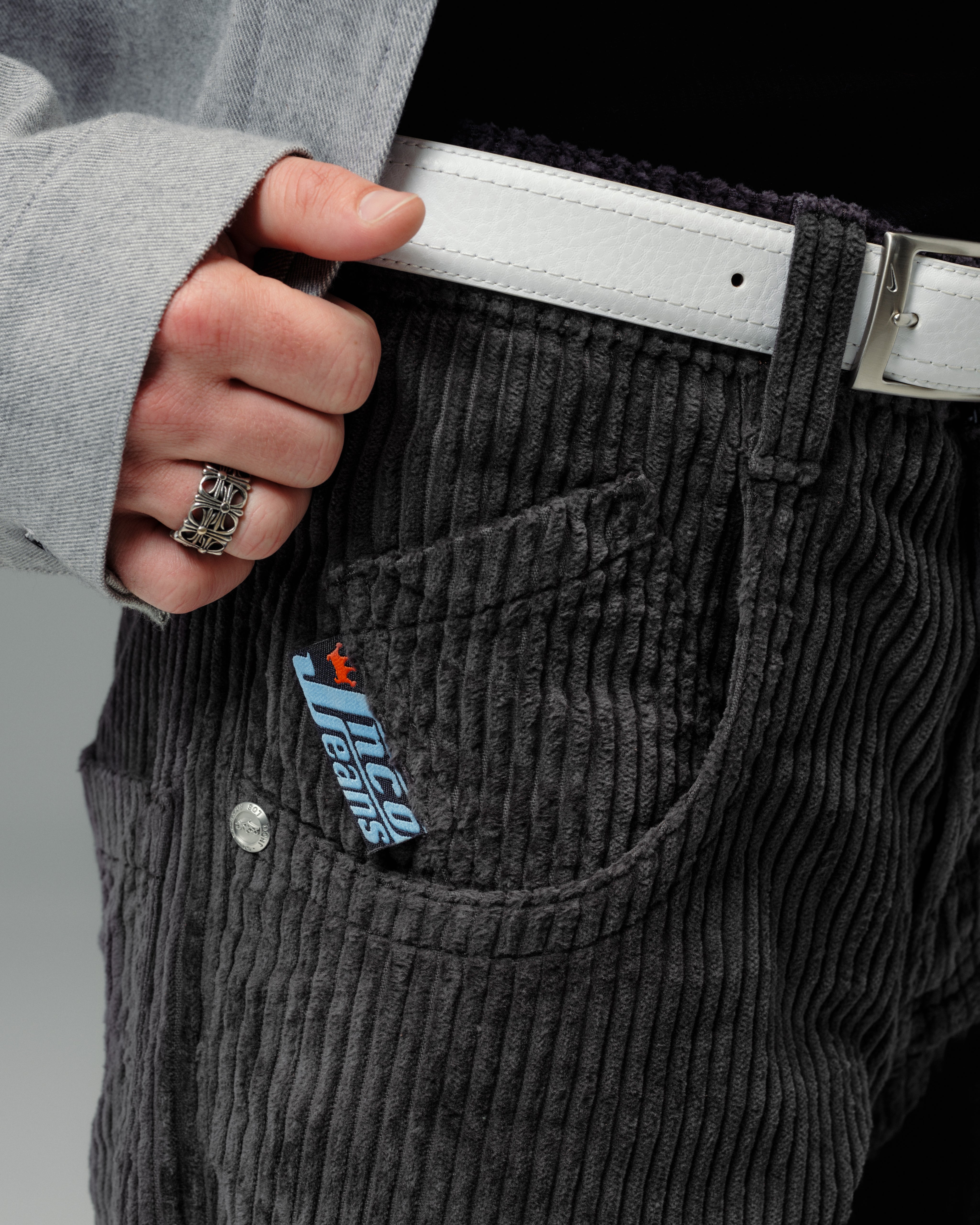 JNCO classic in heavy 4-Wale corduroy in magnet. 20" bottom opening, 12oz 100% cotton, soft finish. Heavy double stitching, original artwork, labels, and back pocket embroidery. Collectible flasher included.