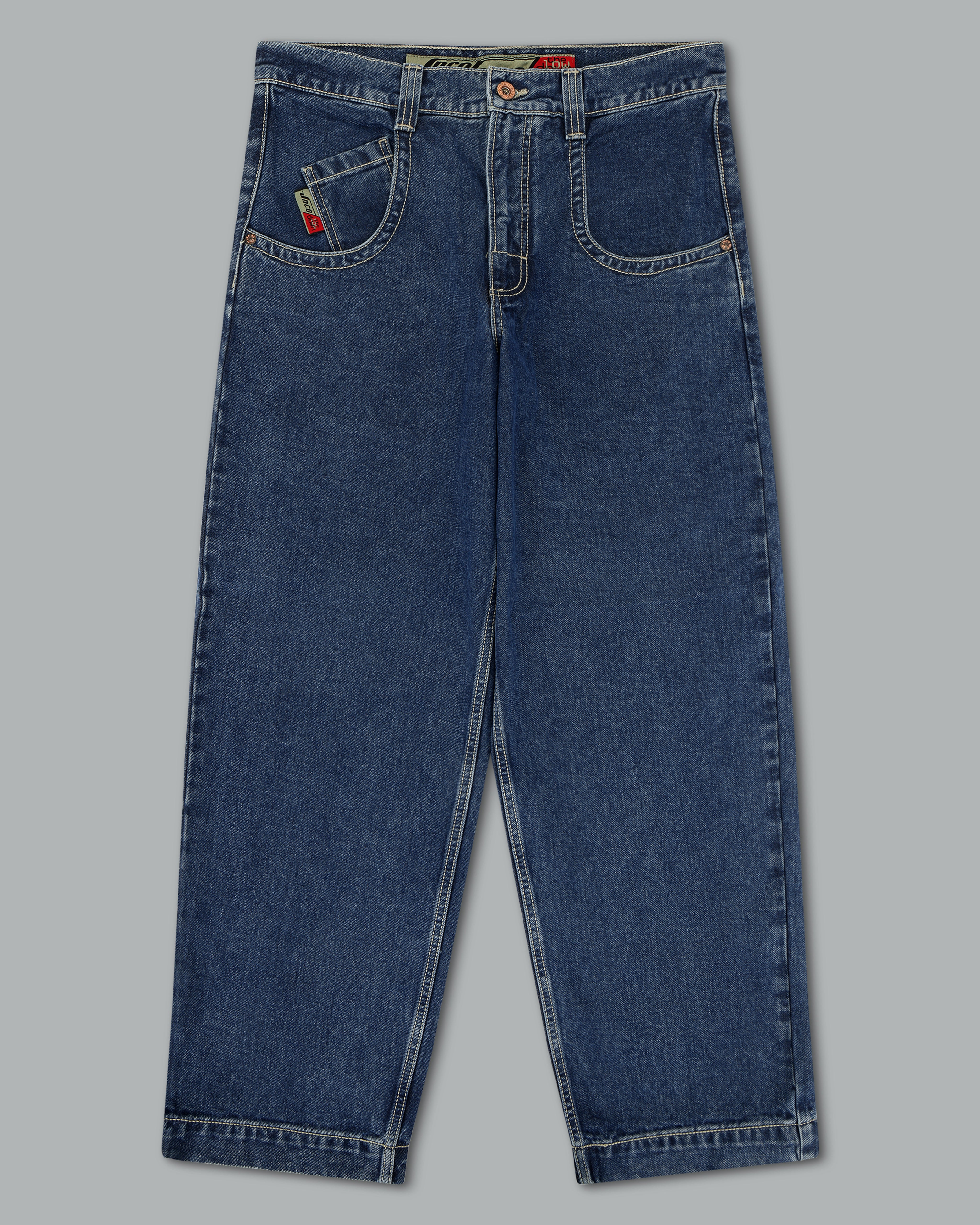 JNCO classic in Original Dark Stone Wash. 20" bottom opening with original artwork, labels, and back right pocket embroidery. 14oz 100% cotton denim with contrast stitching. Collectible flasher included.