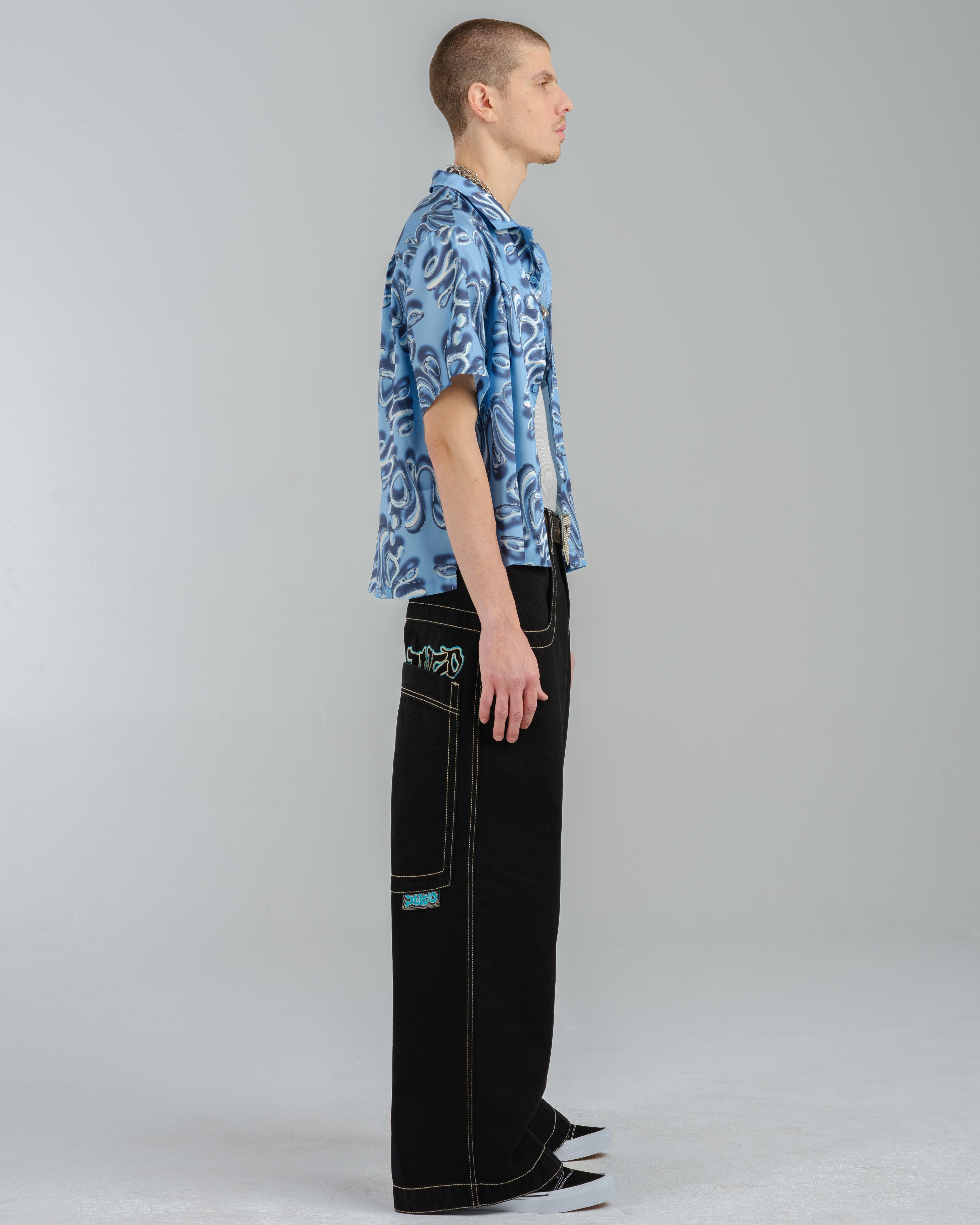 Collector’s item from the original JNCO “Roots” collection. Jet Black denim, 26" bottom opening. 13oz 100% cotton rope-dyed with luxe starch wax finish. Heavy contrast stitching with dual JNCO logos over back pockets and metallic “tagger” embroidery. Original labels and collectible metallic flasher. Limited Edition – very limited stock.