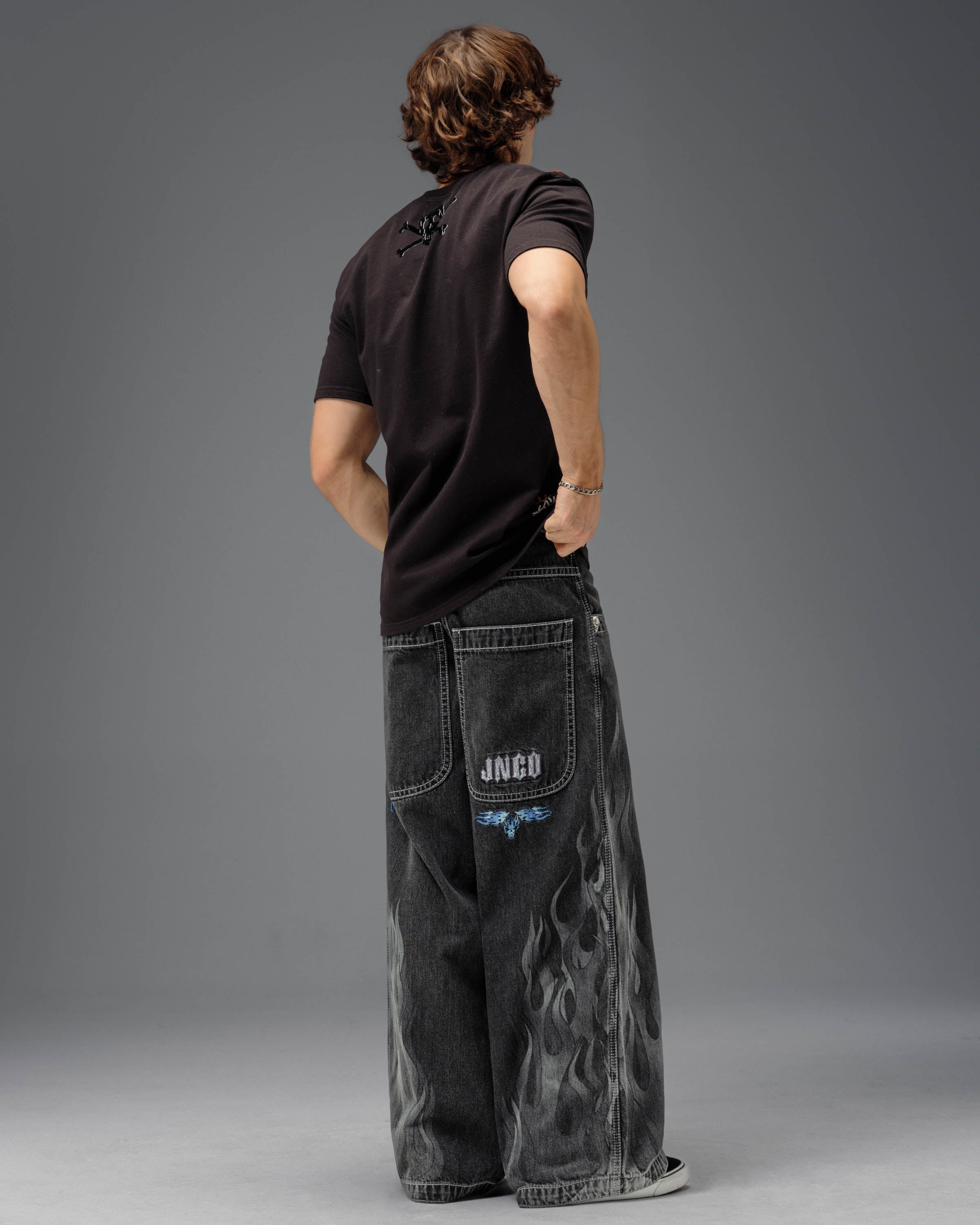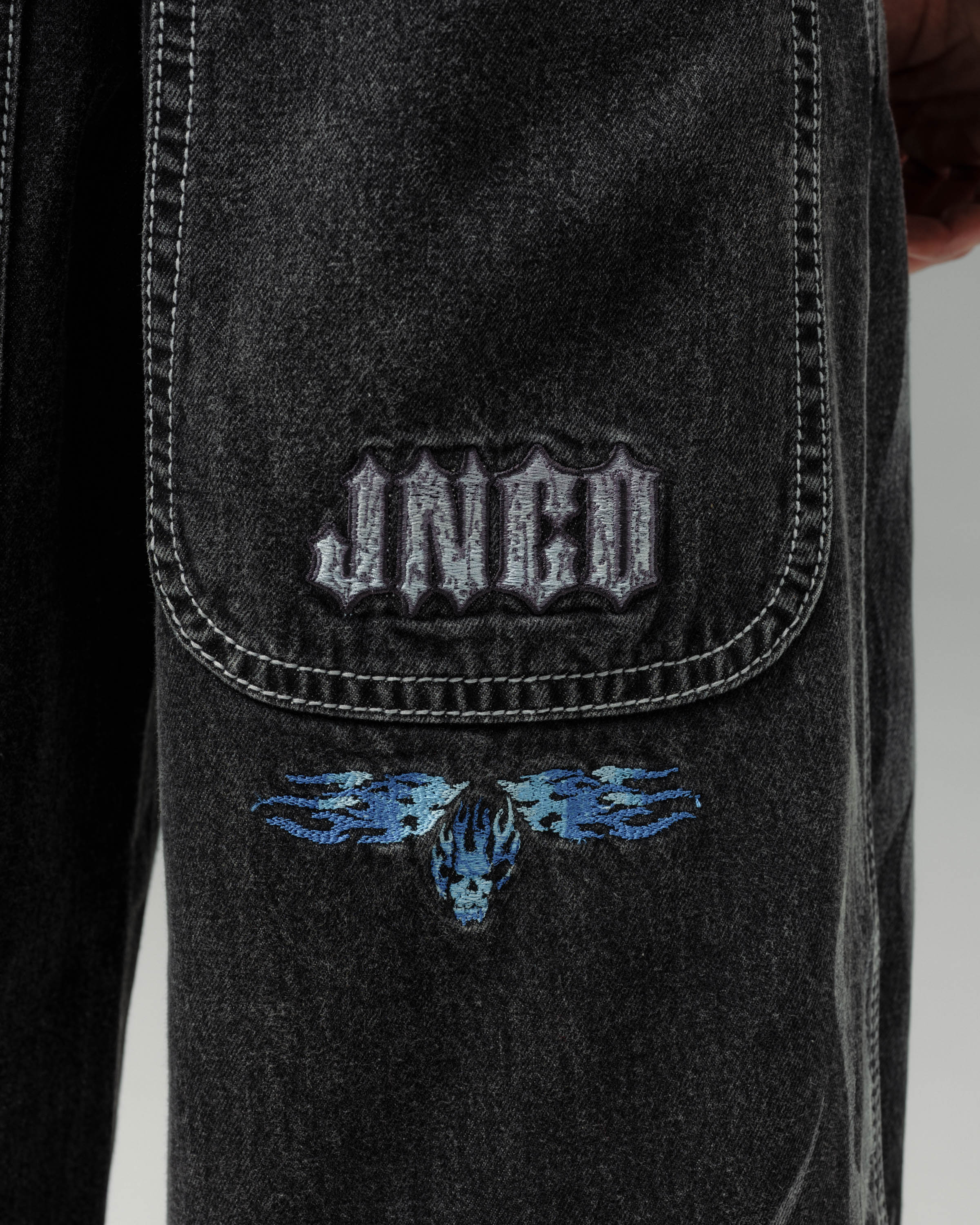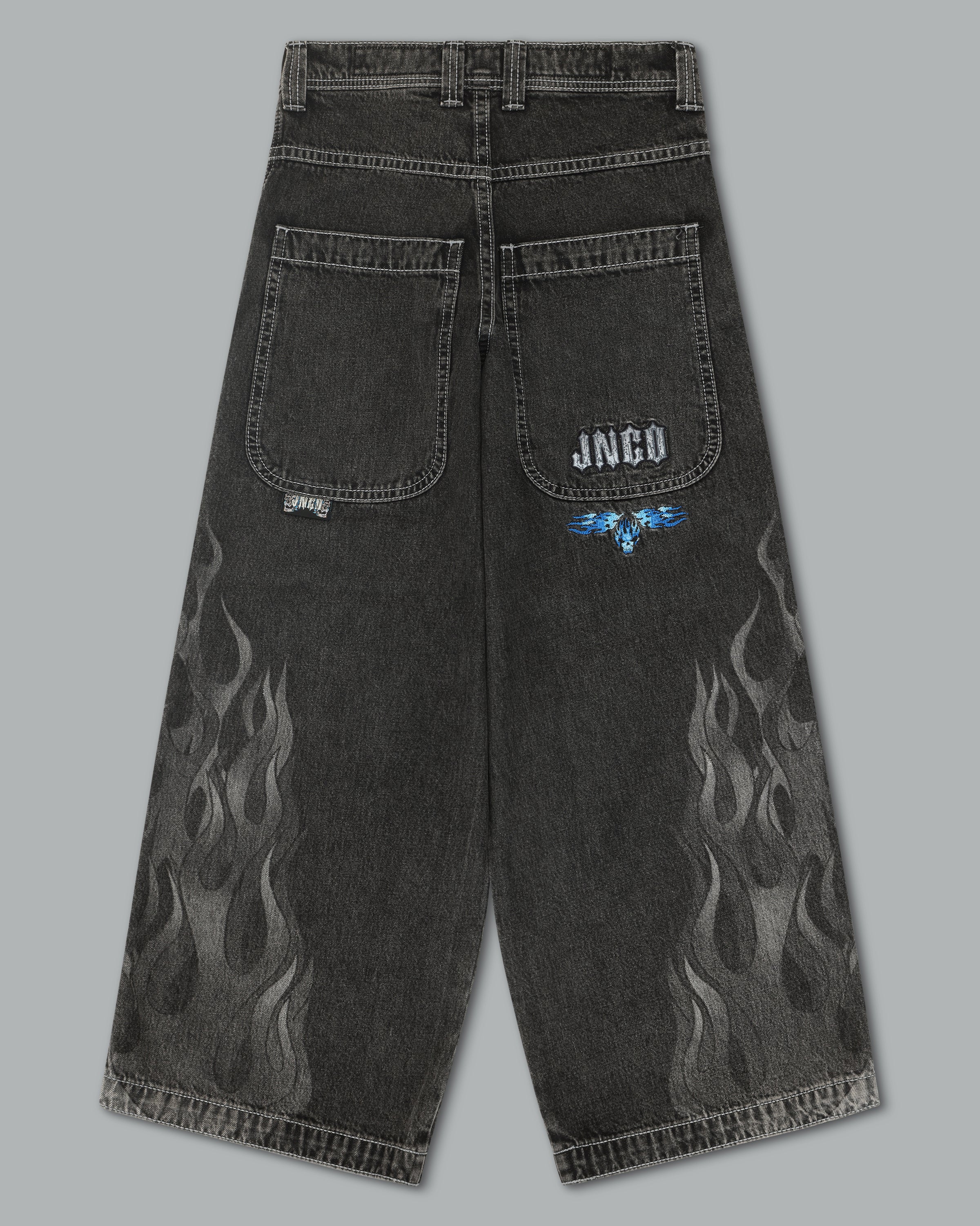 From the famous Tribal Collection. 13.5oz 100% cotton rope-dyed with a luxe starch wax finish in distressed vintage black. 26” bottom opening with contrast stitching and a classic oversized fit. Features original Tribal labels, tonal tribal flame artwork laser printed down both legs, skull and flame JNCO embroideries, and custom skull and jewel hardware with an antique finish and quartz stones. Collectible flasher included.