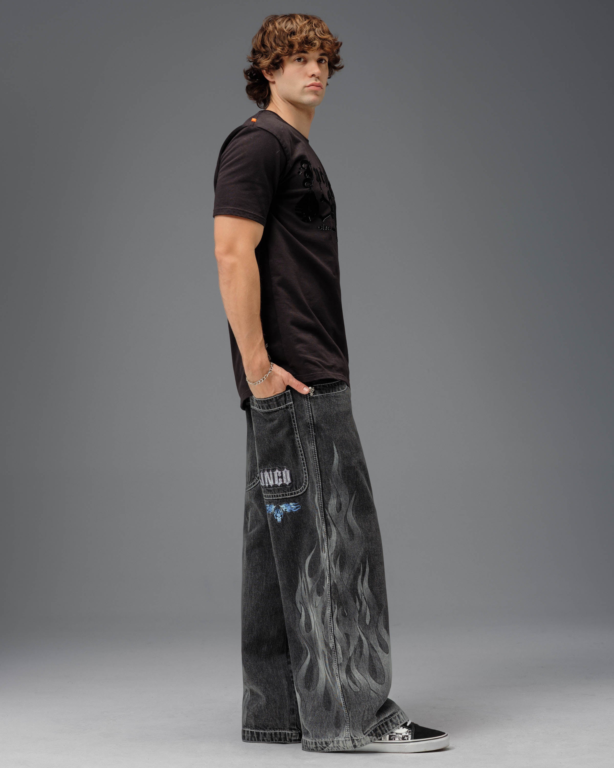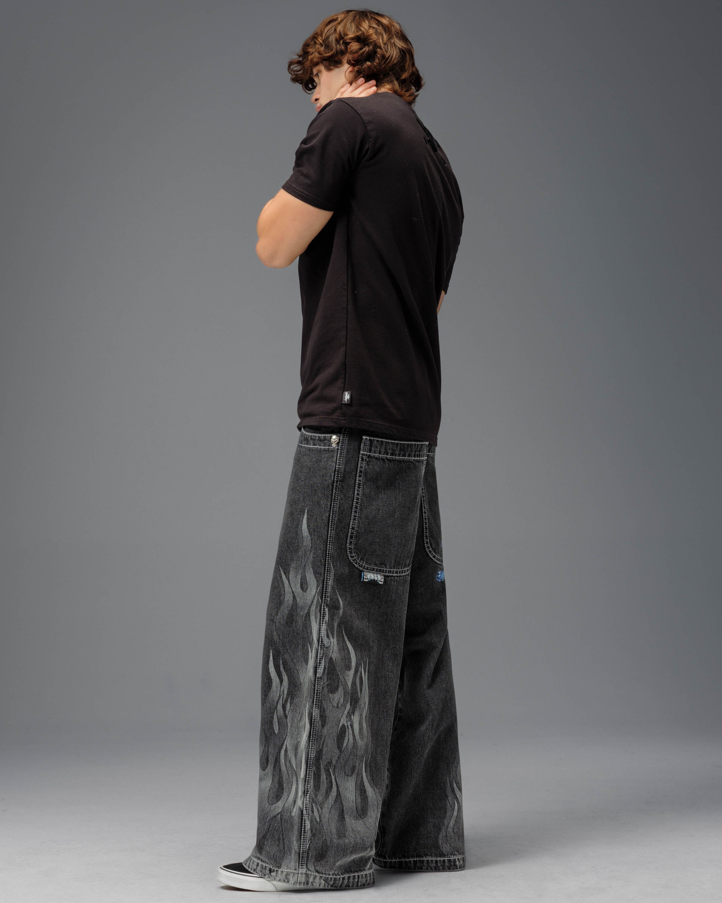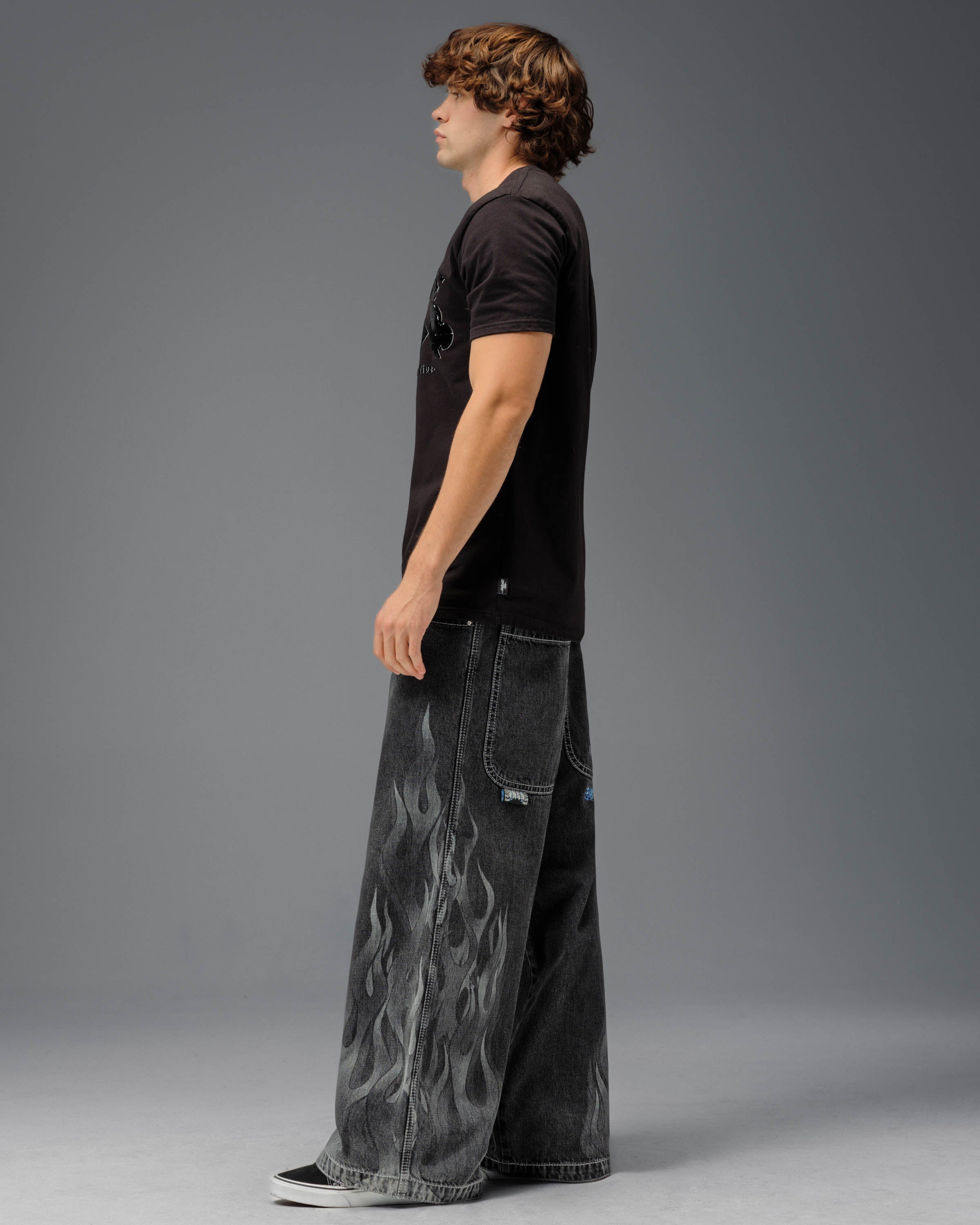 From the famous Tribal Collection. 13.5oz 100% cotton rope-dyed with a luxe starch wax finish in distressed vintage black. 26” bottom opening with contrast stitching and a classic oversized fit. Features original Tribal labels, tonal tribal flame artwork laser printed down both legs, skull and flame JNCO embroideries, and custom skull and jewel hardware with an antique finish and quartz stones. Collectible flasher included.