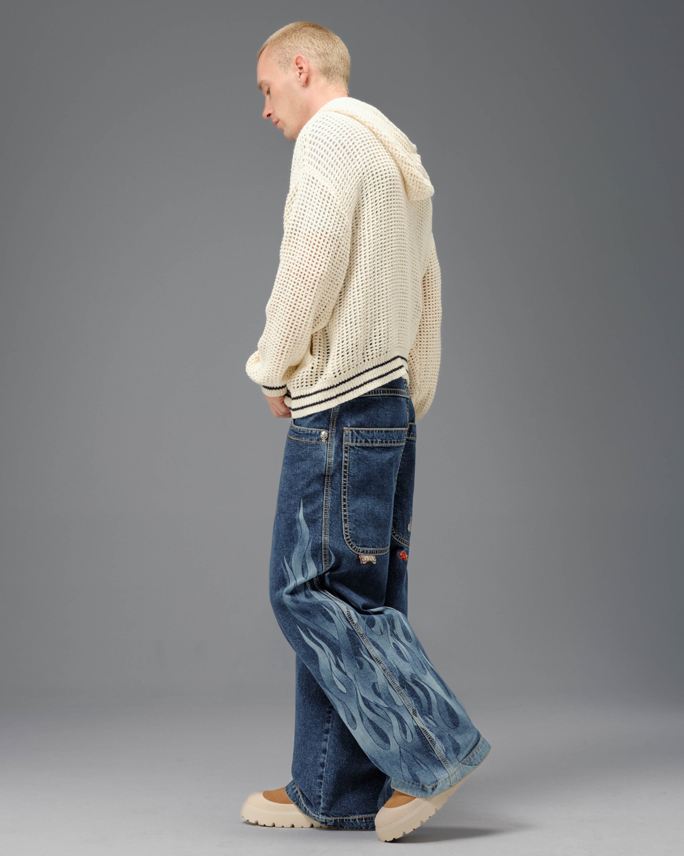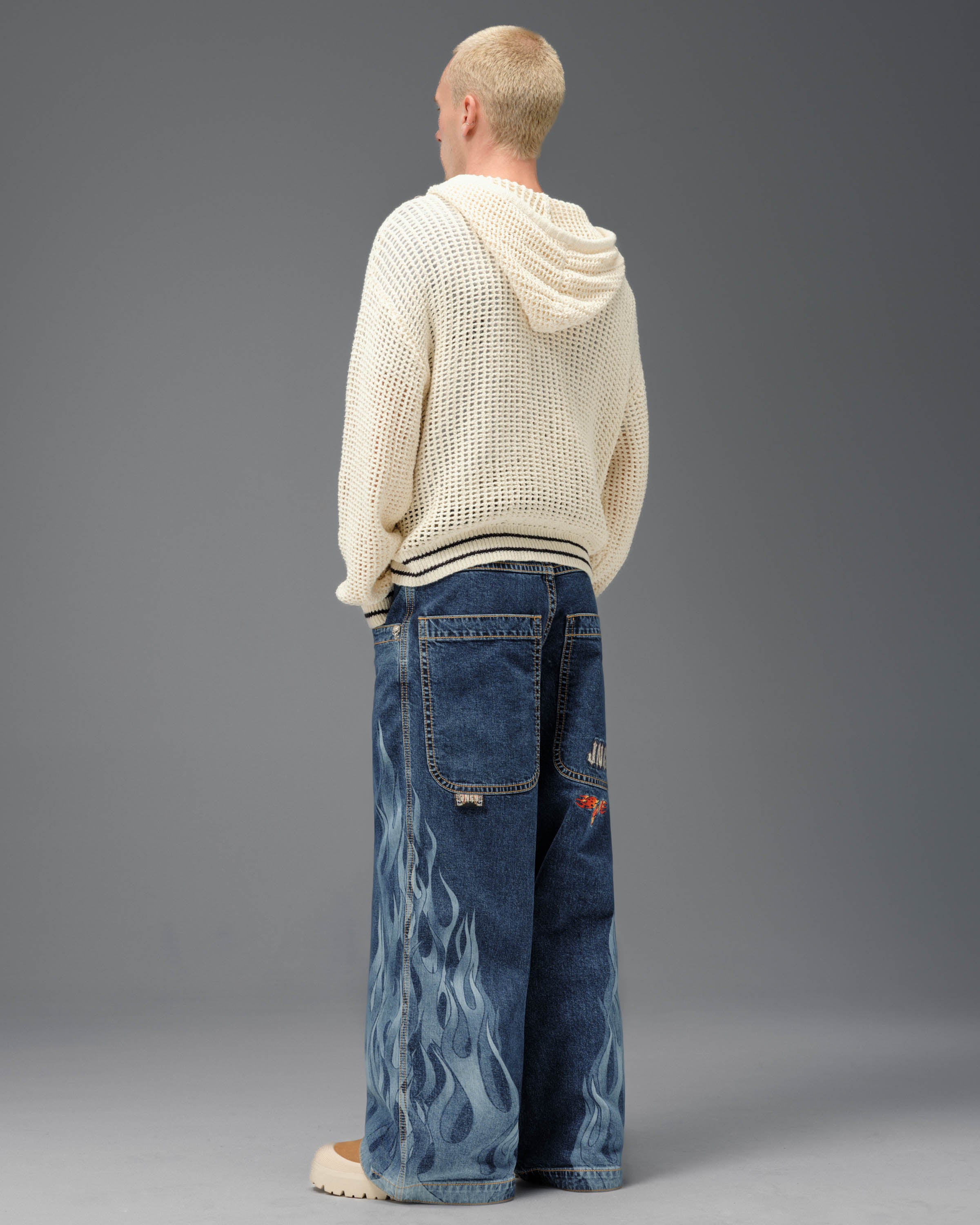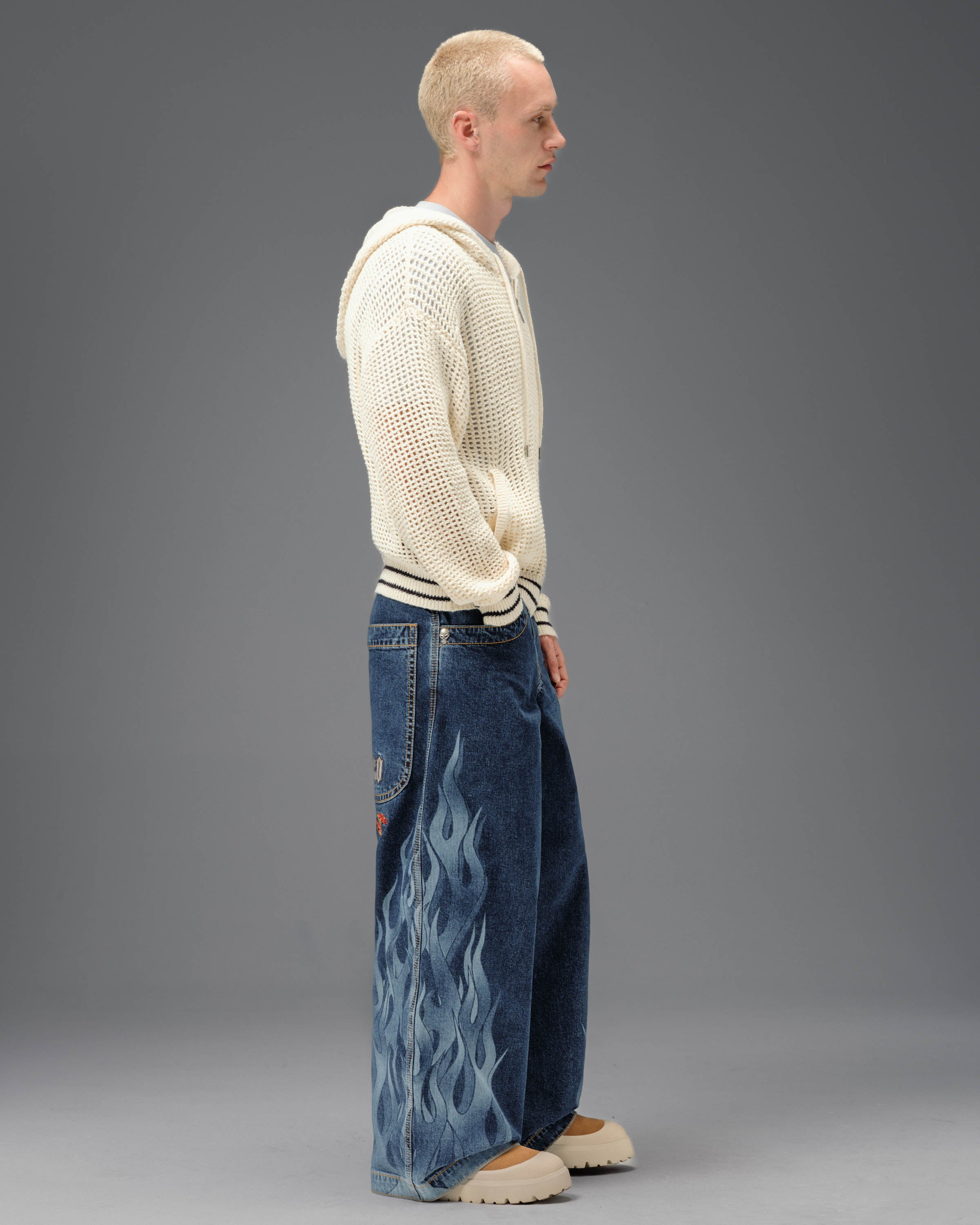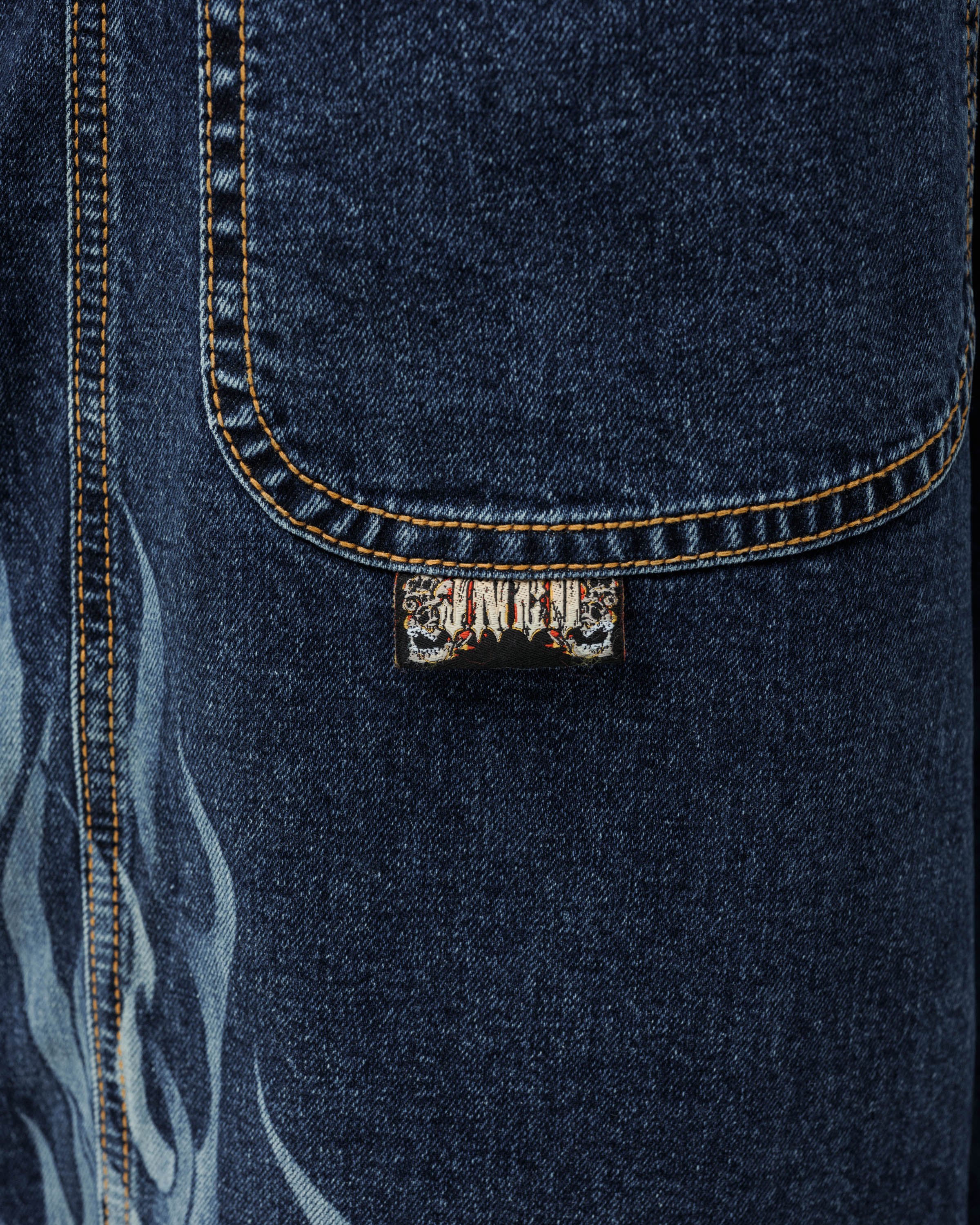 From the famous Tribal Collection. 13oz ring-spun denim in original Dark Stone Wash. 26” bottom opening with contrast stitching and a classic oversized fit. Features original Tribal labels, tonal tribal flame artwork laser printed down both legs, skull and flame JNCO embroideries, and custom skull and jewel hardware with an antique finish and quartz stones. Collectible flasher included.