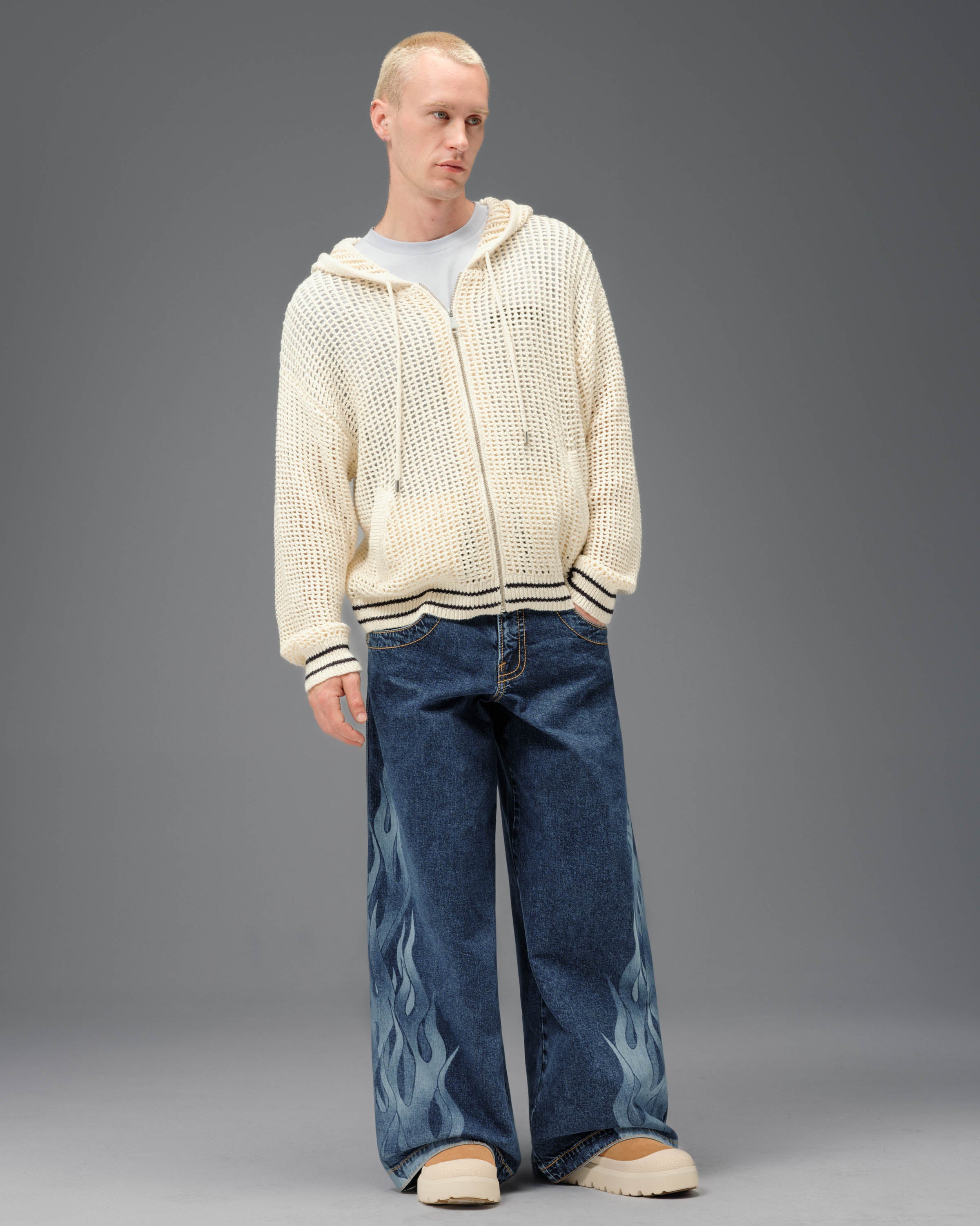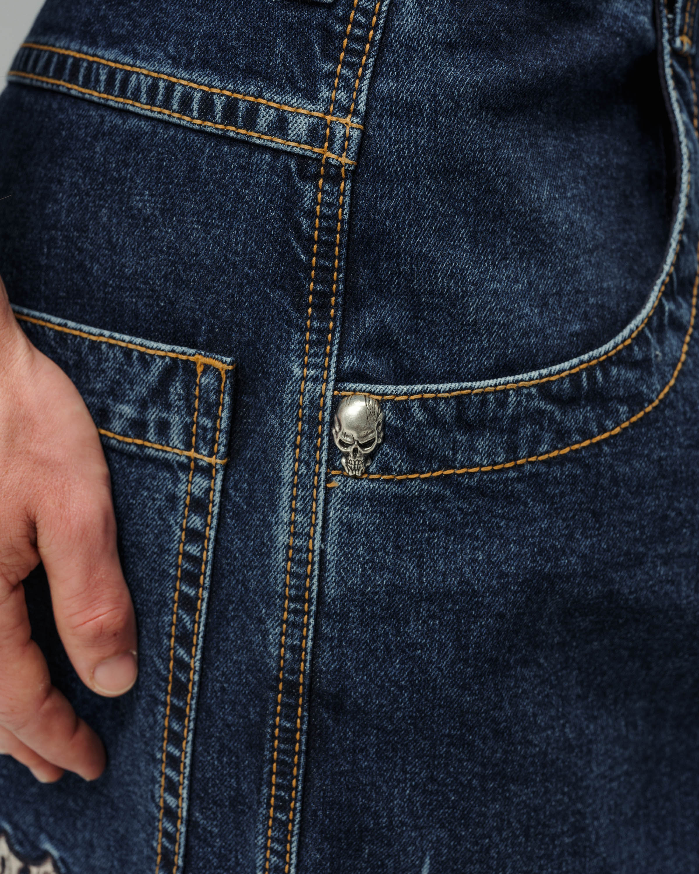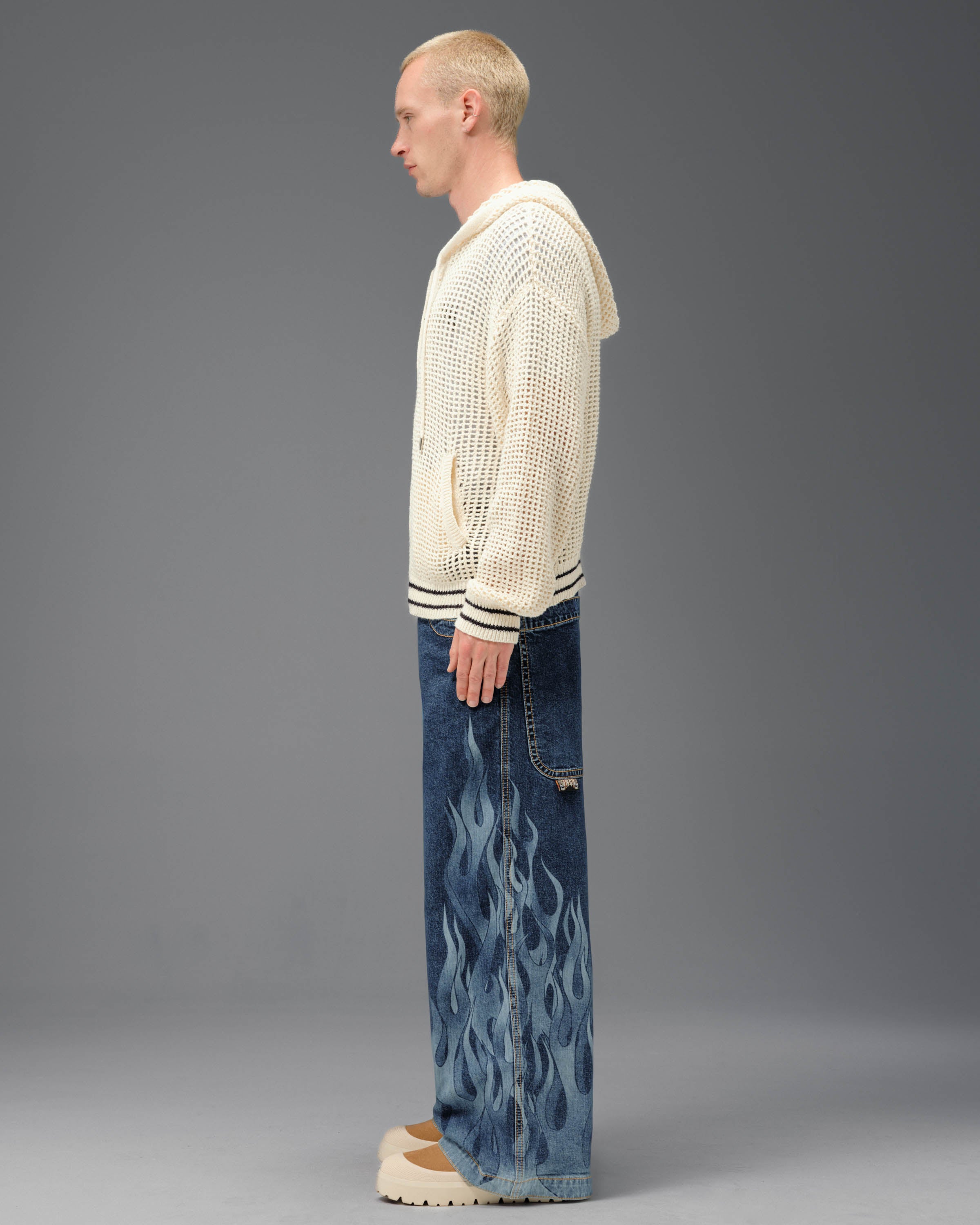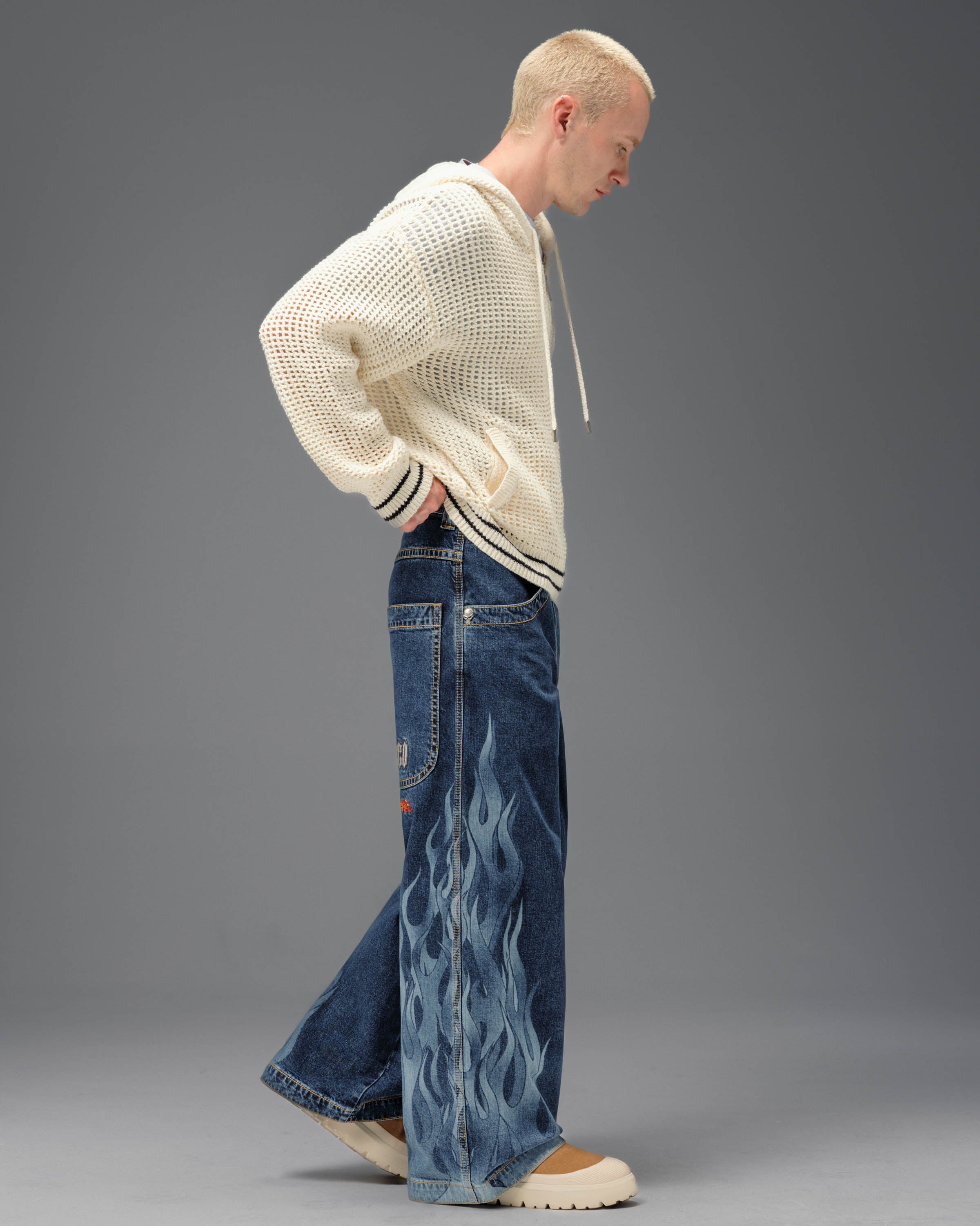 From the famous Tribal Collection. 13oz ring-spun denim in original Dark Stone Wash. 26” bottom opening with contrast stitching and a classic oversized fit. Features original Tribal labels, tonal tribal flame artwork laser printed down both legs, skull and flame JNCO embroideries, and custom skull and jewel hardware with an antique finish and quartz stones. Collectible flasher included.