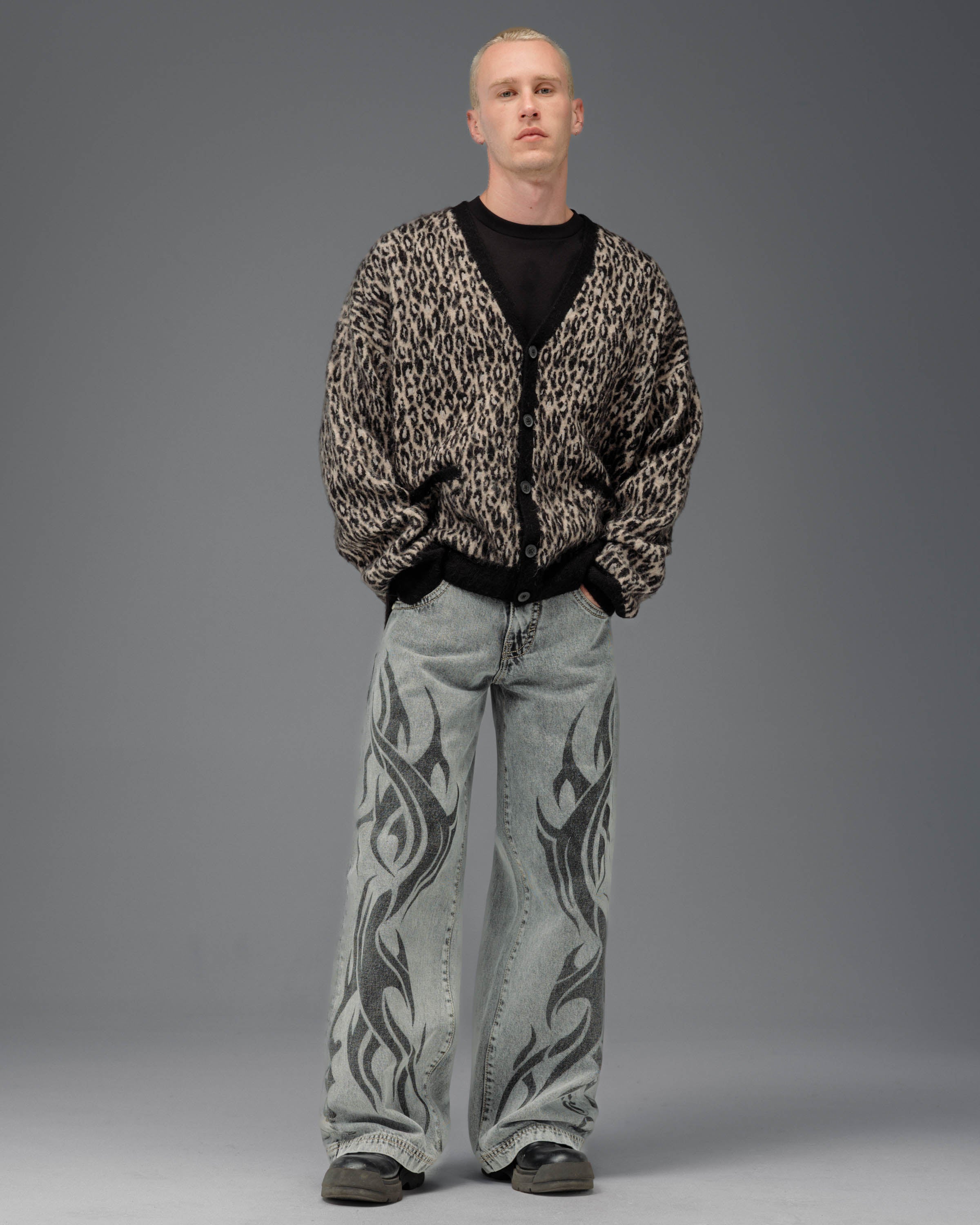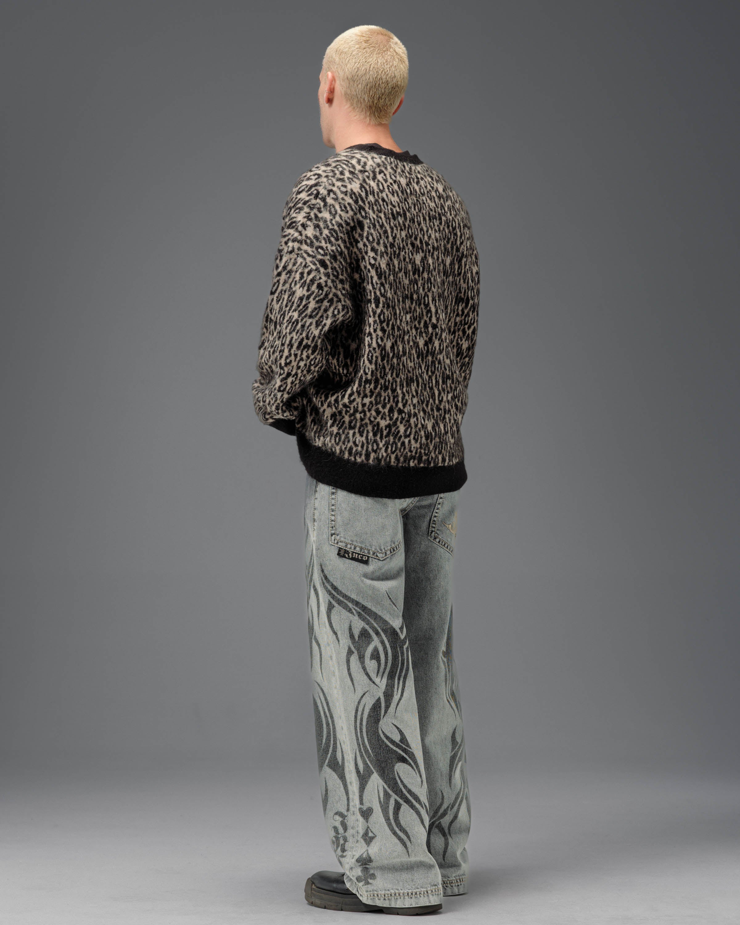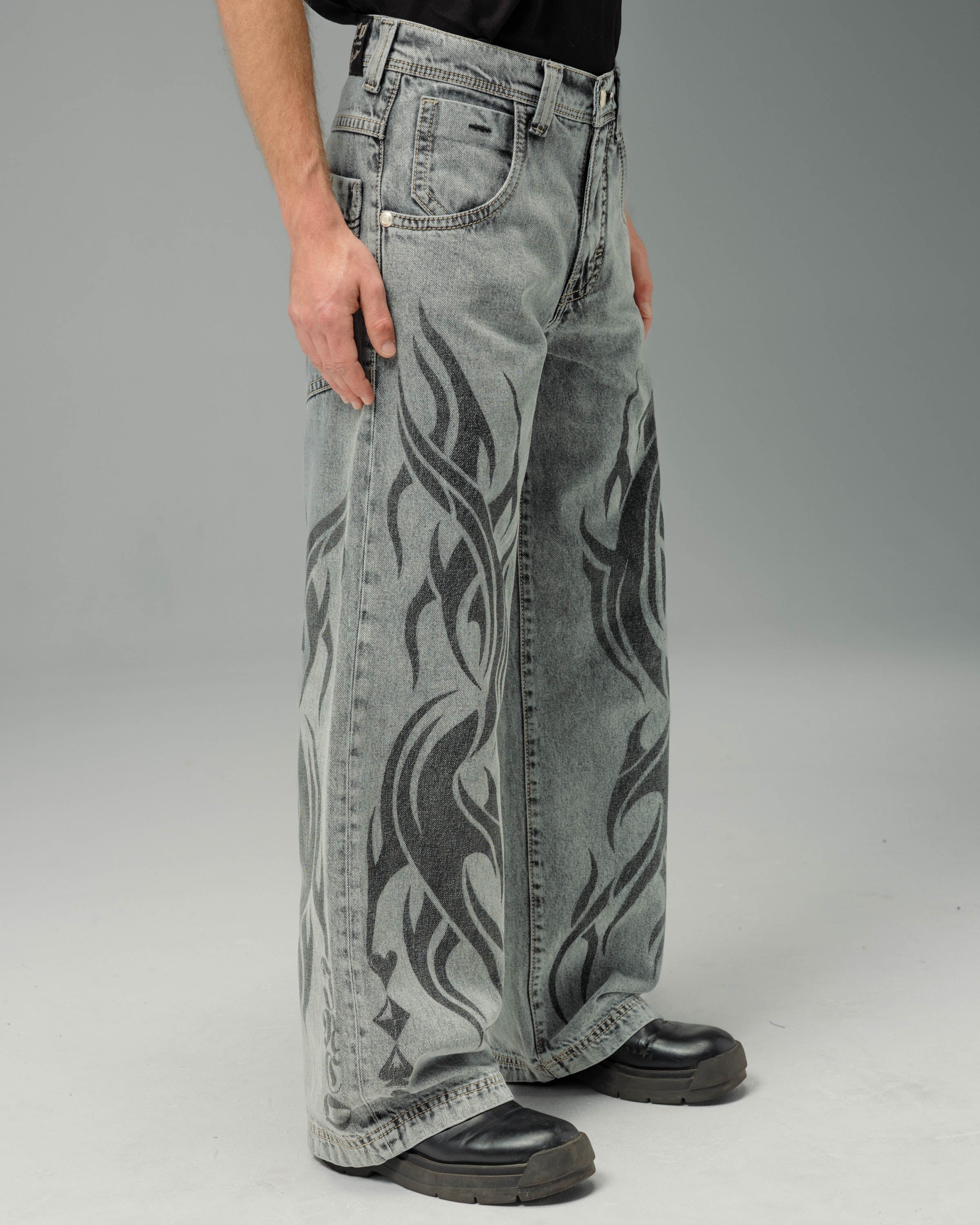 From the famous Tribal Collection. 13oz 100% cotton rope-dyed with a luxe starch wax finish and vintage “moonlight” wash. 23" bottom opening with contrast stitching and a wide-leg fit. Features tribal flame artwork printed down both legs, original Celtic-inspired tribal embroidery on the back pocket in pale white gold metallic thread, and the signature four-suit rivets. Collectible flasher included.