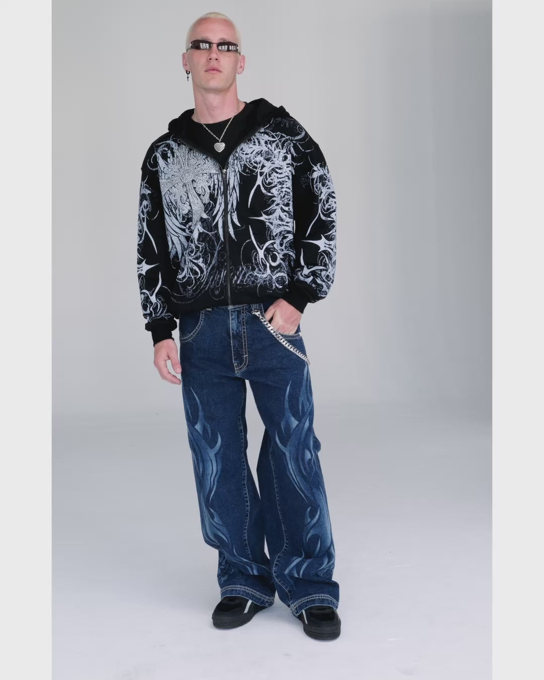 From the famous Tribal Collection. 13oz ring-spun denim in a Dark Stone wash with a deep indigo tone and a structured, smooth silhouette. 23" bottom opening with contrast stitching and a wide-leg fit. Features laser-etched tribal flame artwork down both legs, original Celtic-inspired tribal embroidery on the back pocket in palladium metallic thread, and the signature four-suit rivets. Collectible flasher included.