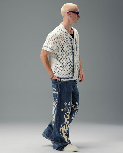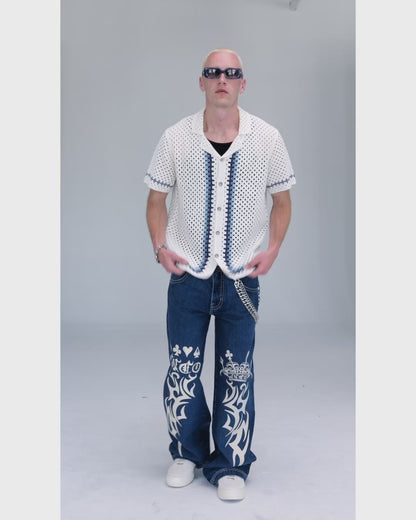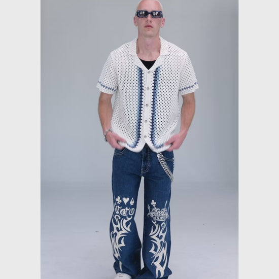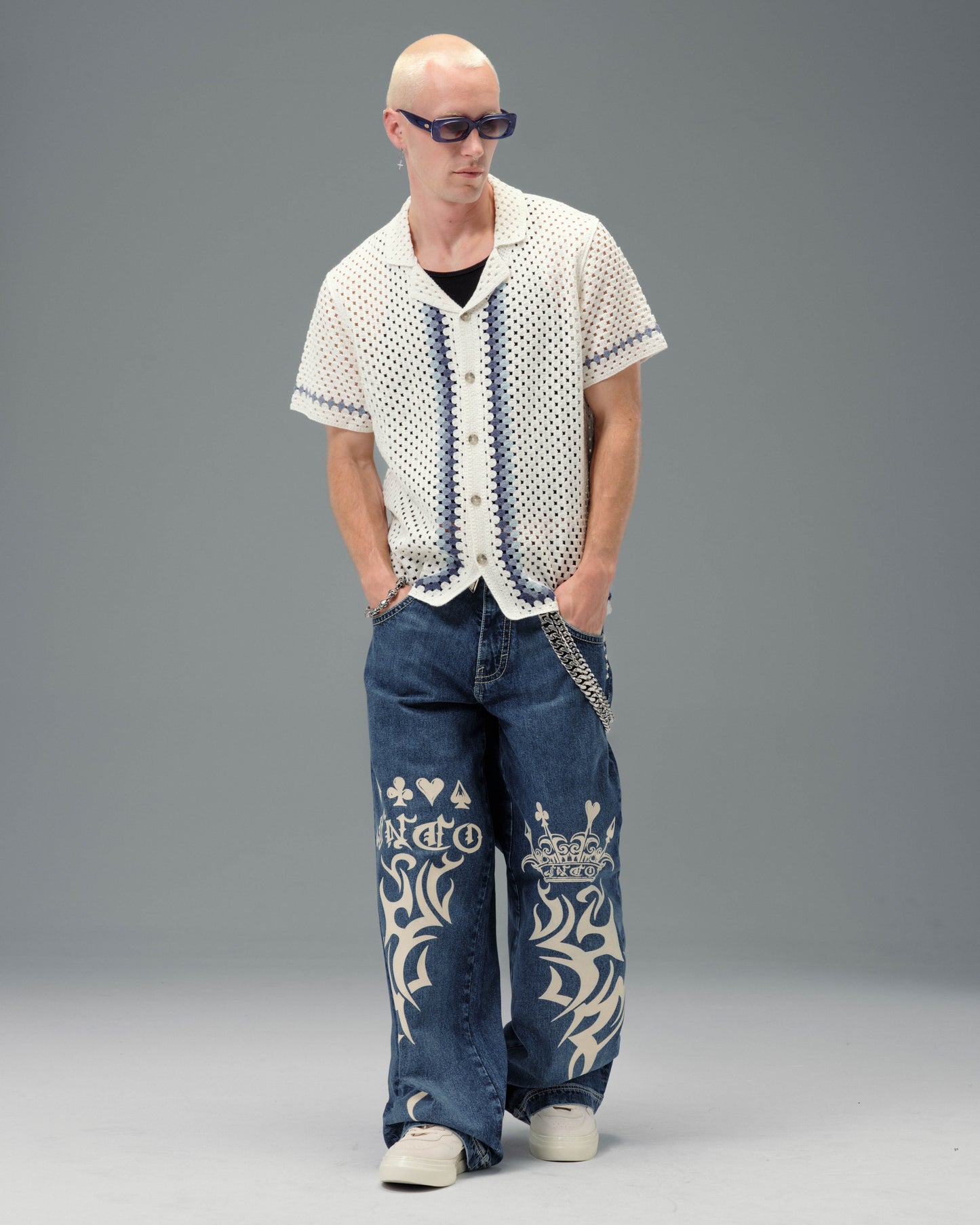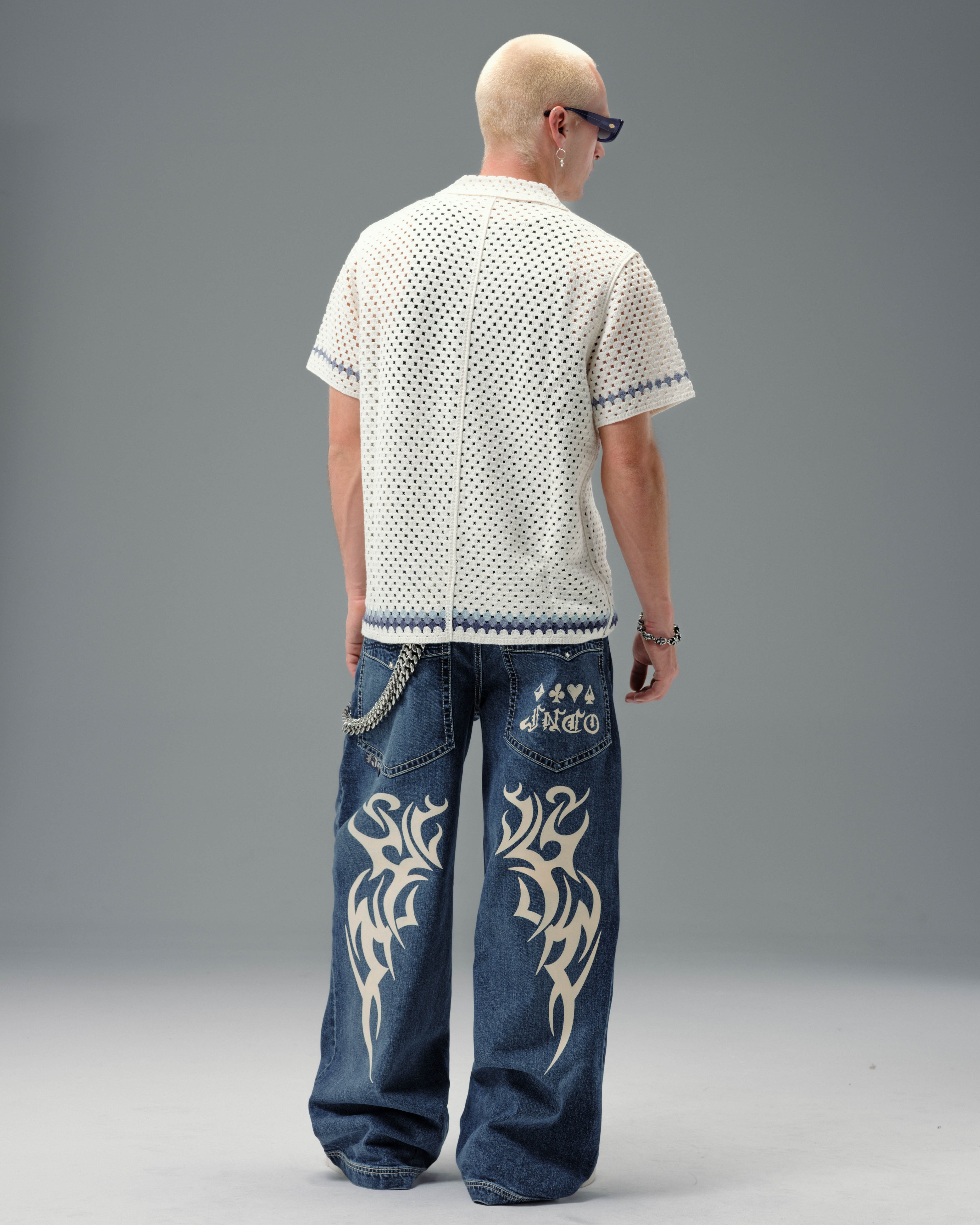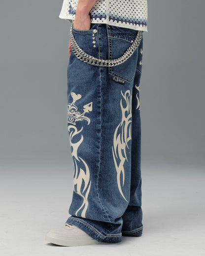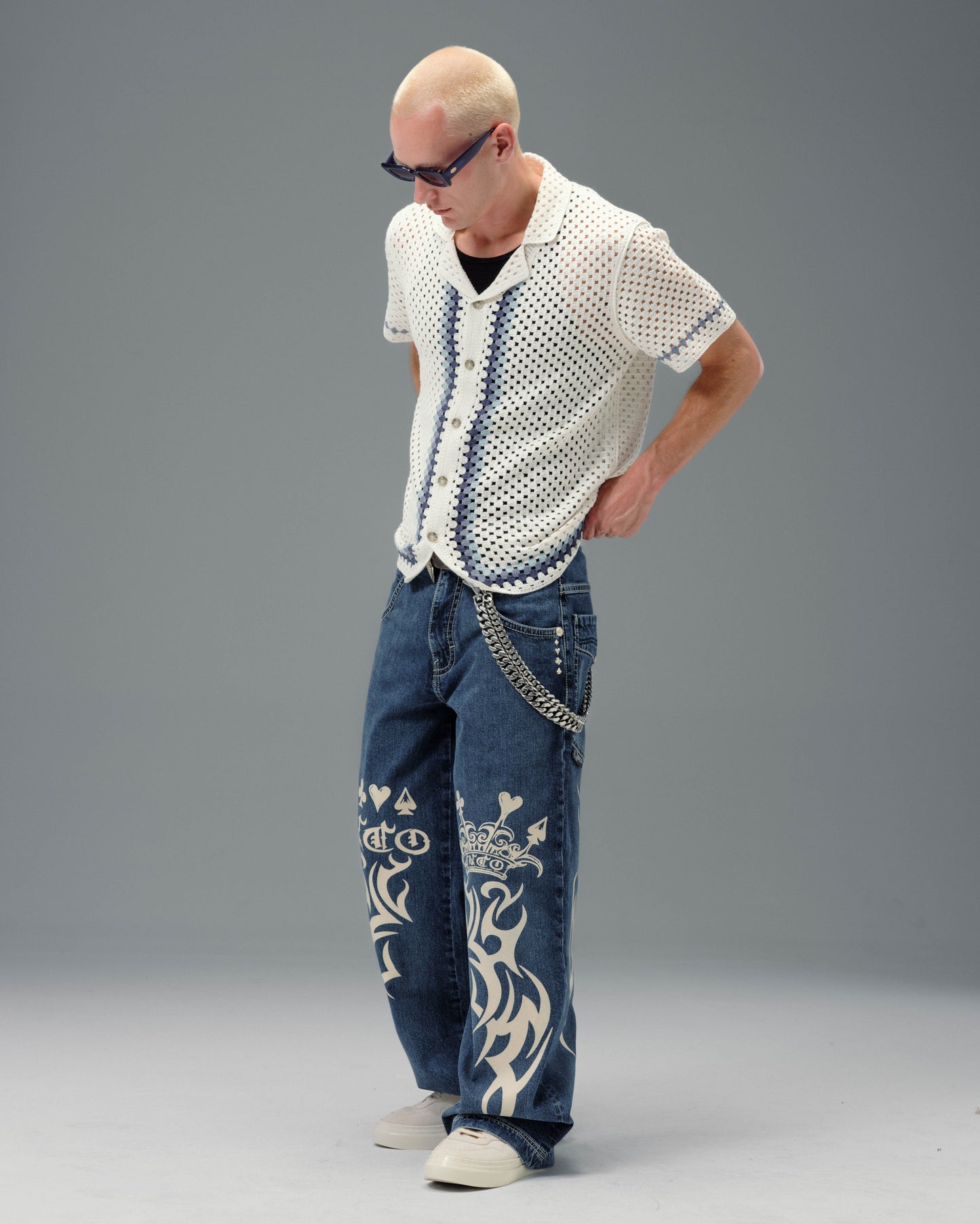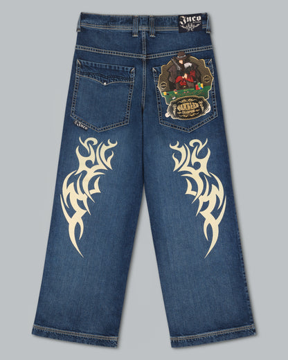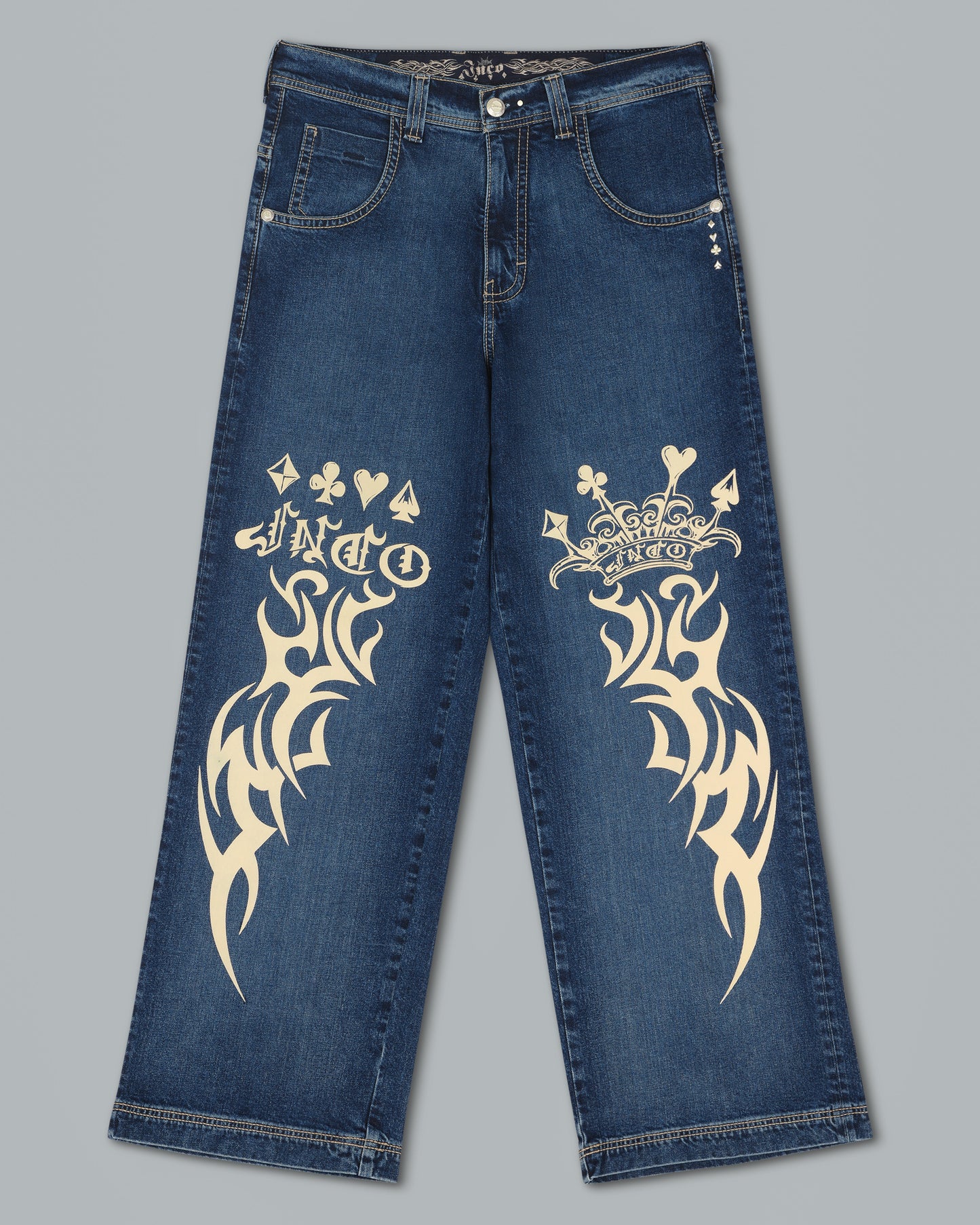 From the famous Tribal Collection. 13oz ring-spun cotton denim with slight stretch in a Hand-Sand Dark Stone Wash, offering bold twill texture and a modern edge. 23" bottom opening with contrast stitching and an oversized fit. Features symmetrical tribal graphics on front and back legs, Old English logos, crowned icons, and card suit embroidery. Finished with custom hardware and gilded four-suit rivets. Collectible flasher included.