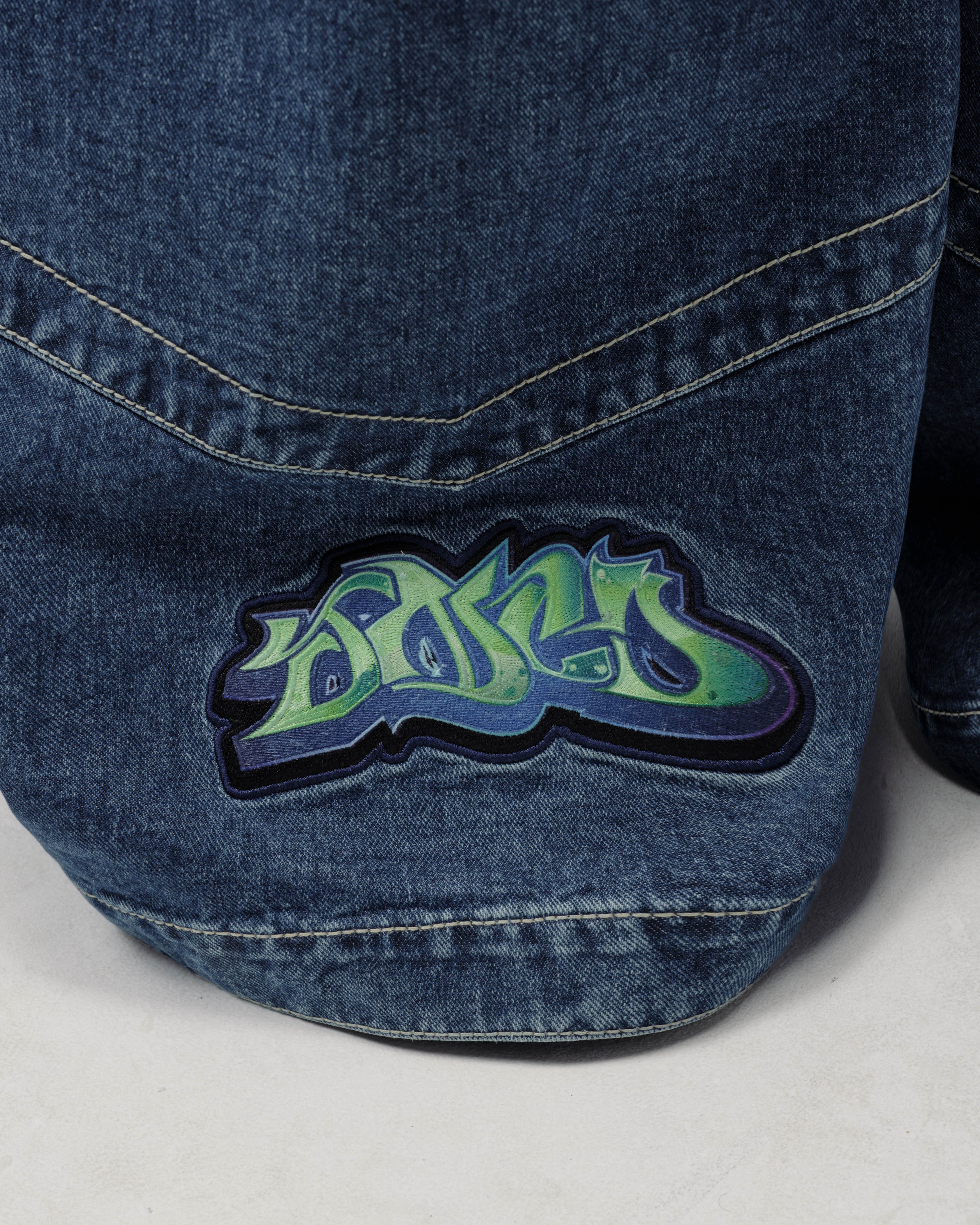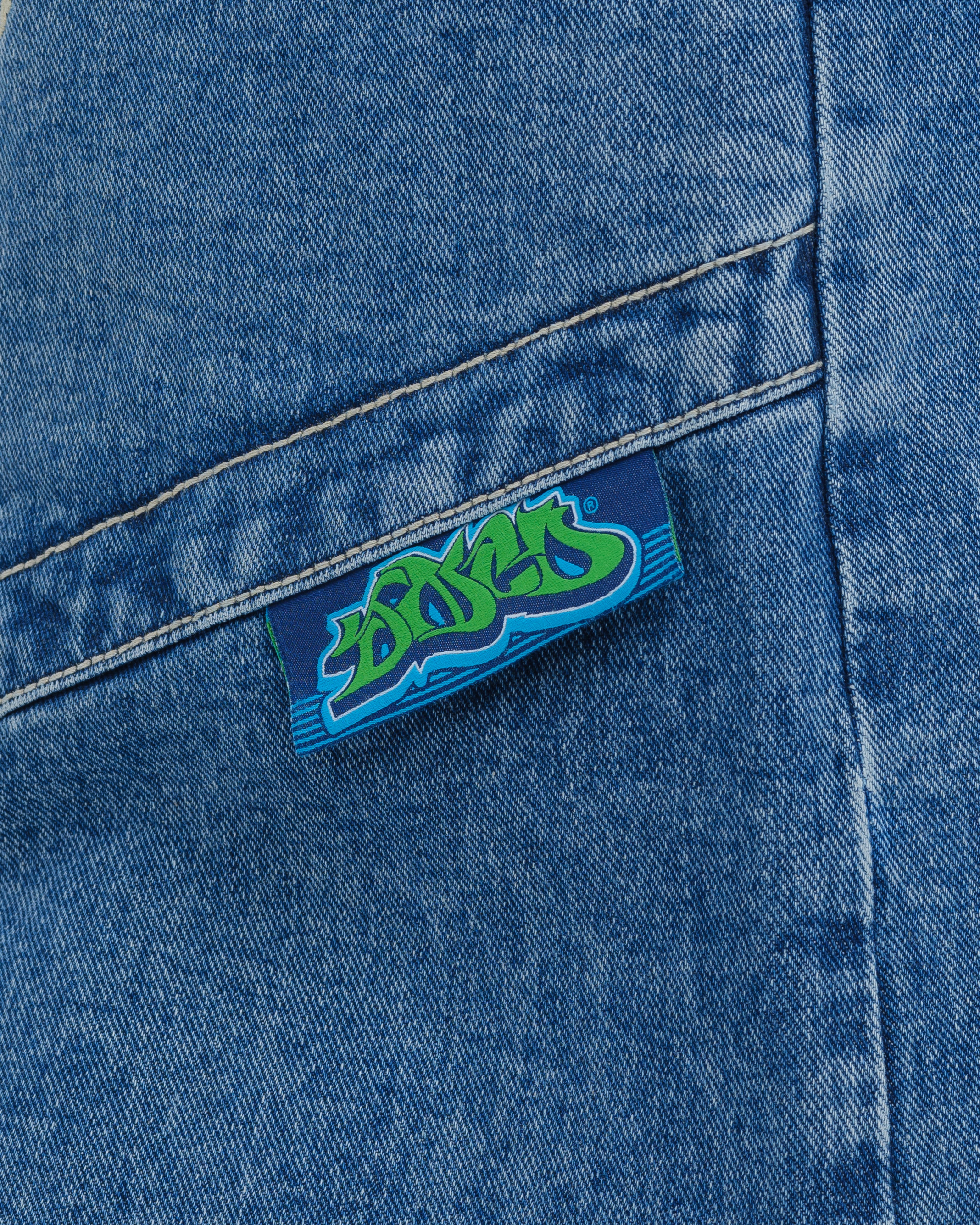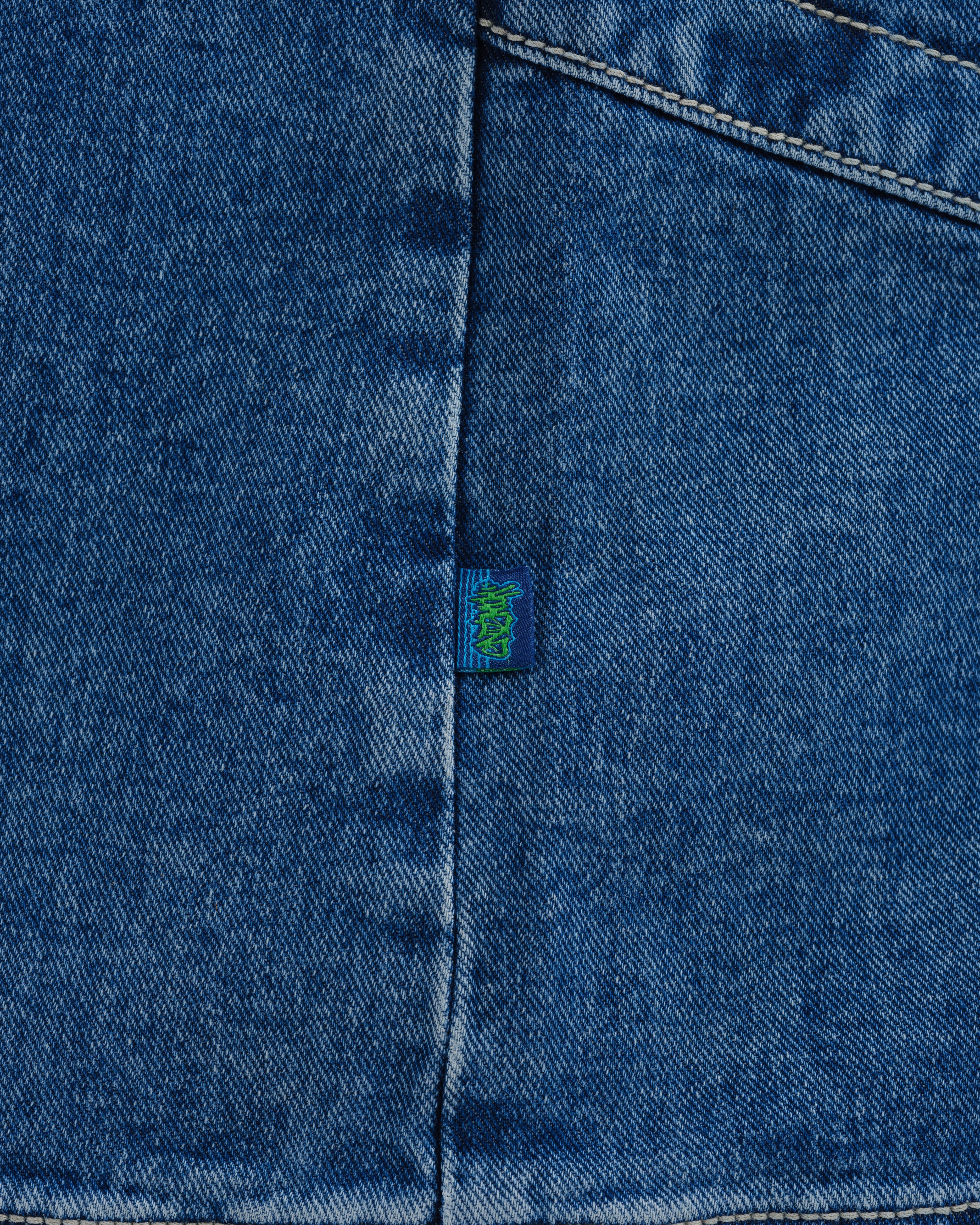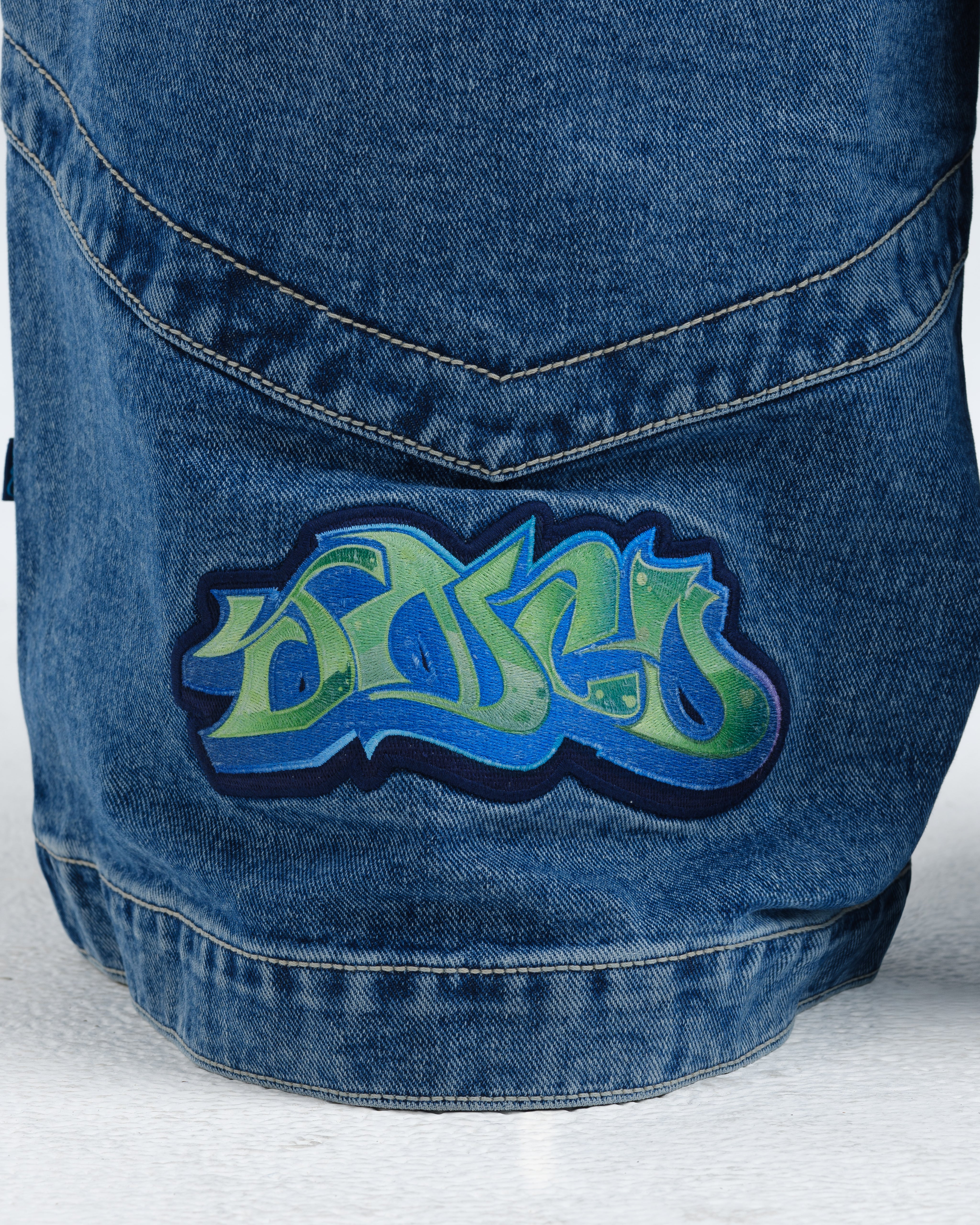 14oz 100% cotton denim with heavy double contrast stitching. Oversized back pockets with JNCO logo and “hangin' tagger” embroidery. Original labels and collectible metallic flasher. Limited Edition – very limited stock.