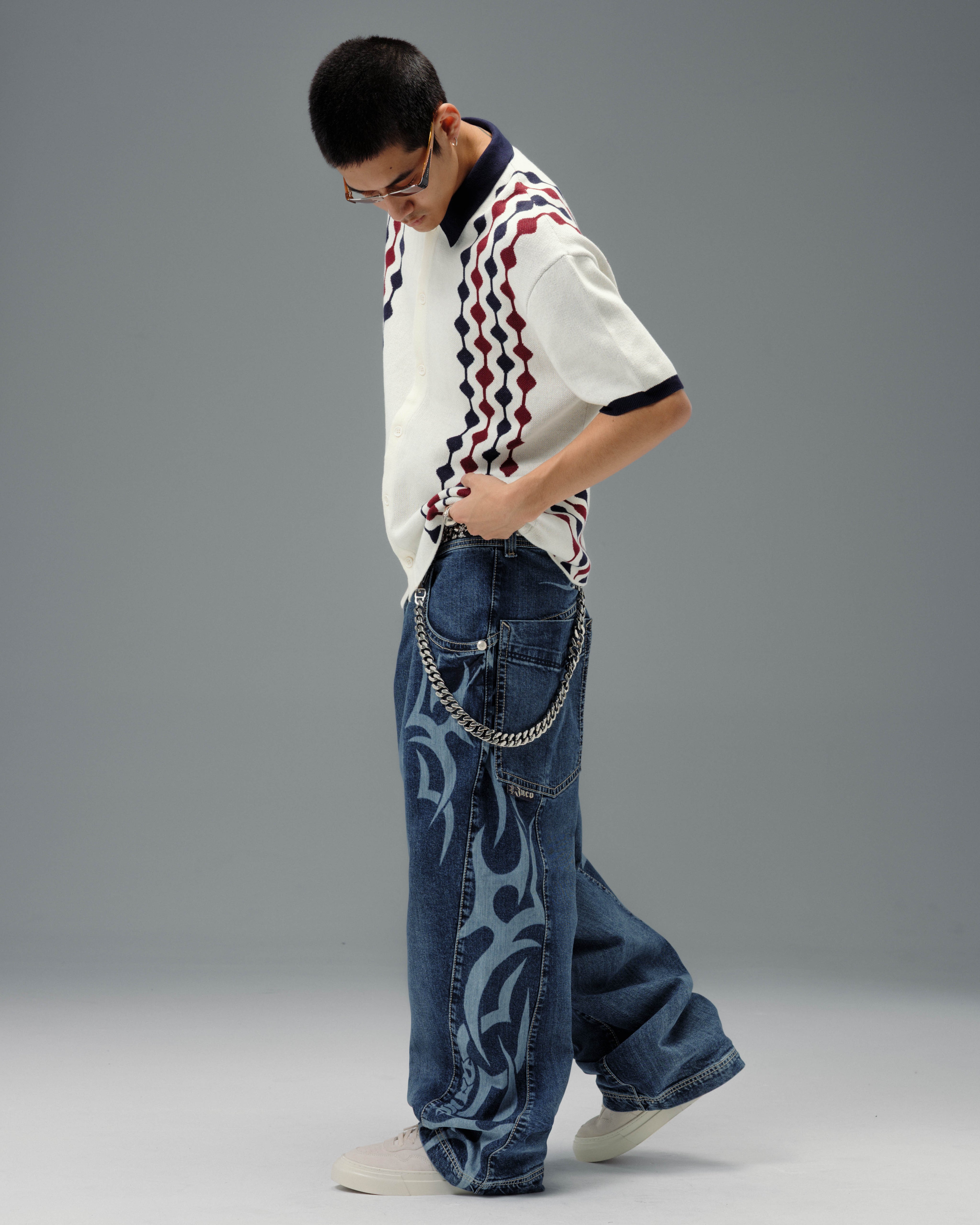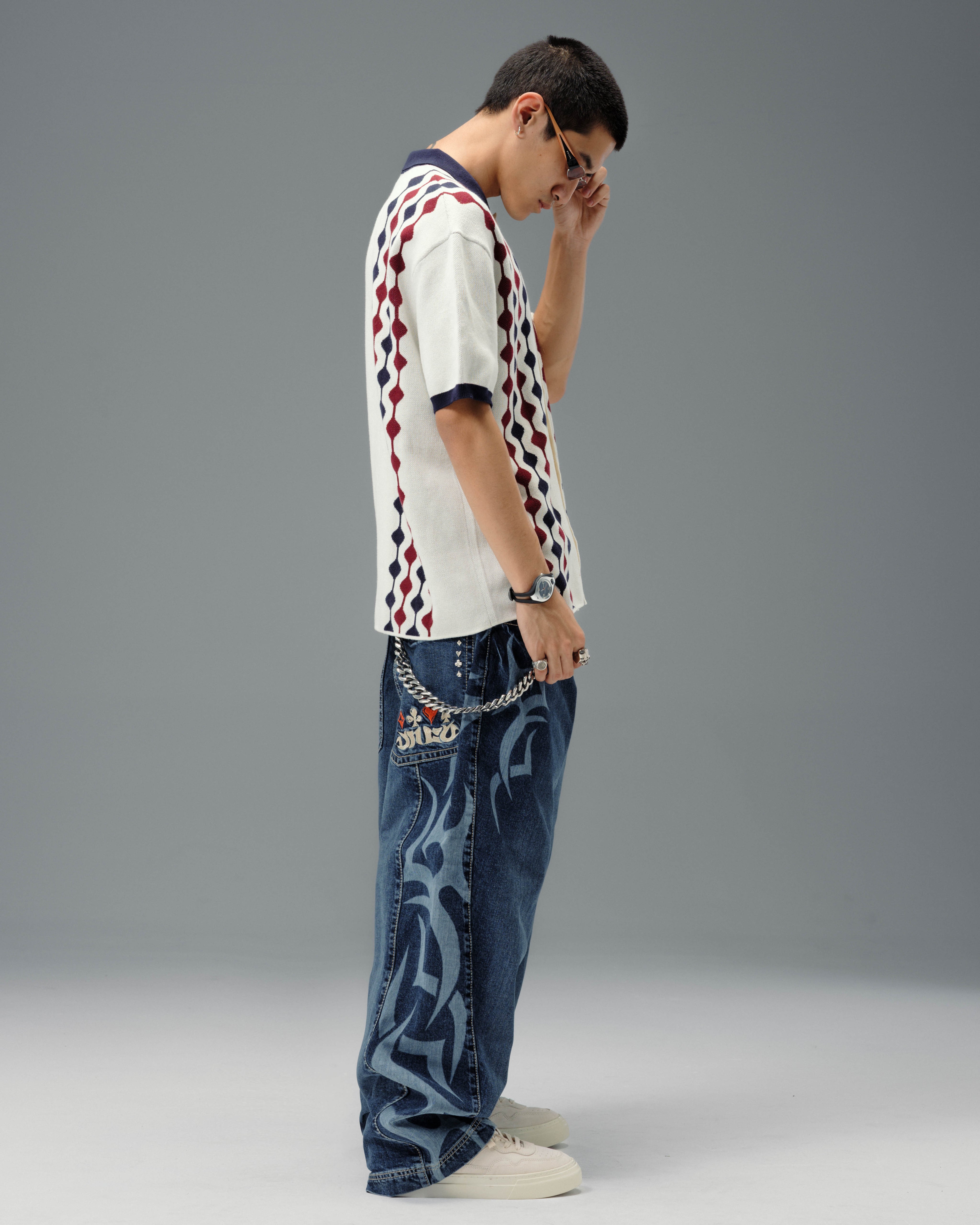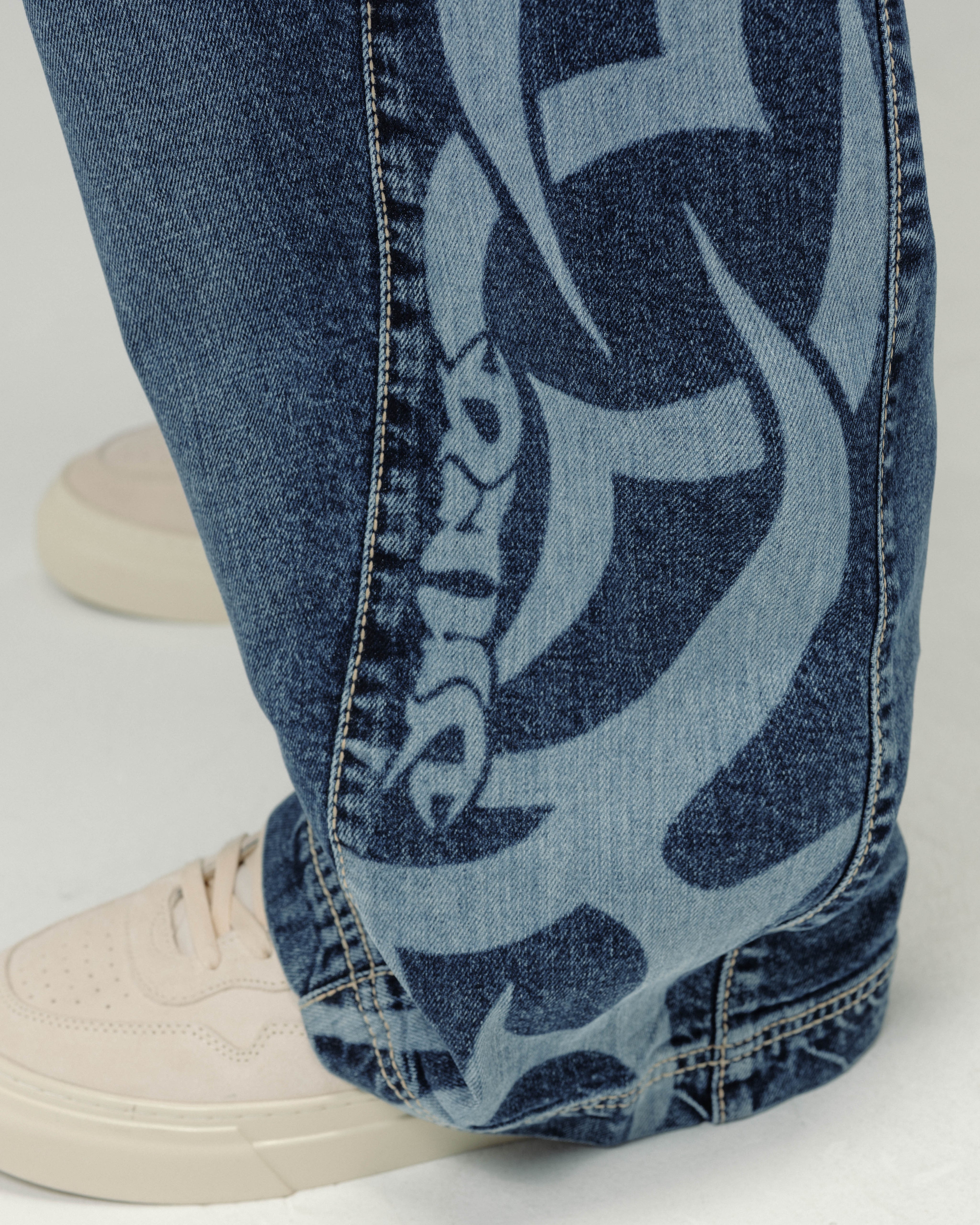 From the famous Tribal Collection. 13oz ring-spun cotton denim with slight stretch in a Hand-Sand Dark Stone Wash, featuring rich twill texture and a structured, modern feel. 21" bottom opening with heavy contrast stitching, oversized back pockets, and oversized fit. Features the original Tribal High Roller embroidery in pale white gold and red metallic threads, laser-etched graphics, and custom hardware. Collectible flasher included.