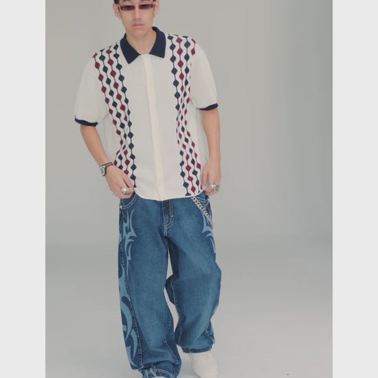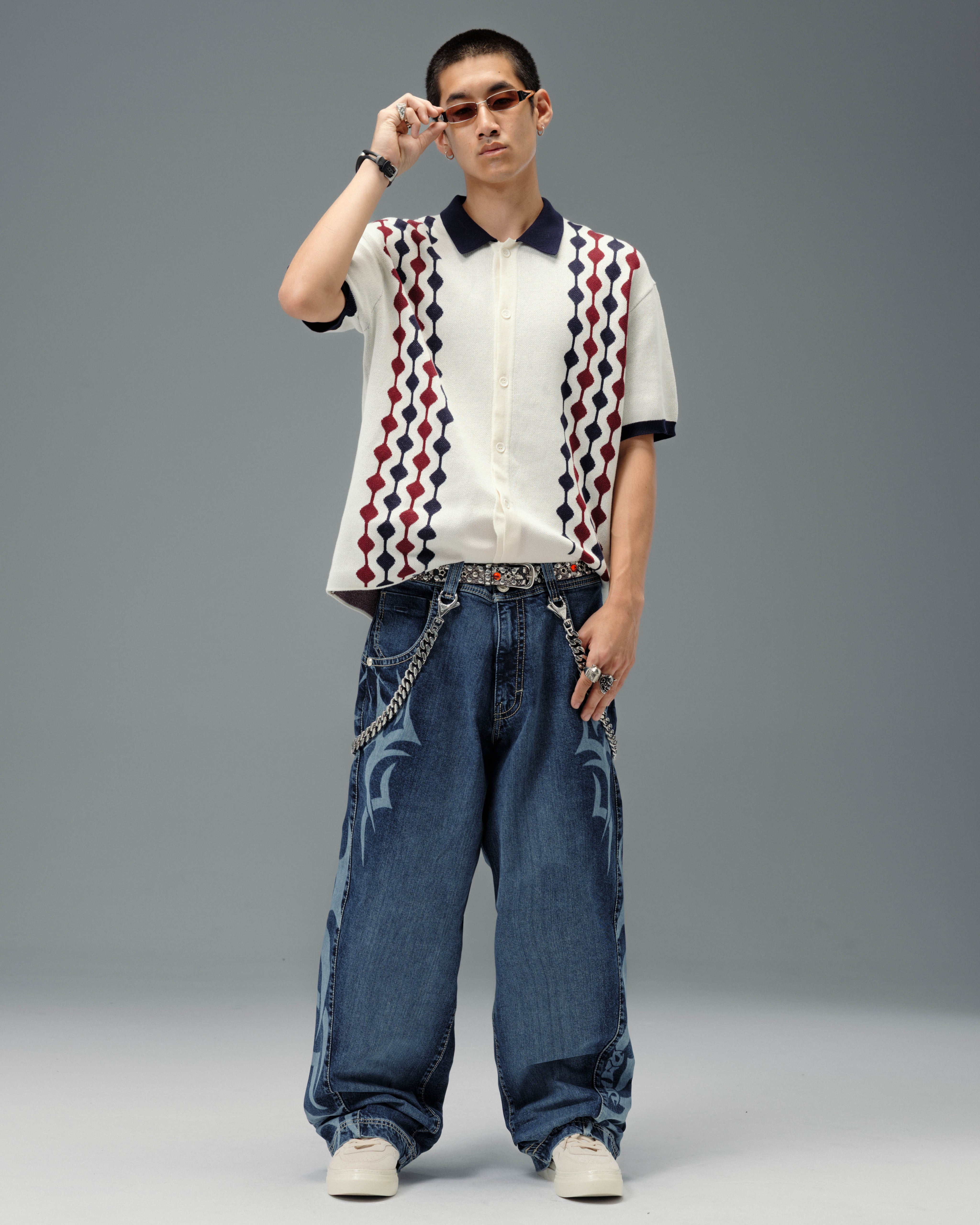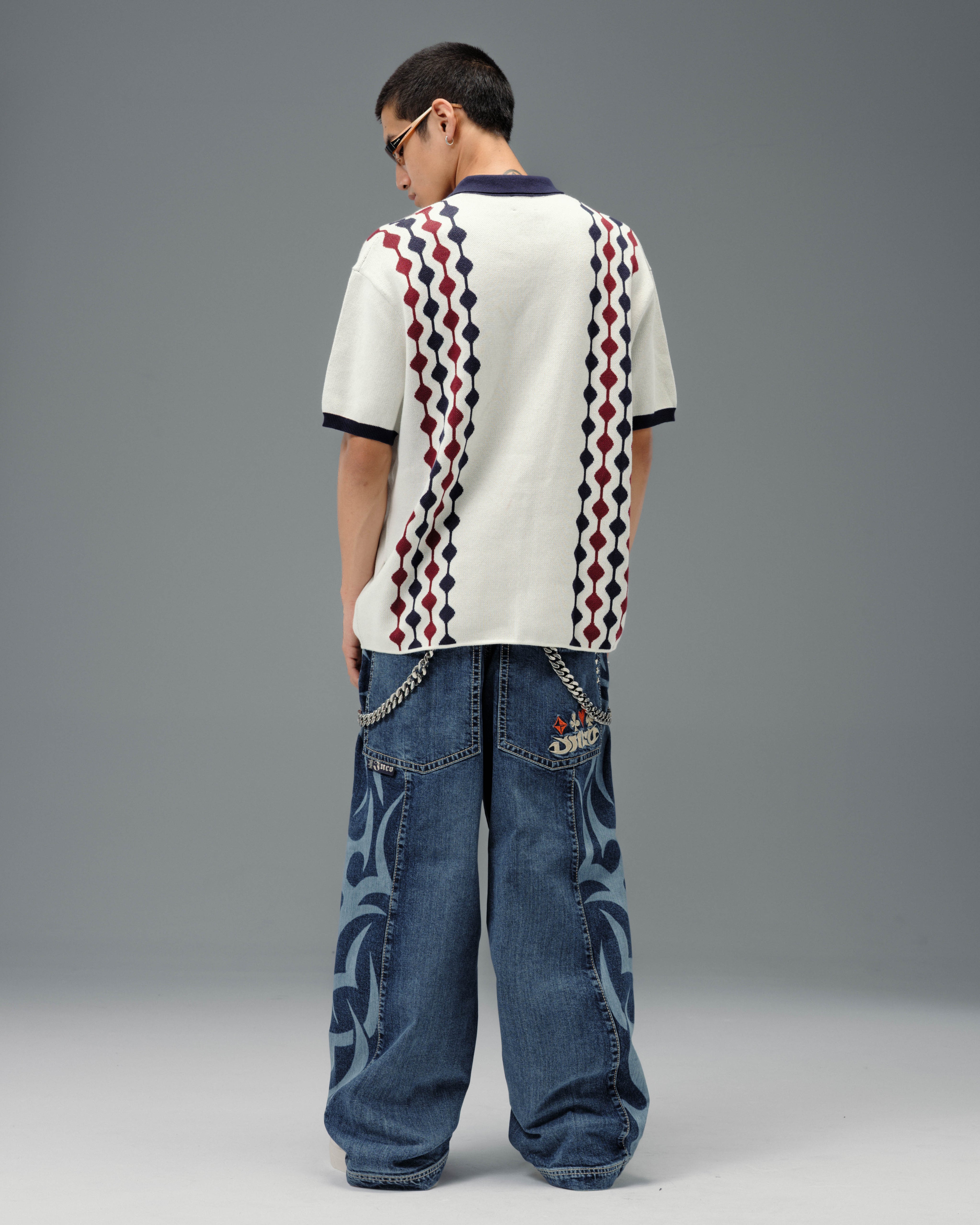 From the famous Tribal Collection. 13oz ring-spun cotton denim with slight stretch in a Hand-Sand Dark Stone Wash, featuring rich twill texture and a structured, modern feel. 21" bottom opening with heavy contrast stitching, oversized back pockets, and oversized fit. Features the original Tribal High Roller embroidery in pale white gold and red metallic threads, laser-etched graphics, and custom hardware. Collectible flasher included.