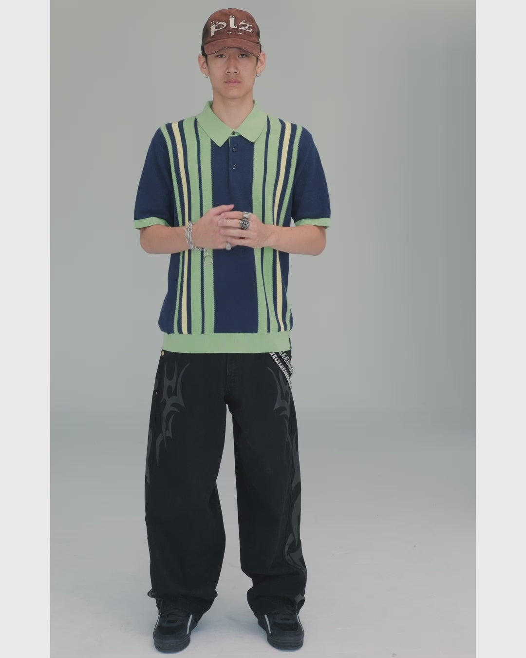 From the famous Tribal Collection. 13.5oz ring-spun cotton denim in Jet Black with bold twill texture and a smooth, structured feel. 21" bottom opening with heavy contrast stitching, oversized back pockets, and oversized fit. Features the original Tribal High Roller embroidery in yellow gold and red metallic threads, and custom hardware and printed tribal graphics.