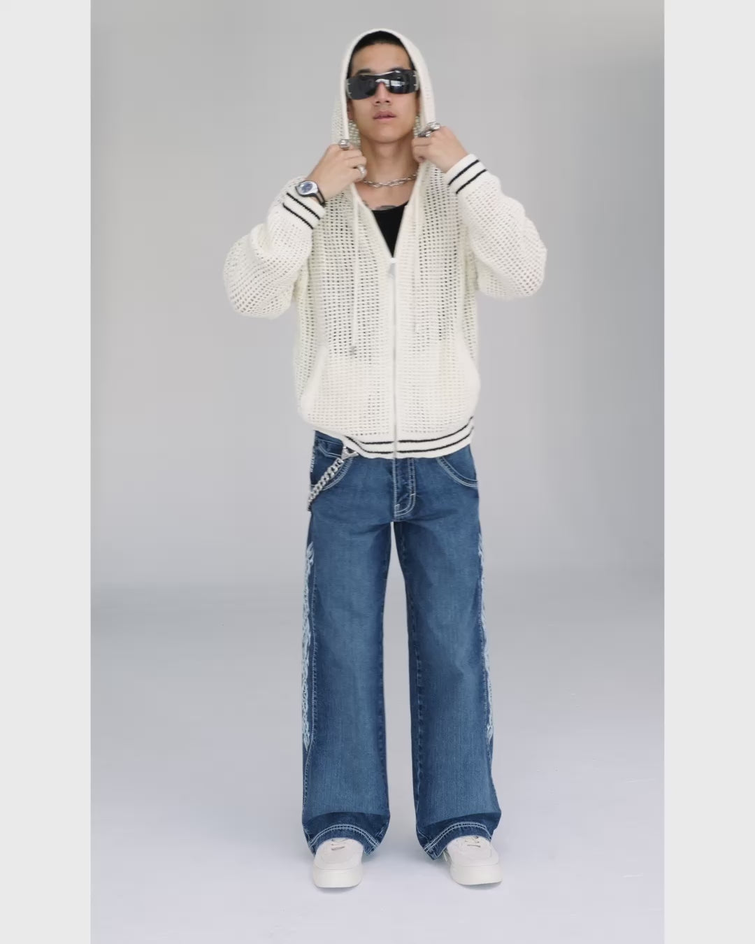 From the famous Tribal Collection. 13oz ring-spun denim in a Hand-Sand Dark Stone wash with a deep indigo tone and a structured, smooth silhouette. 23" bottom opening with contrast stitching and engineered side seams. Features over 120,000 embroidered stitches, including long vertical tribal graphics, Celtic-inspired logos on the back pockets, and heritage crown symbolism. Two-tone off-white and indigo stitching around the pockets and reinforced with angled double stitching. Finished with premium custom hardware. Collectible flasher included.
