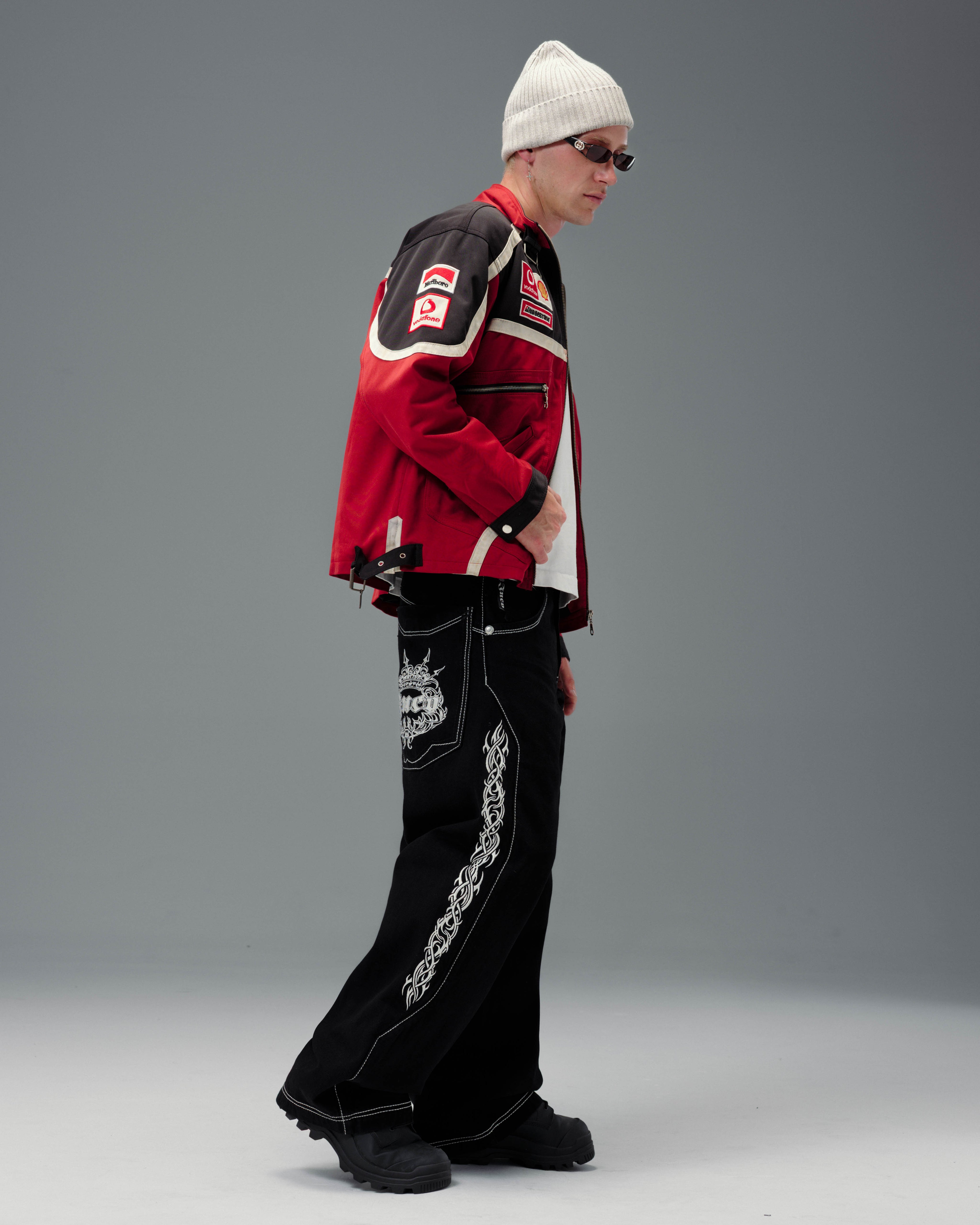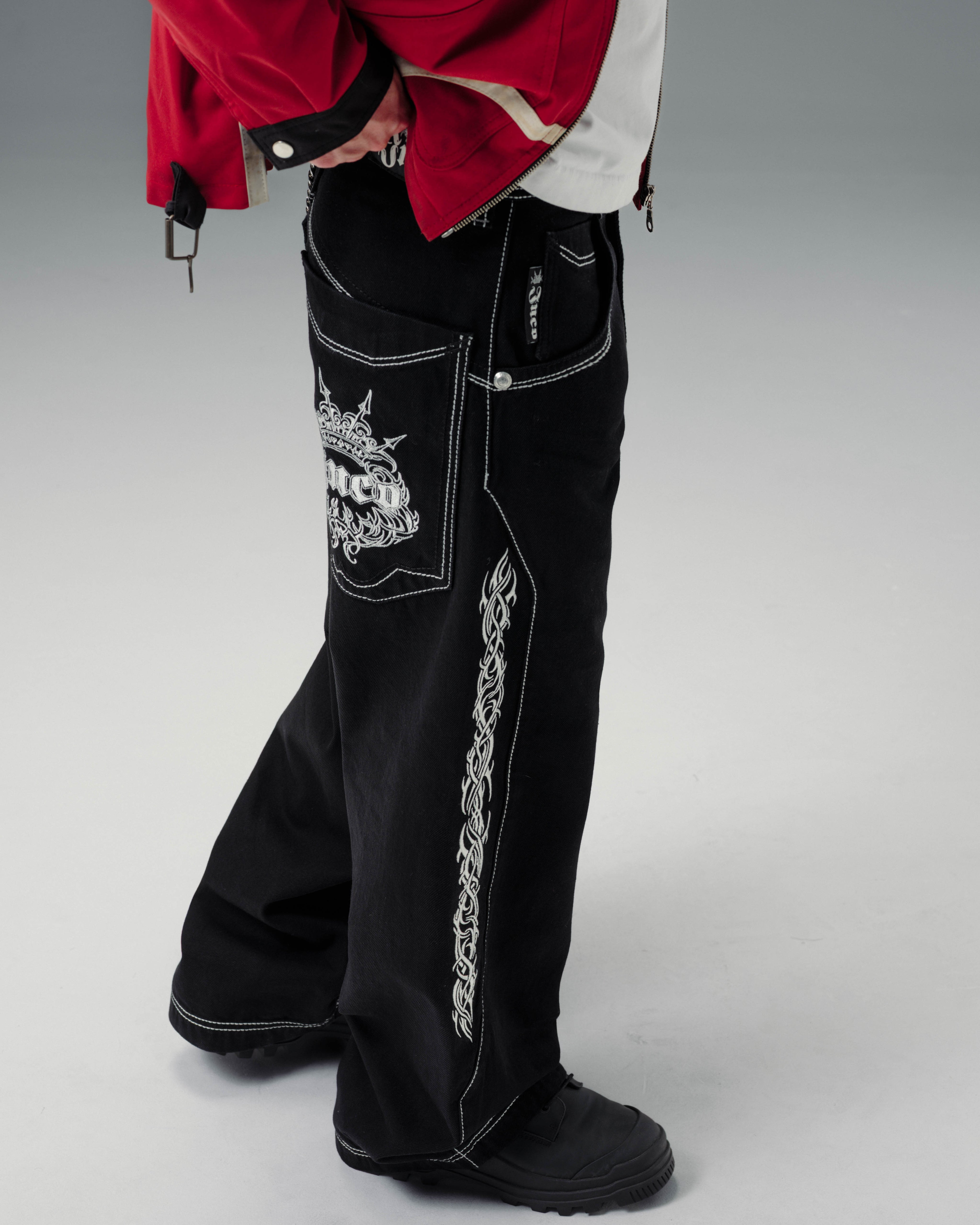 From the famous Tribal Collection. 13.5oz ring-spun denim in a sleek Jet Black wash with a structured, smooth silhouette. 23" bottom opening with contrast stitching and engineered side seams. Features over 120,000 embroidered stitches, including long vertical tribal graphics, Celtic-inspired logos on the back pockets, and heritage crown symbolism. Two-tone off-white and indigo thread adds depth to pocket details, reinforced with angled double stitching. Finished with premium custom hardware. Collectible flasher included.