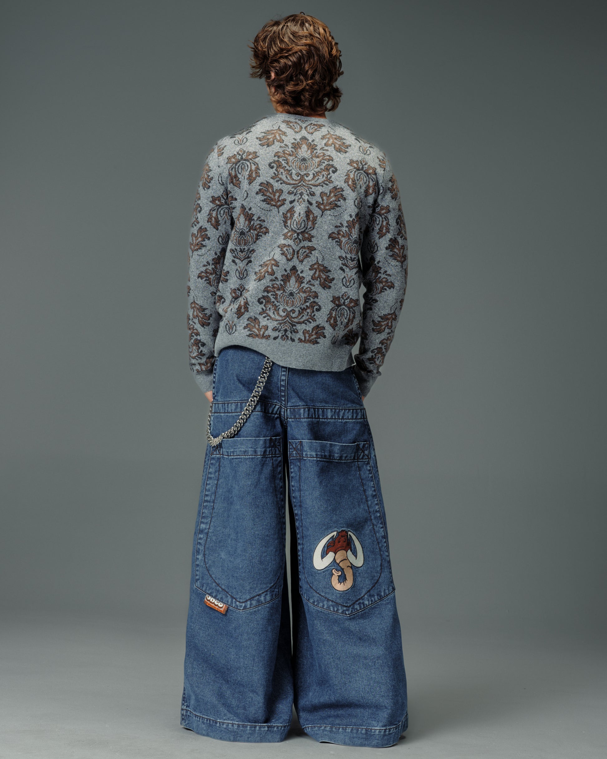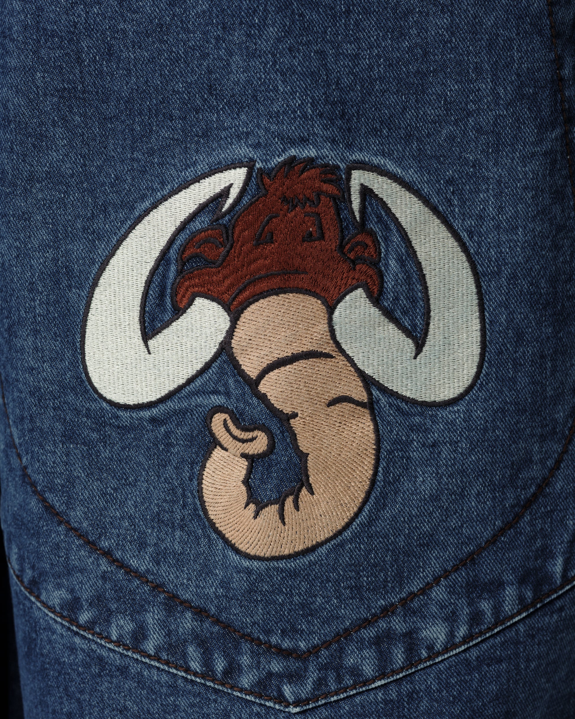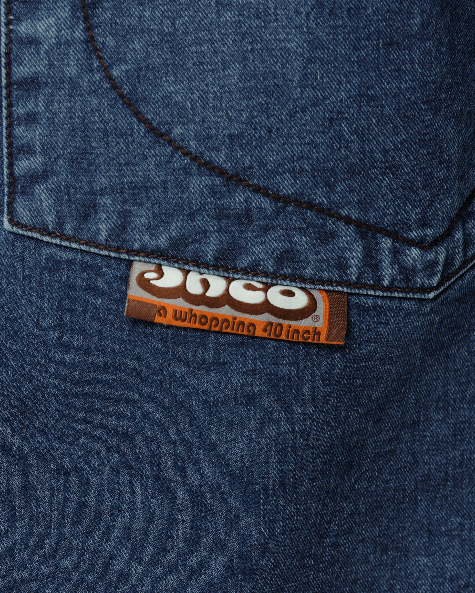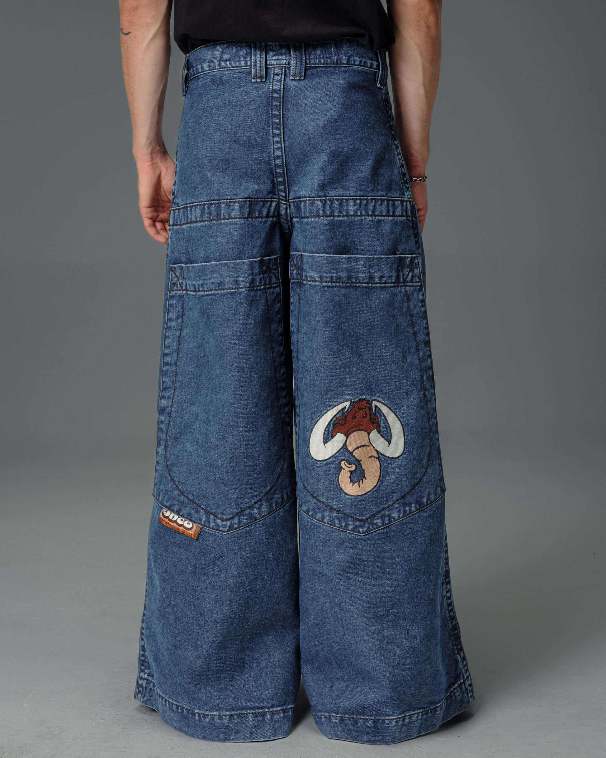 A legendary JNCO Collector classic in Dark Stone Wash denim with a massive 40" bottom opening. 14 oz. 100% cotton, 3x1 left-hand weave. Heavy contrast stitching and unique construction details. Back left pocket showcases the iconic 31,000-stitch Mammoth embroidery. Collectible Mammoth flasher attached. Limited Edition – very limited stock.