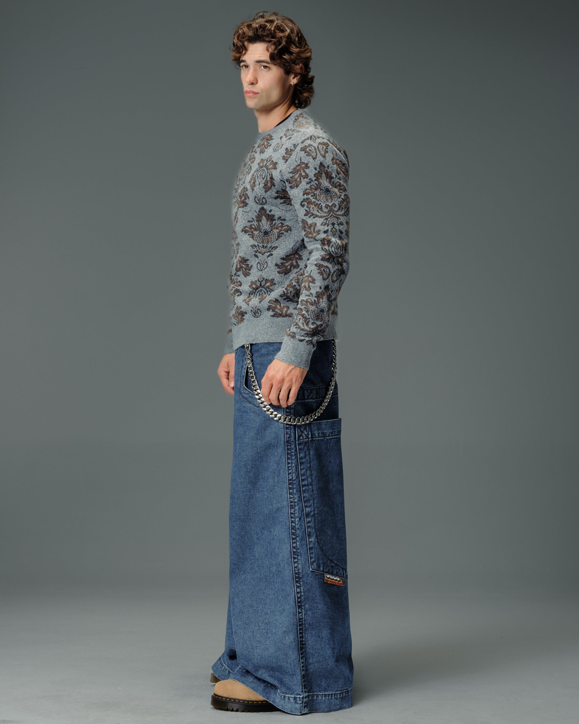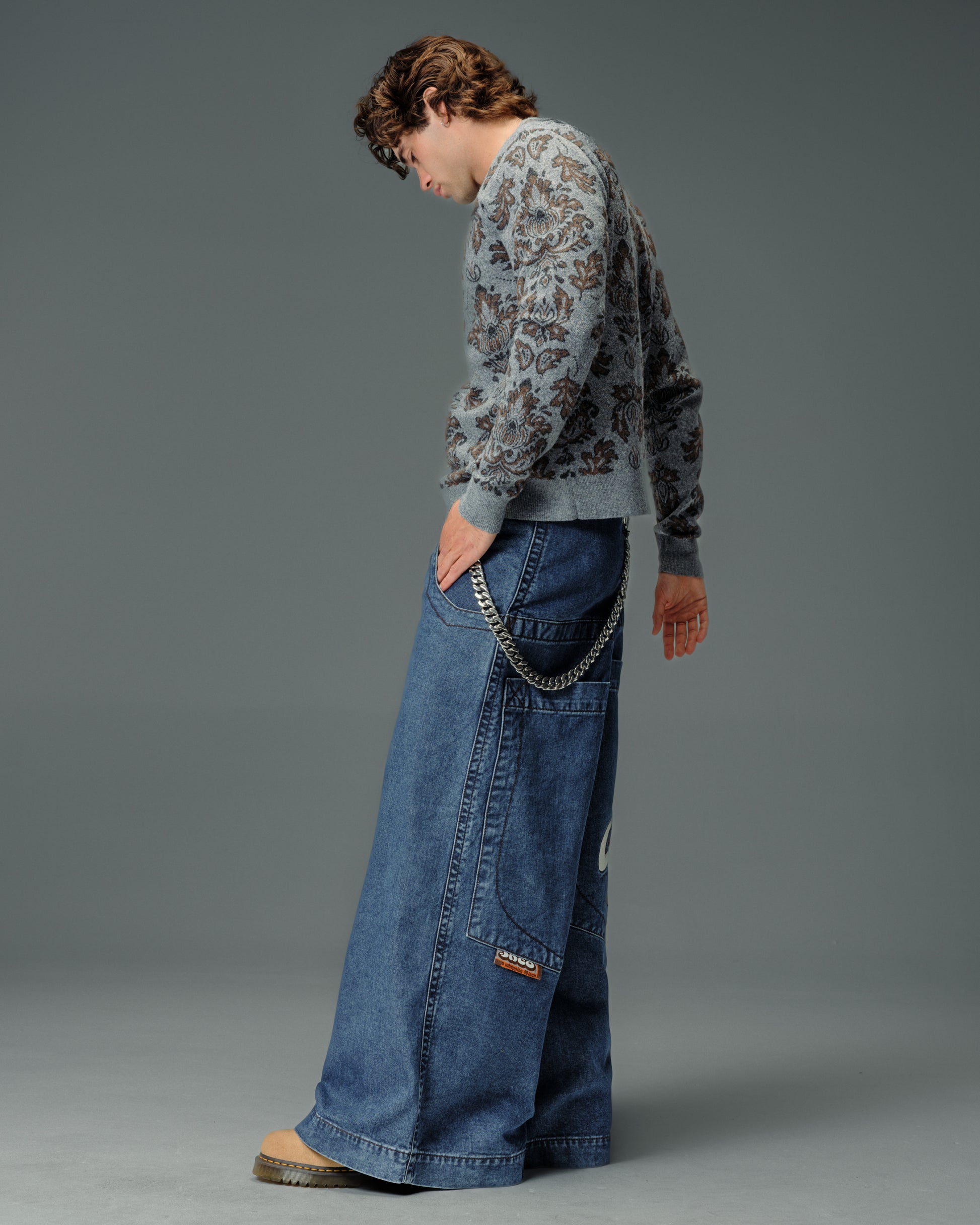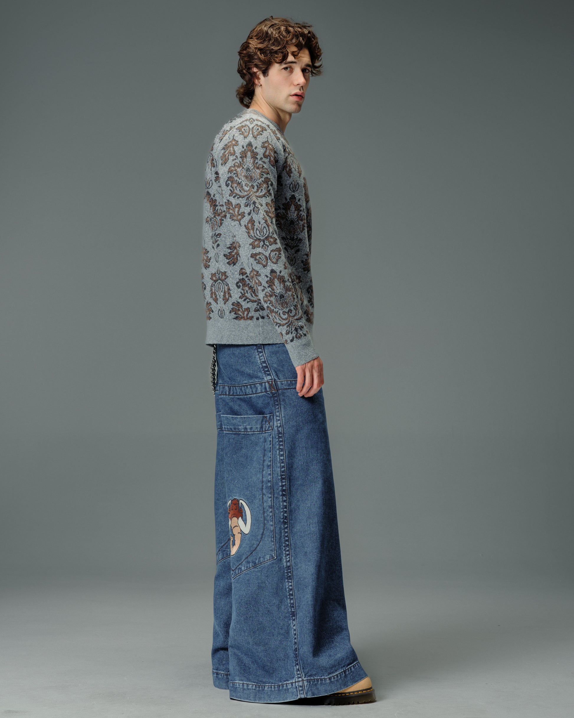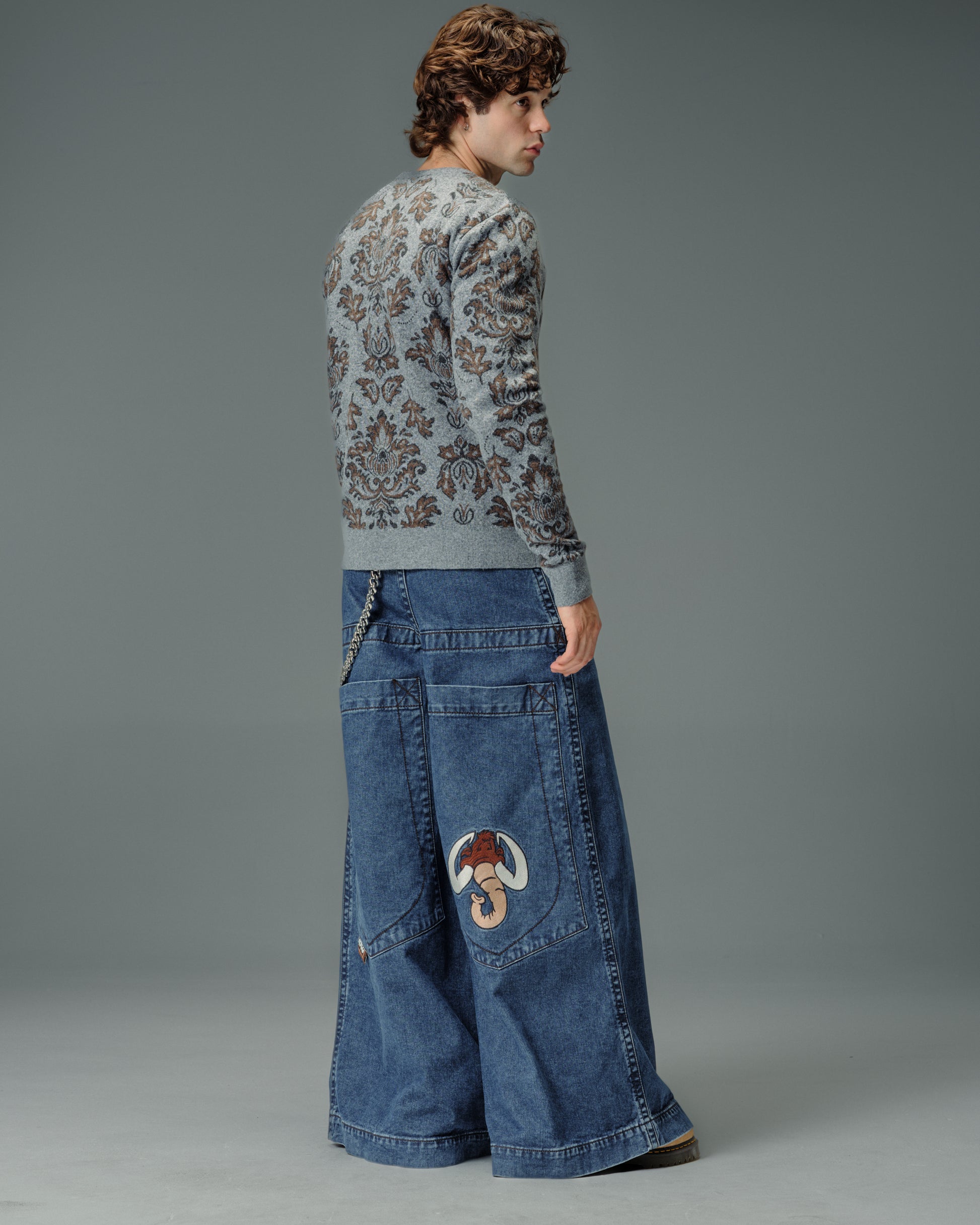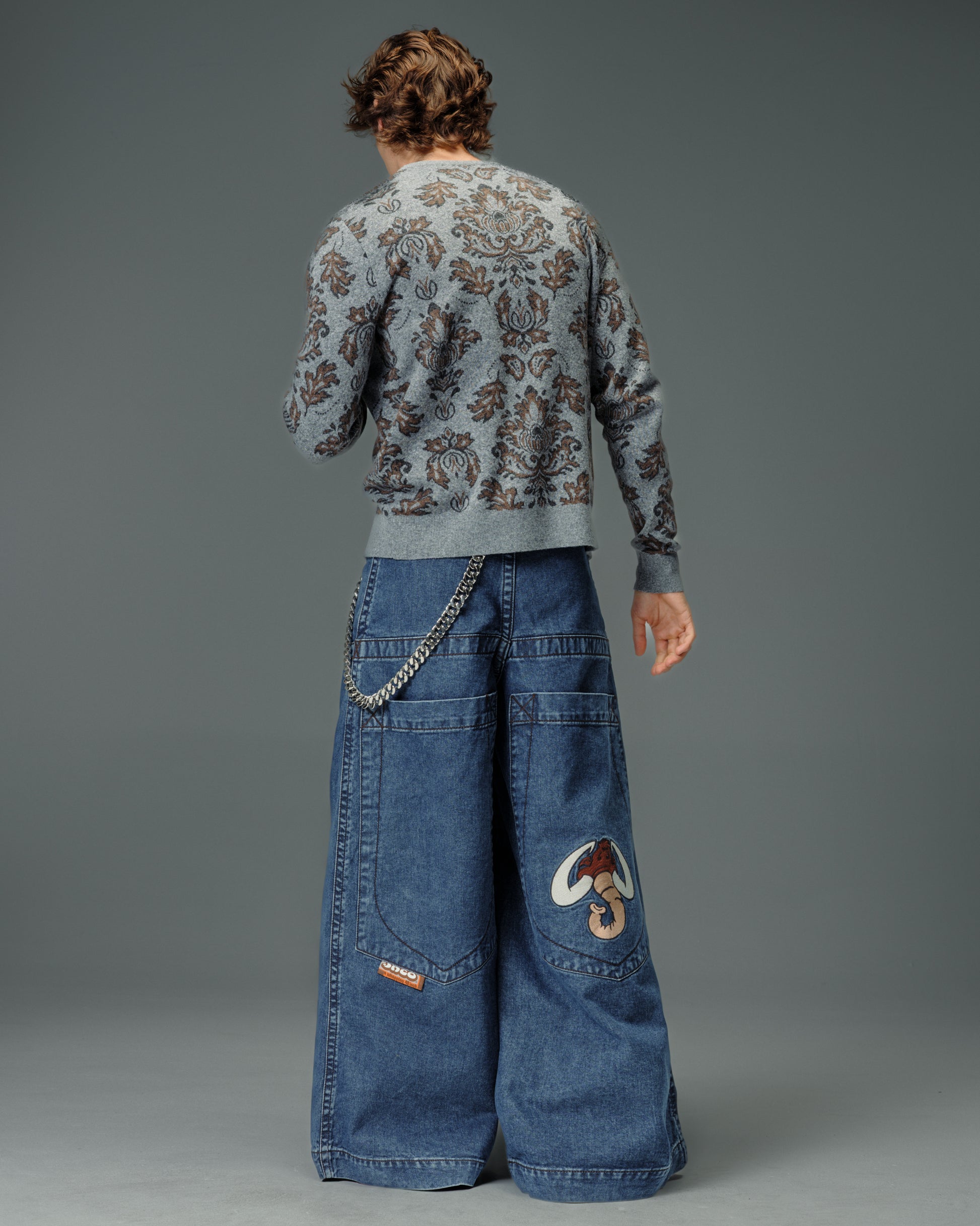 A legendary JNCO Collector classic in Dark Stone Wash denim with a massive 40" bottom opening. 14 oz. 100% cotton, 3x1 left-hand weave. Heavy contrast stitching and unique construction details. Back left pocket showcases the iconic 31,000-stitch Mammoth embroidery. Collectible Mammoth flasher attached. Limited Edition – very limited stock.