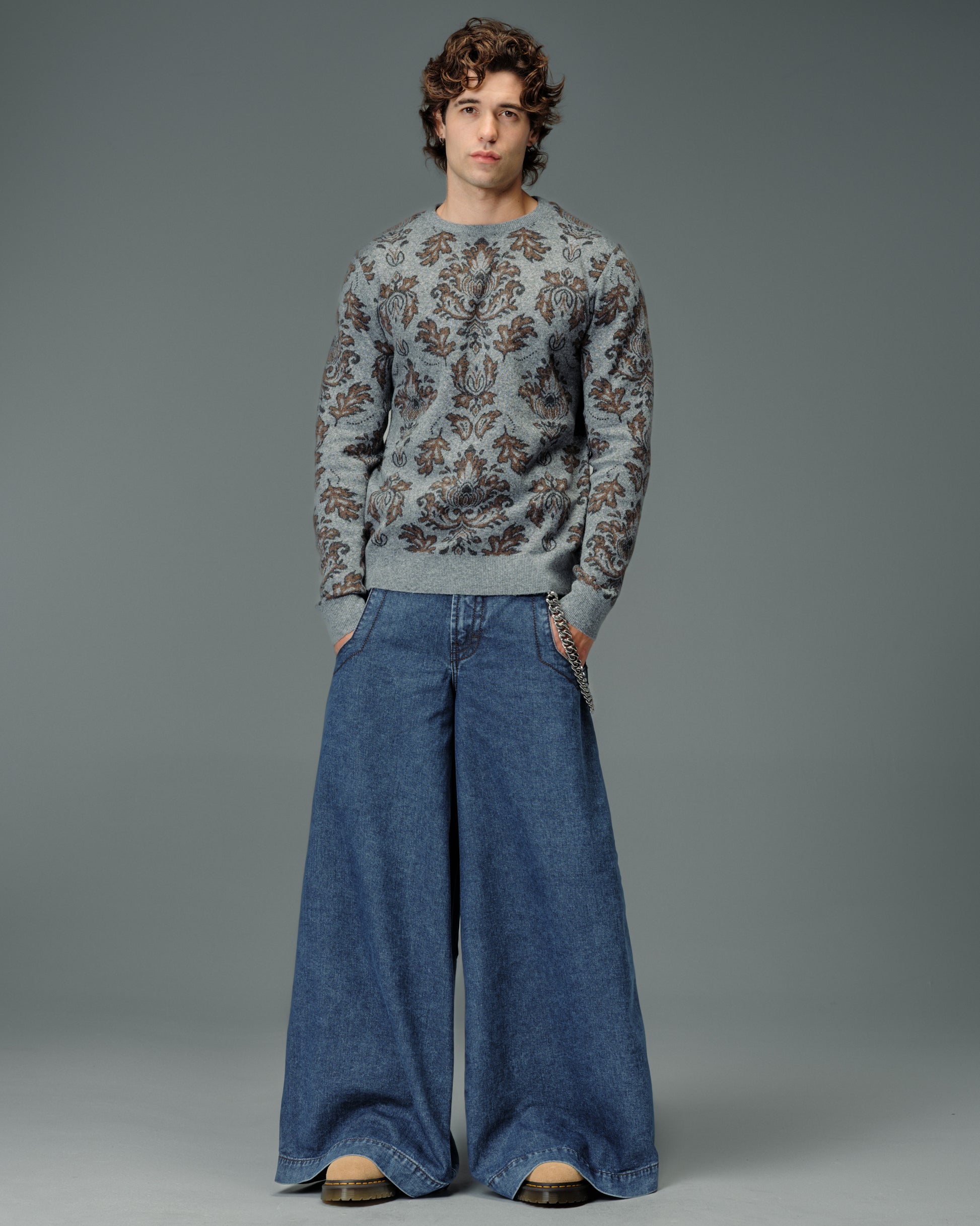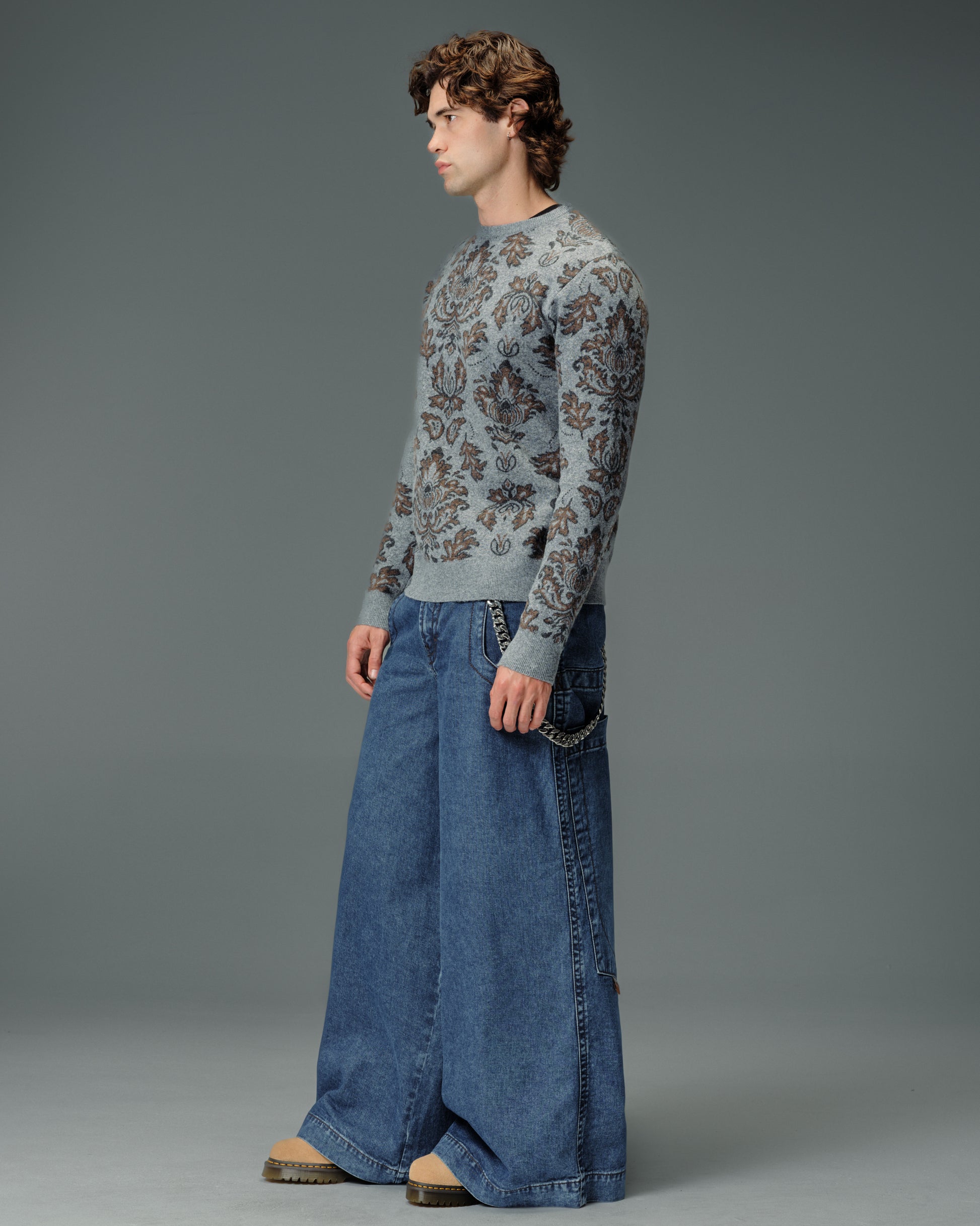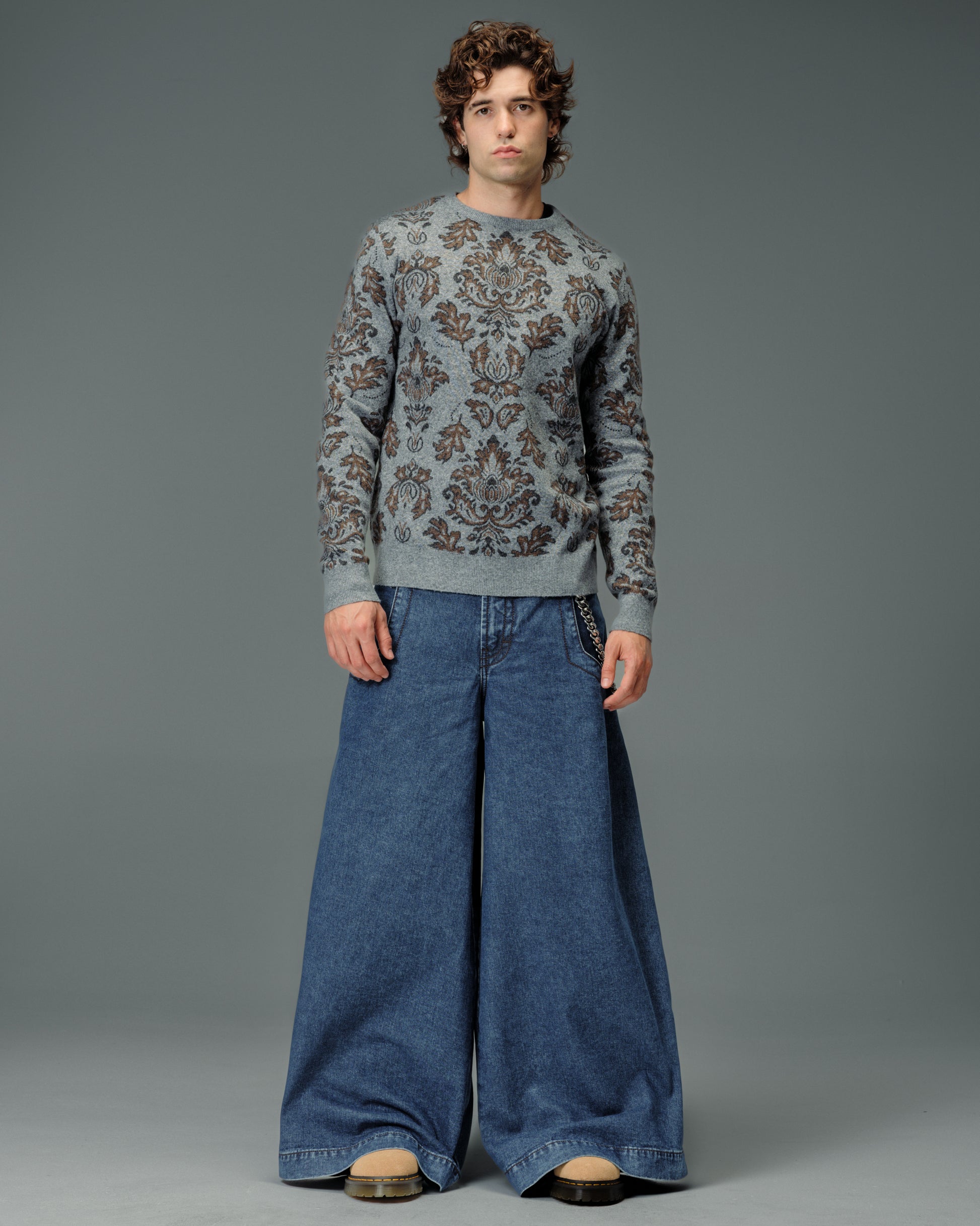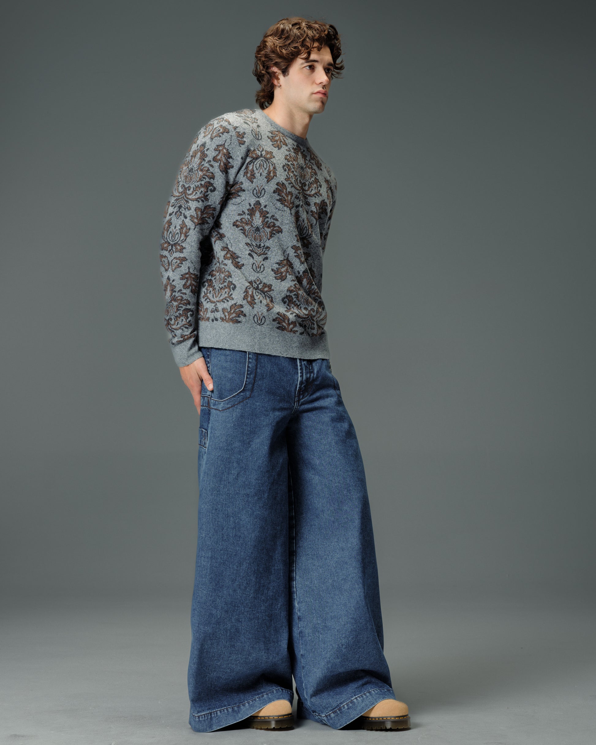 A legendary JNCO Collector classic in Dark Stone Wash denim with a massive 40" bottom opening. 14 oz. 100% cotton, 3x1 left-hand weave. Heavy contrast stitching and unique construction details. Back left pocket showcases the iconic 31,000-stitch Mammoth embroidery. Collectible Mammoth flasher attached. Limited Edition – very limited stock.