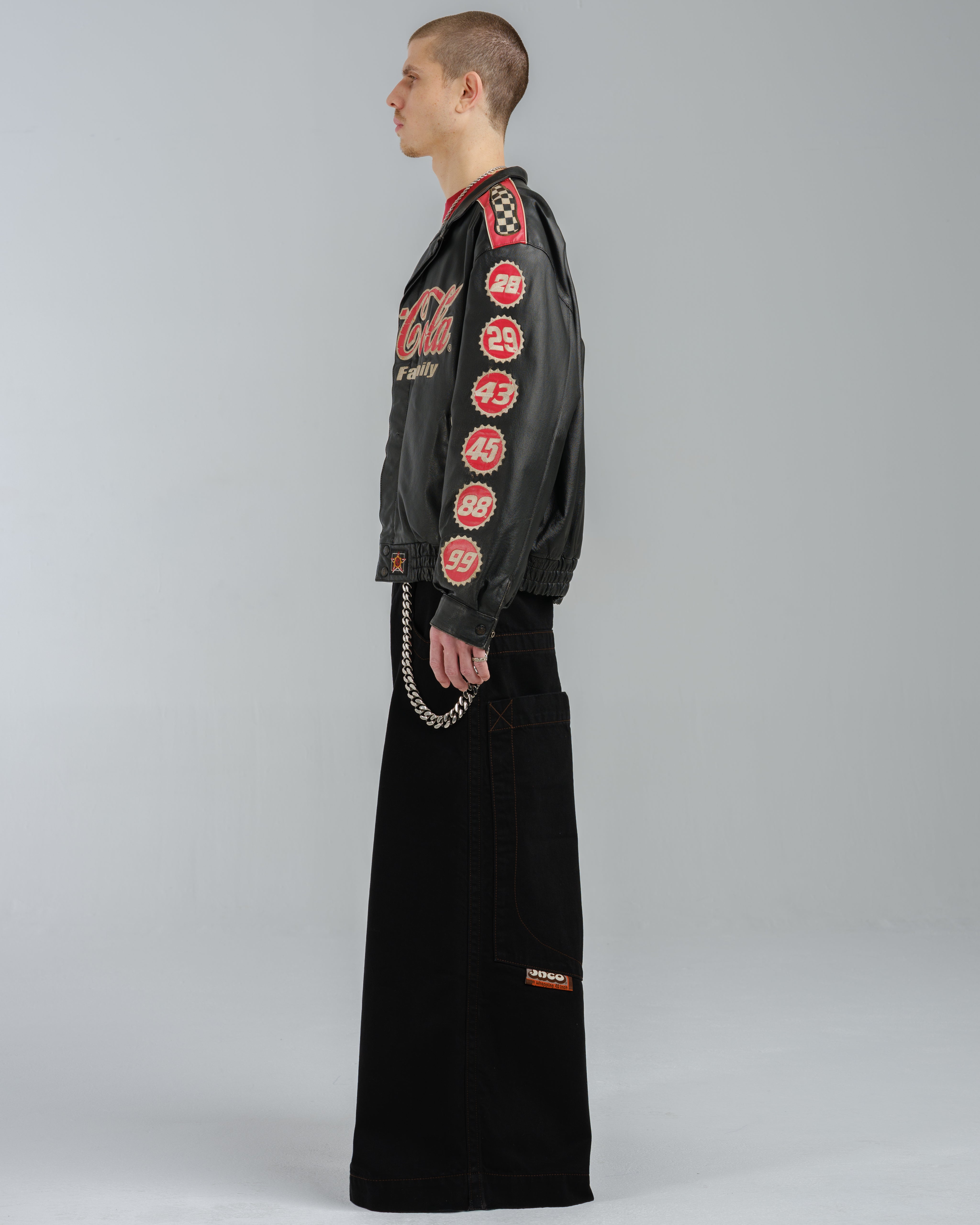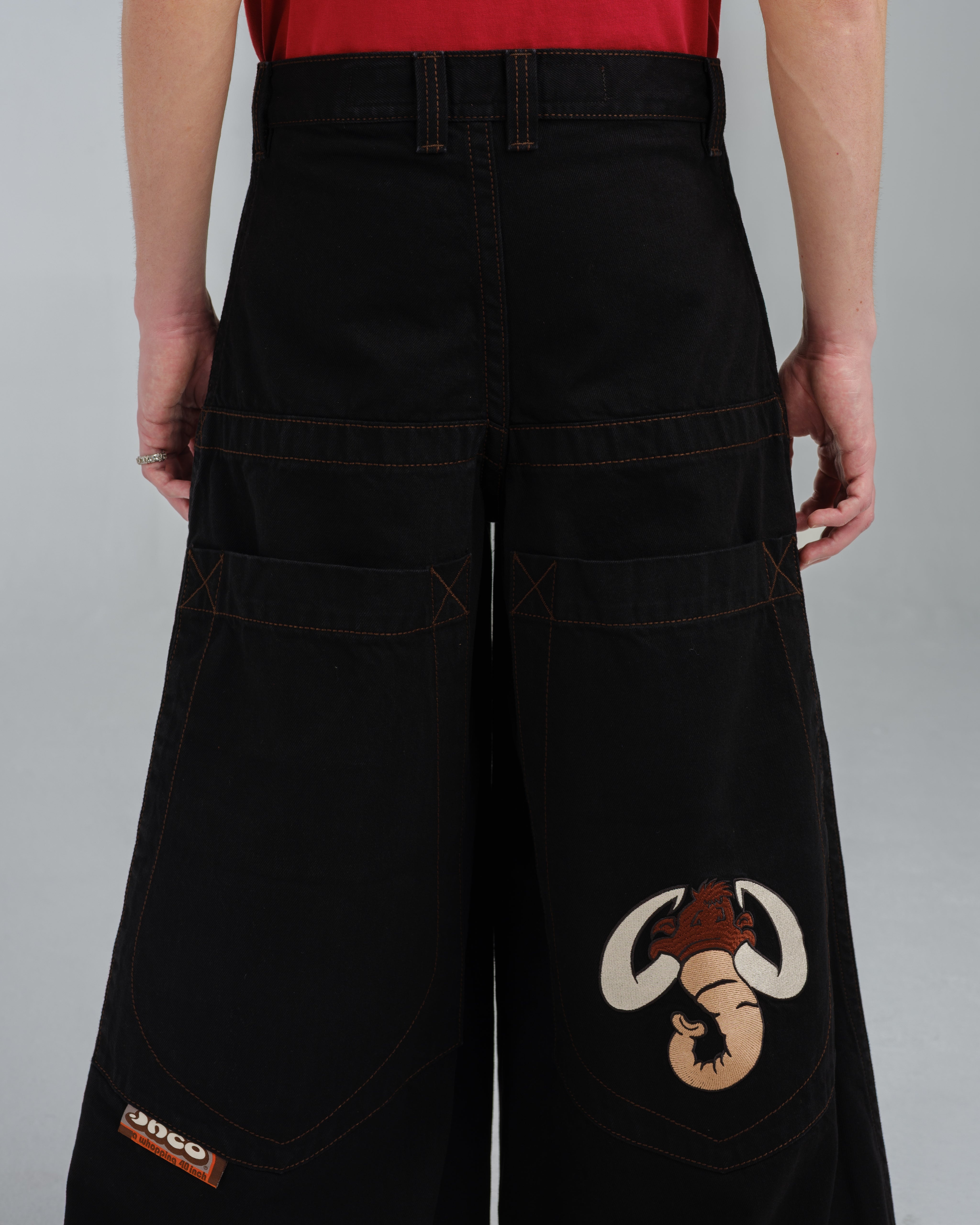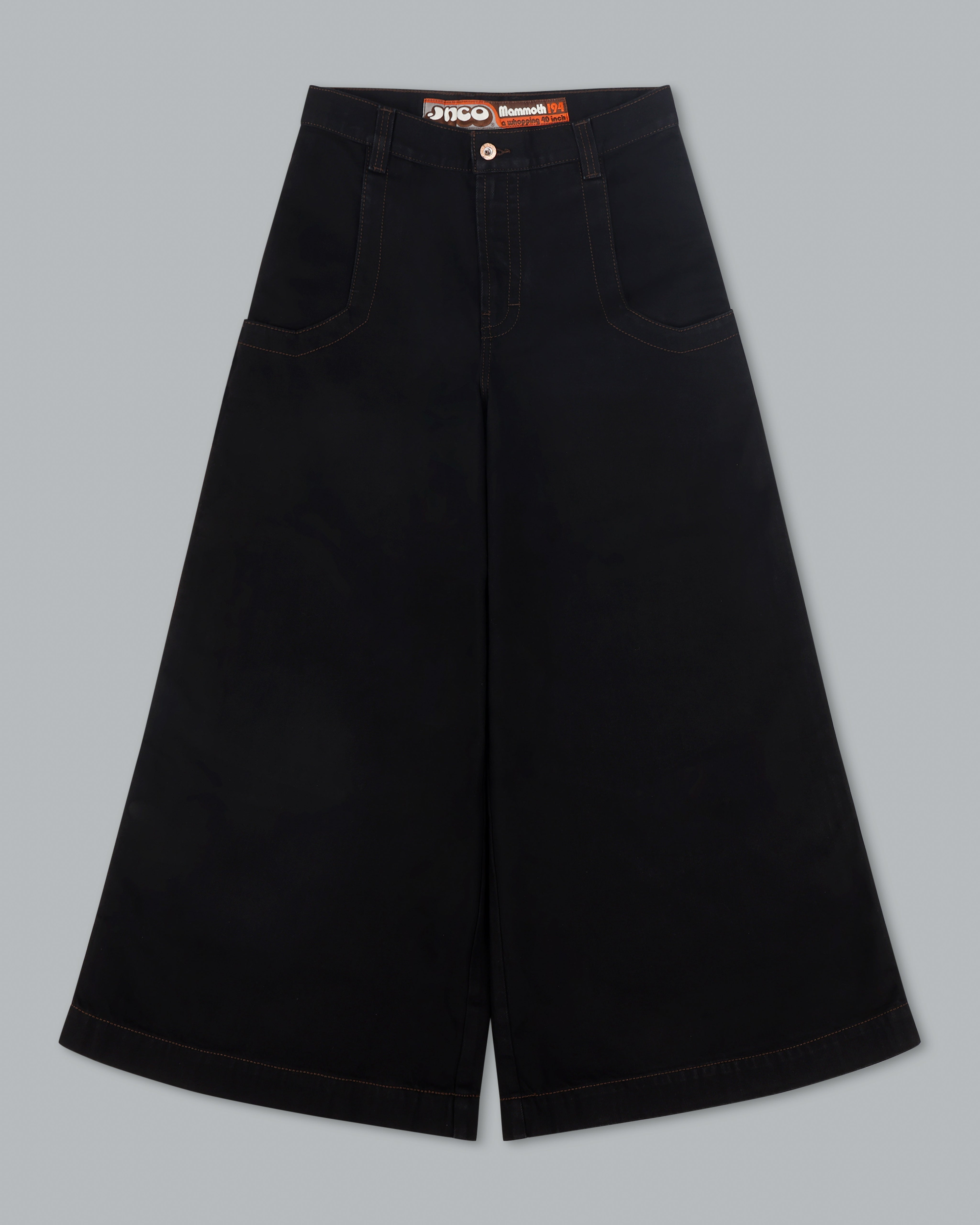 A legendary JNCO Collector classic in Jet Black denim with a massive 40" bottom opening. 13 oz. 100% cotton rope-dyed and starch-waxed for a luxe feel. Heavy contrast stitching and unique construction details. Back left pocket features the iconic 31,000-stitch Mammoth embroidery. Collectible Mammoth flasher attached. Limited Edition – very limited stock.