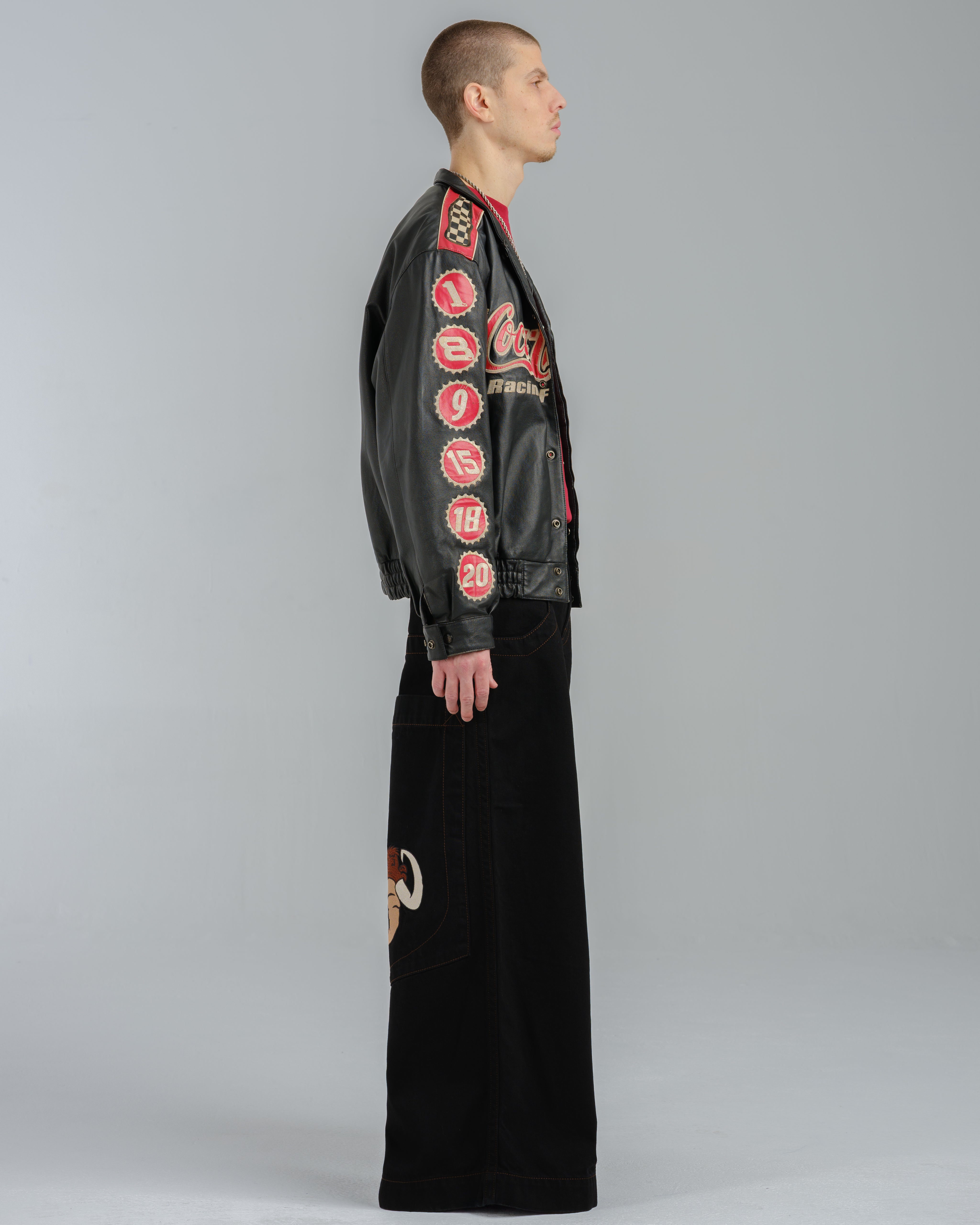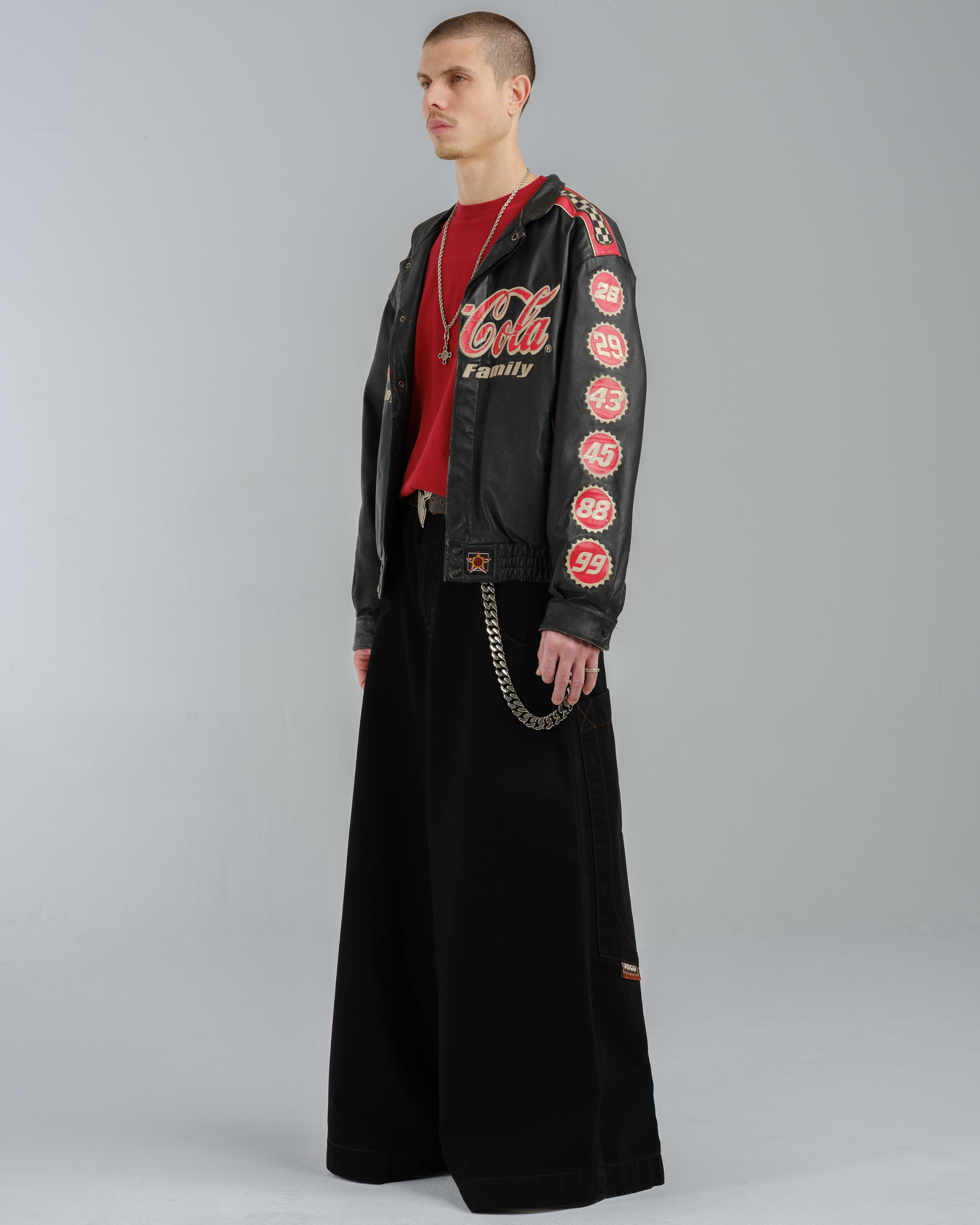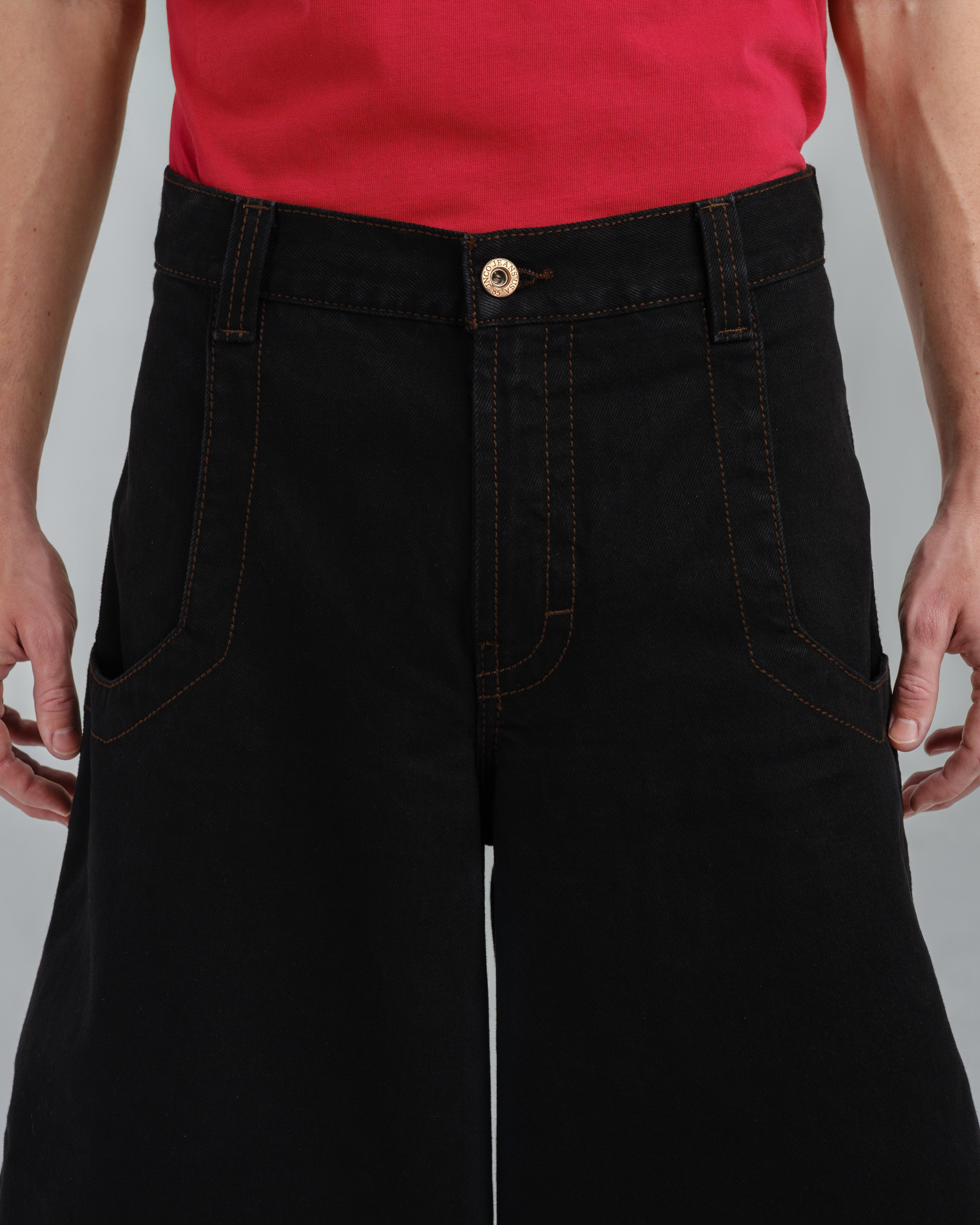 A legendary JNCO Collector classic in Jet Black denim with a massive 40" bottom opening. 13 oz. 100% cotton rope-dyed and starch-waxed for a luxe feel. Heavy contrast stitching and unique construction details. Back left pocket features the iconic 31,000-stitch Mammoth embroidery. Collectible Mammoth flasher attached. Limited Edition – very limited stock.