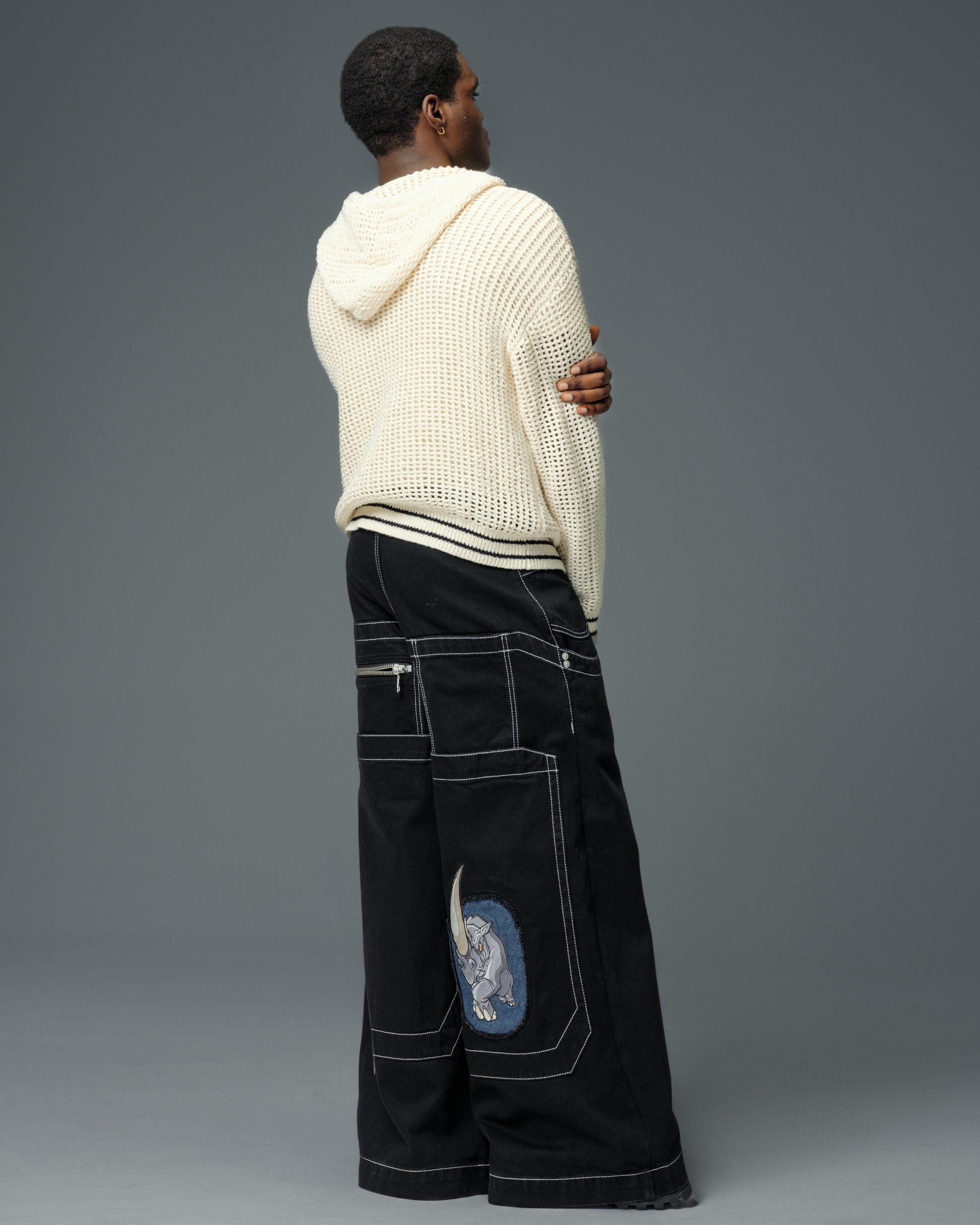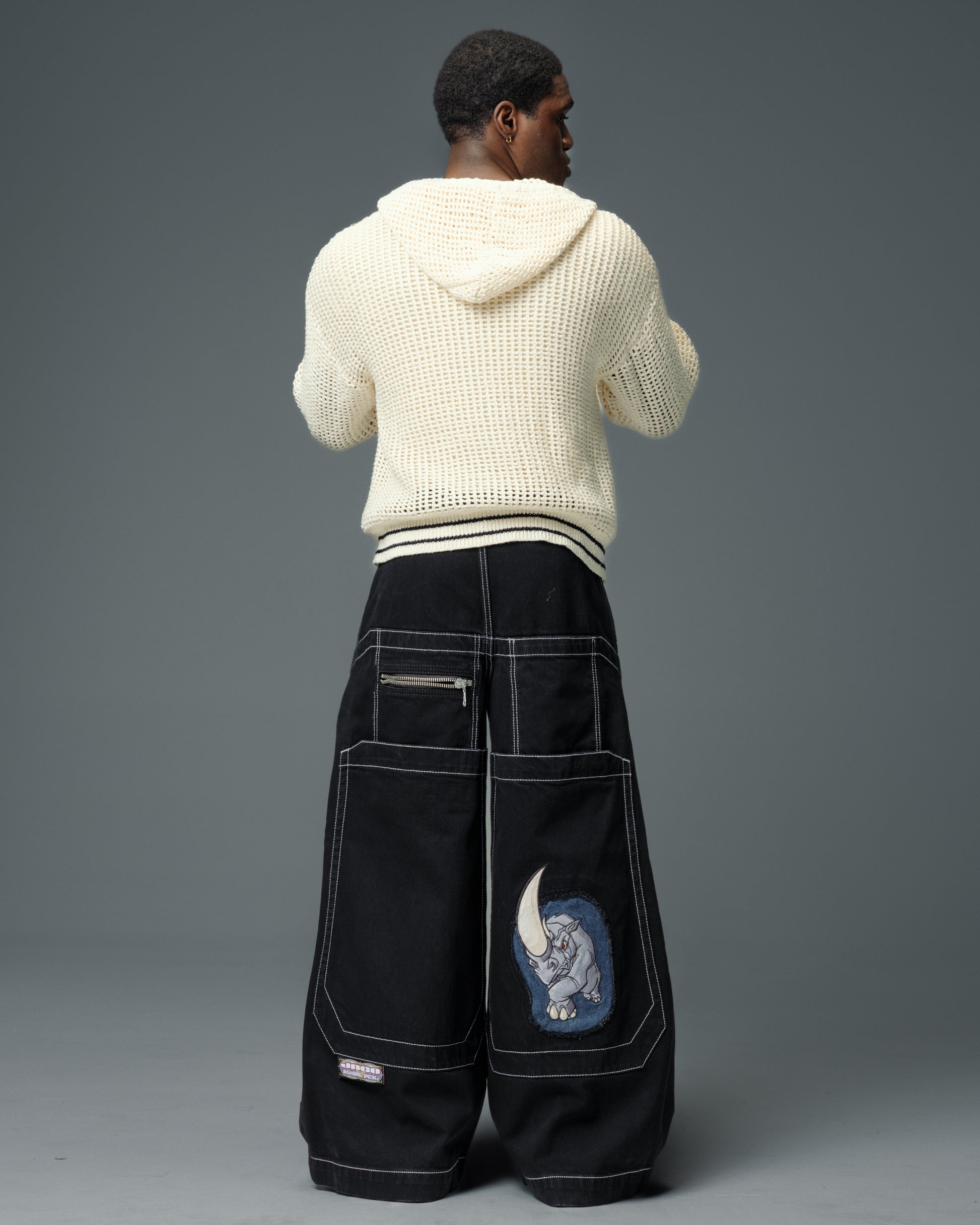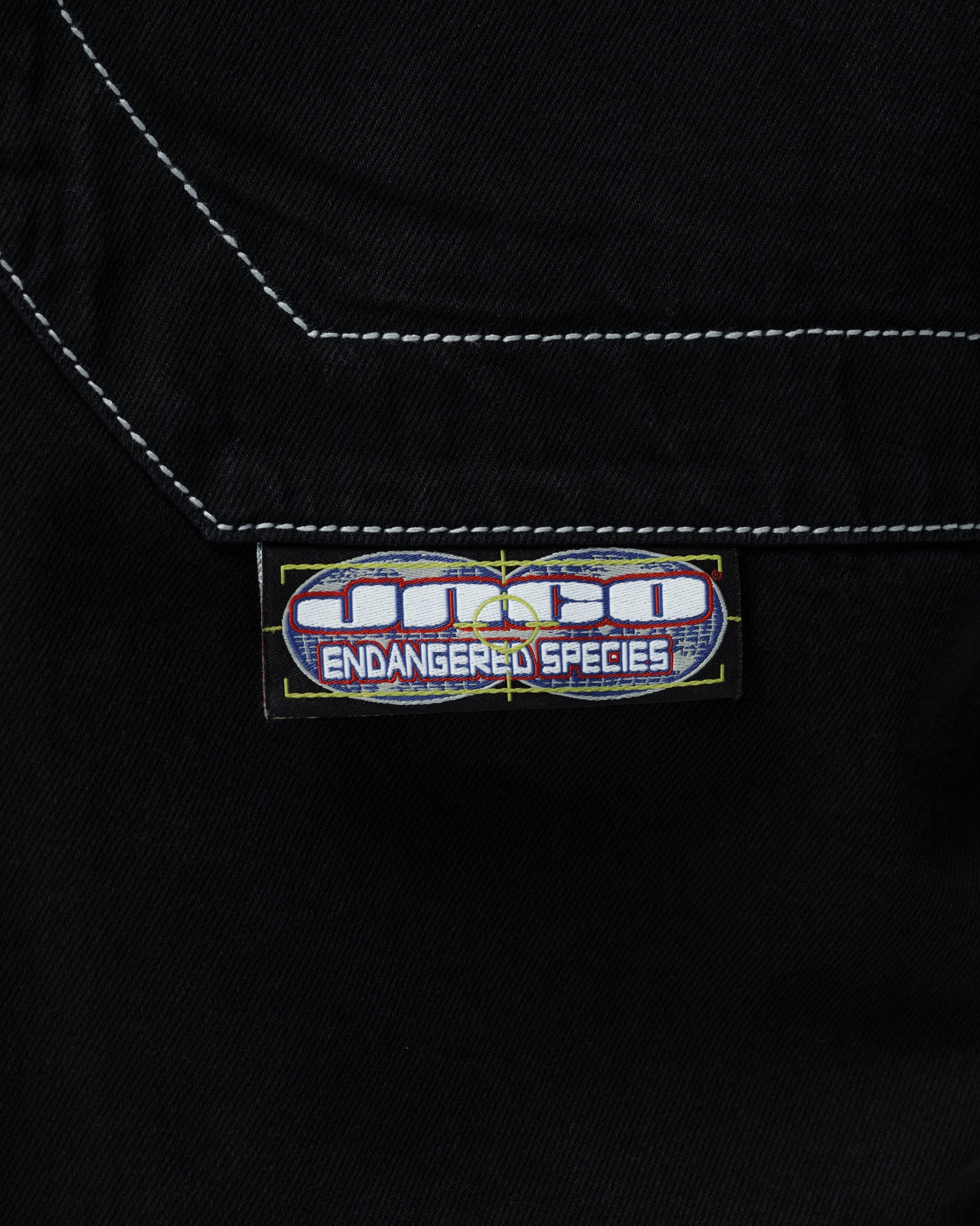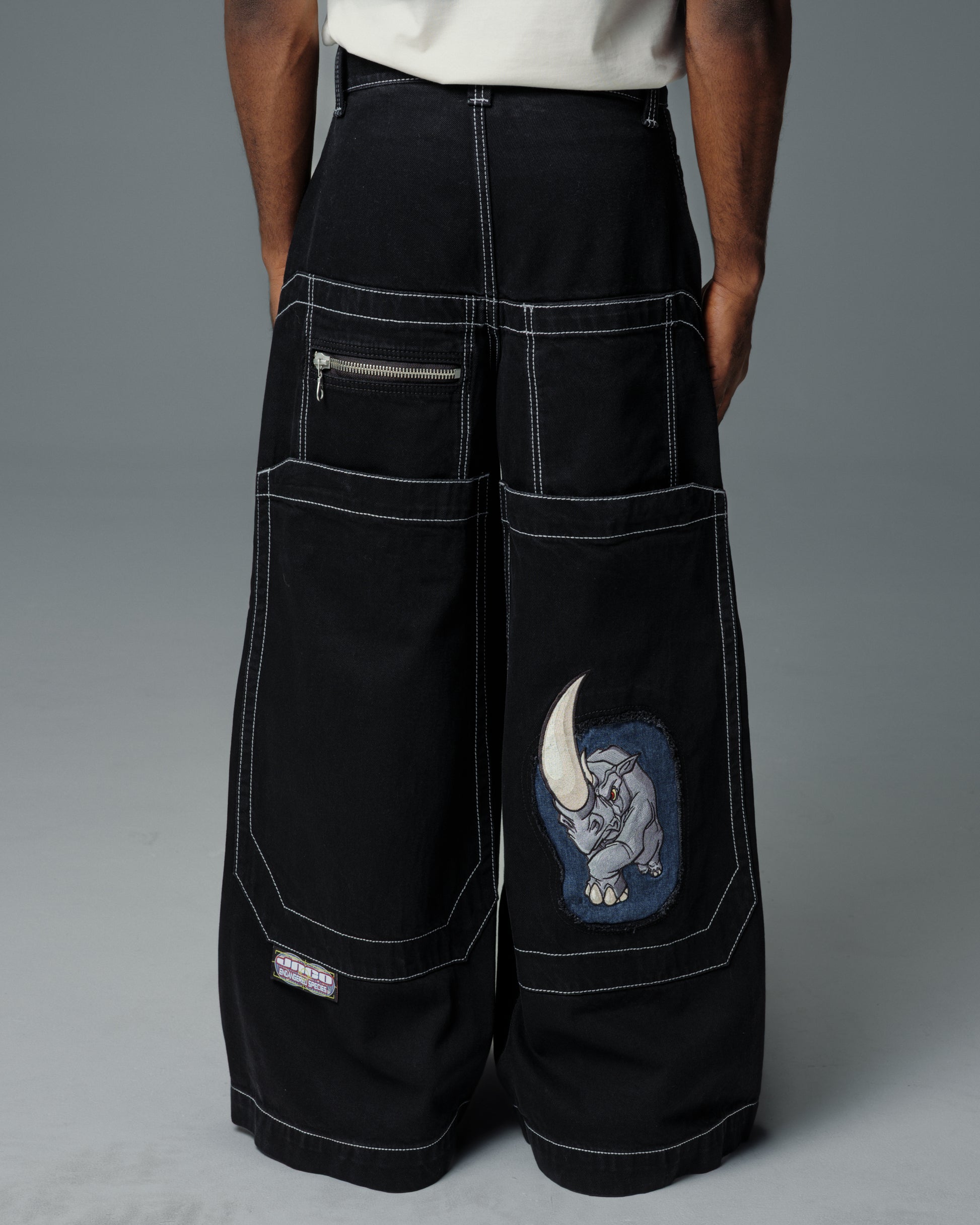 Collector’s Edition style from the Original JNCO Endangered Species Collection. 34" bottom opening. 13 oz. 100% cotton rope yarn dye in jet black finished with a blended starch wax giving a luxurious texture and smooth hand. Built with heavy contrast stitching throughout and completed with custom JNCO hardware, original labels, and collectible Endangered Species flasher. Massive back pockets define the silhouette, including a secure wallet zipper pocket at the rear yoke opposite the iconic Rhino cut-out embroidery, which required over 62,000 stitches to reproduce the artist’s original sketch of this powerful animal breaking through the pocket design. Limited Edition – very limited stock.
