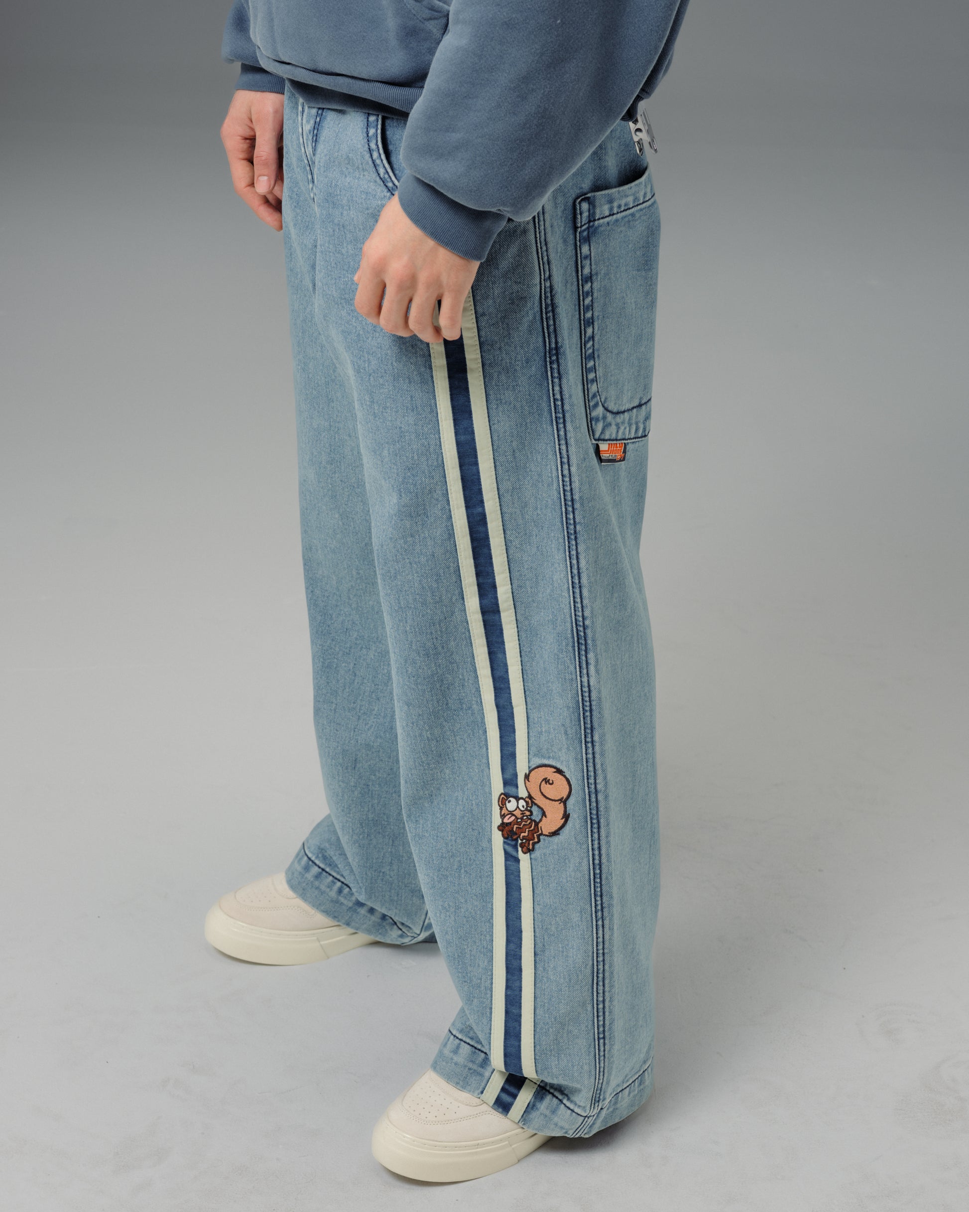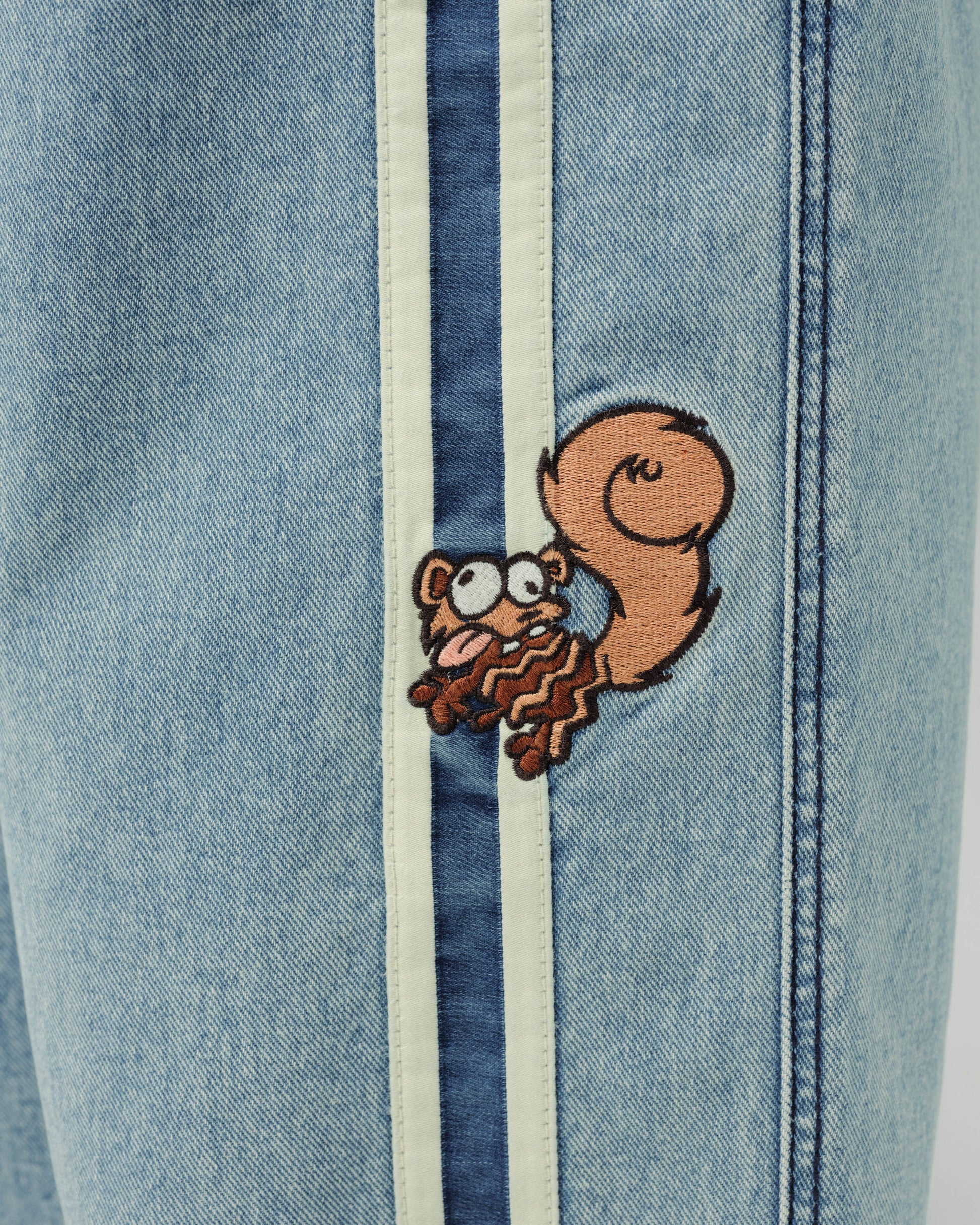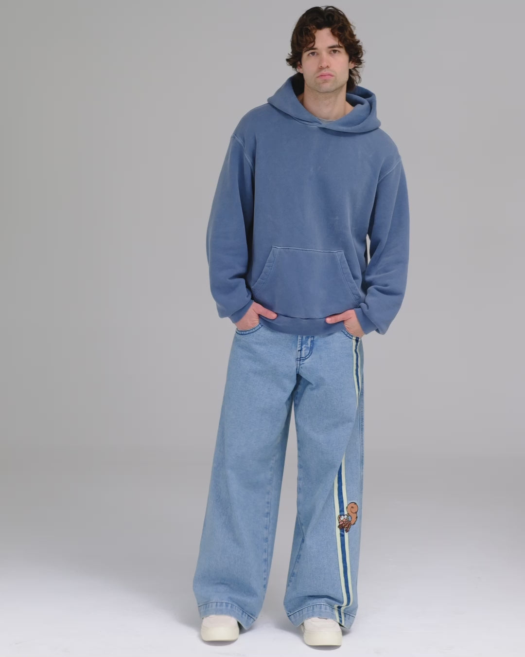 A Collector’s Edition style in Antique wash. 24” bottom opening. 14 oz. 100% cotton. 3x1 left-hand weave. Features heavy contrast stitching, the famous Roadkill leg tape in indigo thread that wears and fades over time, and the signature embroidered Roadkill squirrel— tire marks and all. All original Roadkill labels and collectible flasher included. Limited Edition— very limited stock.