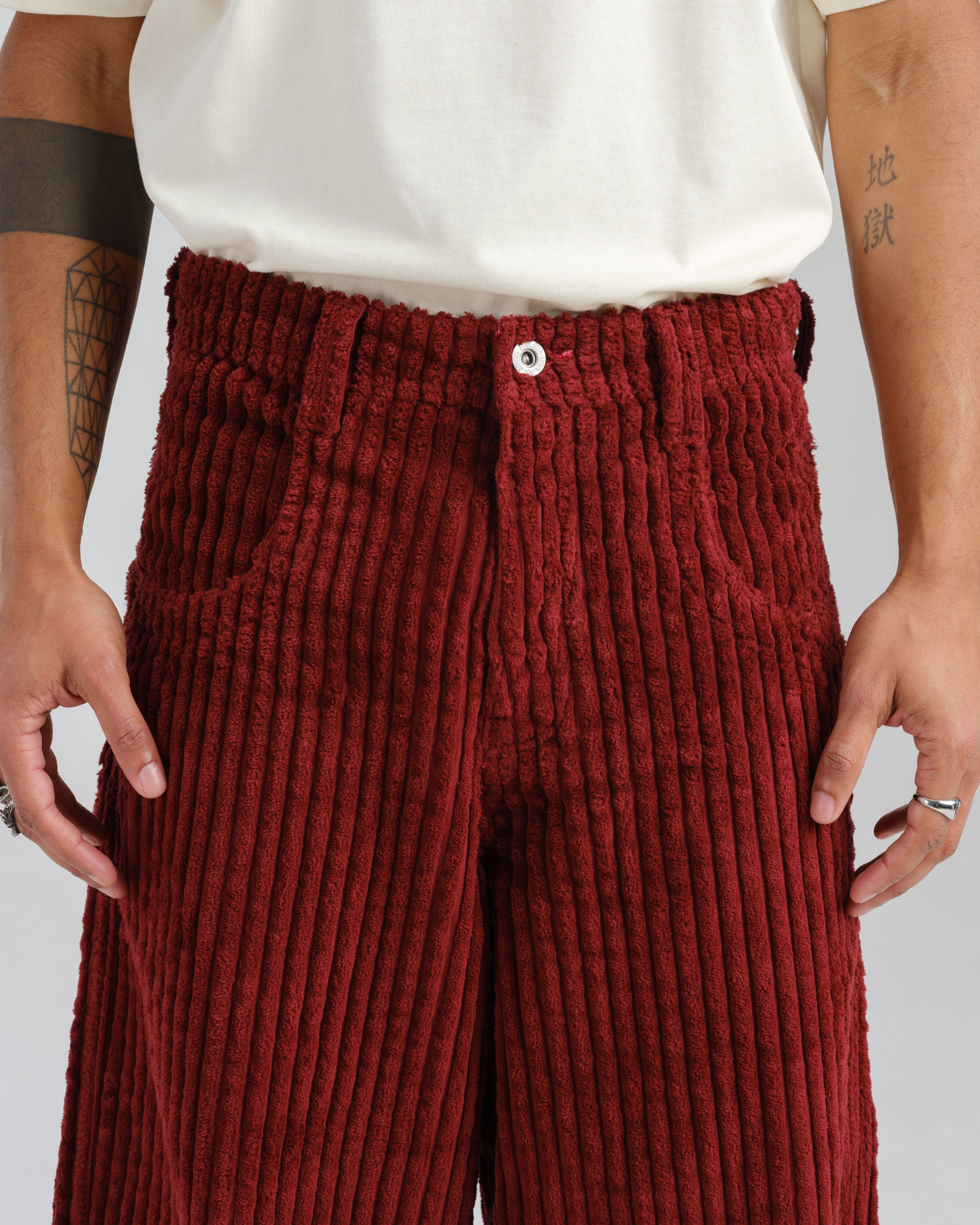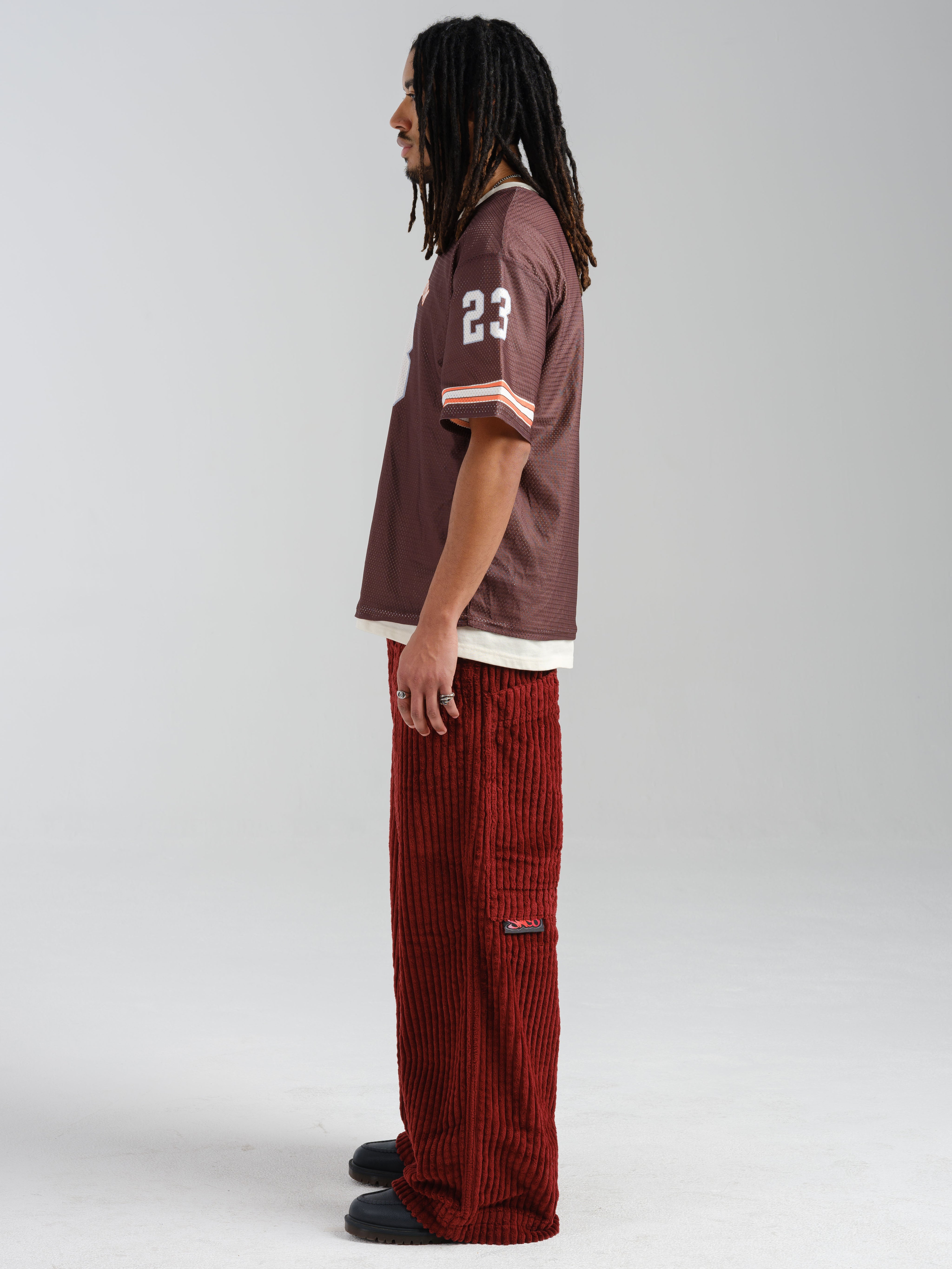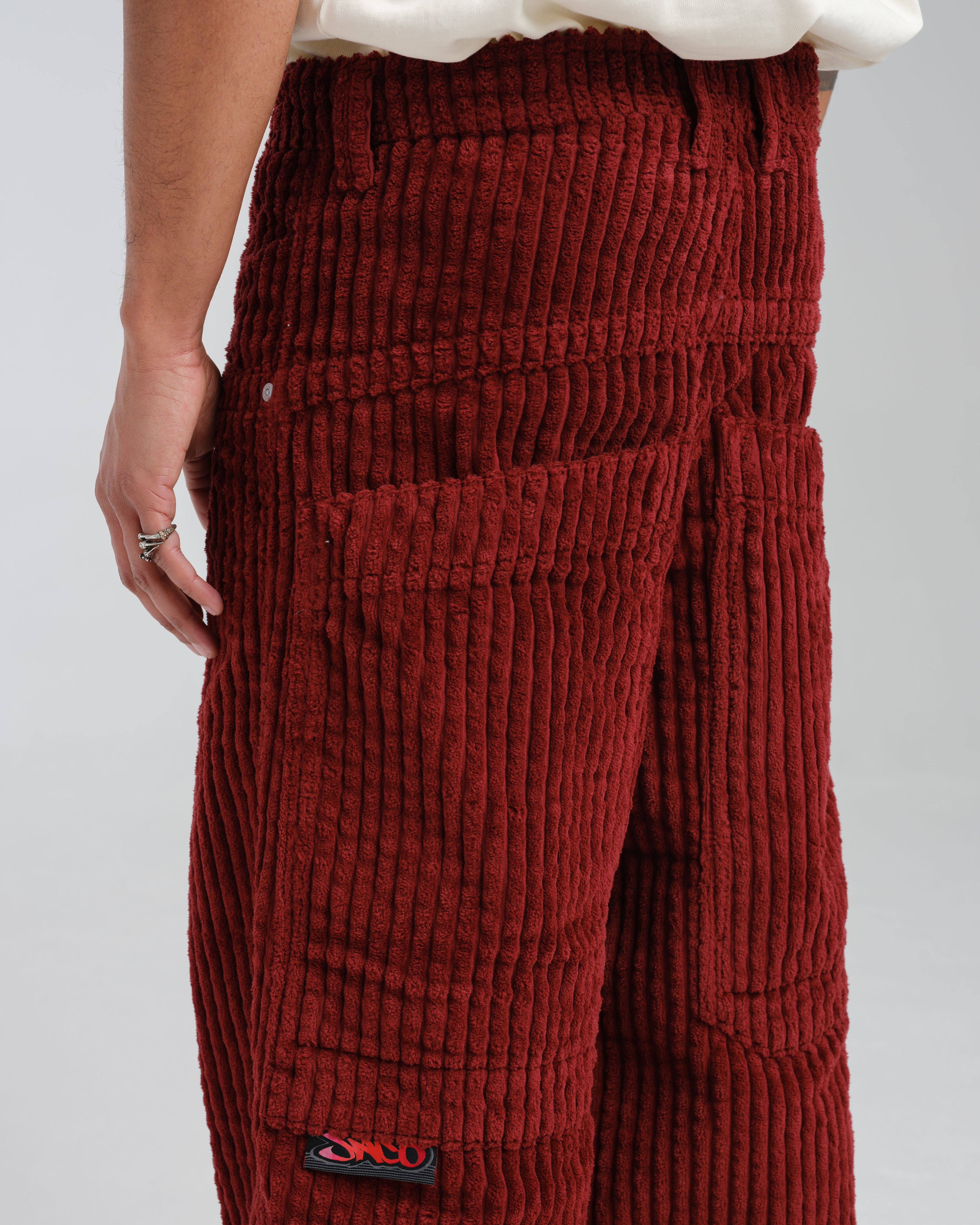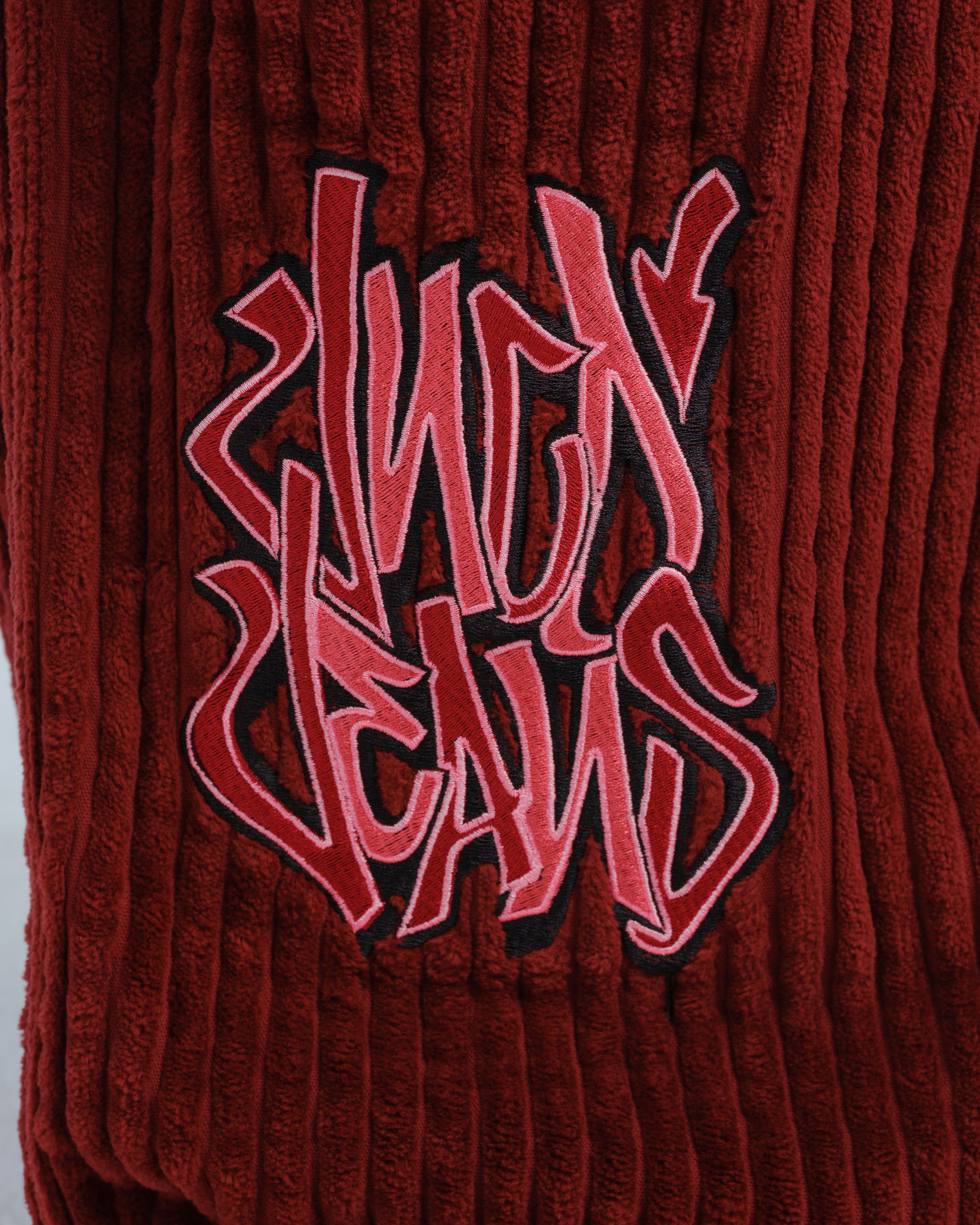 Collector’s item from the iconic JNCO Roots line. Heavy 2-Wale corduroy in burgundy, 13oz 100% cotton, soft to the touch. Classic 26" bottom opening with heavy double stitching. Features “Rollin' Style 360” graffiti embroidery on front leg — over 78,000 stitches. Includes collectible Rollin' flasher. Limited Edition – limited stock.