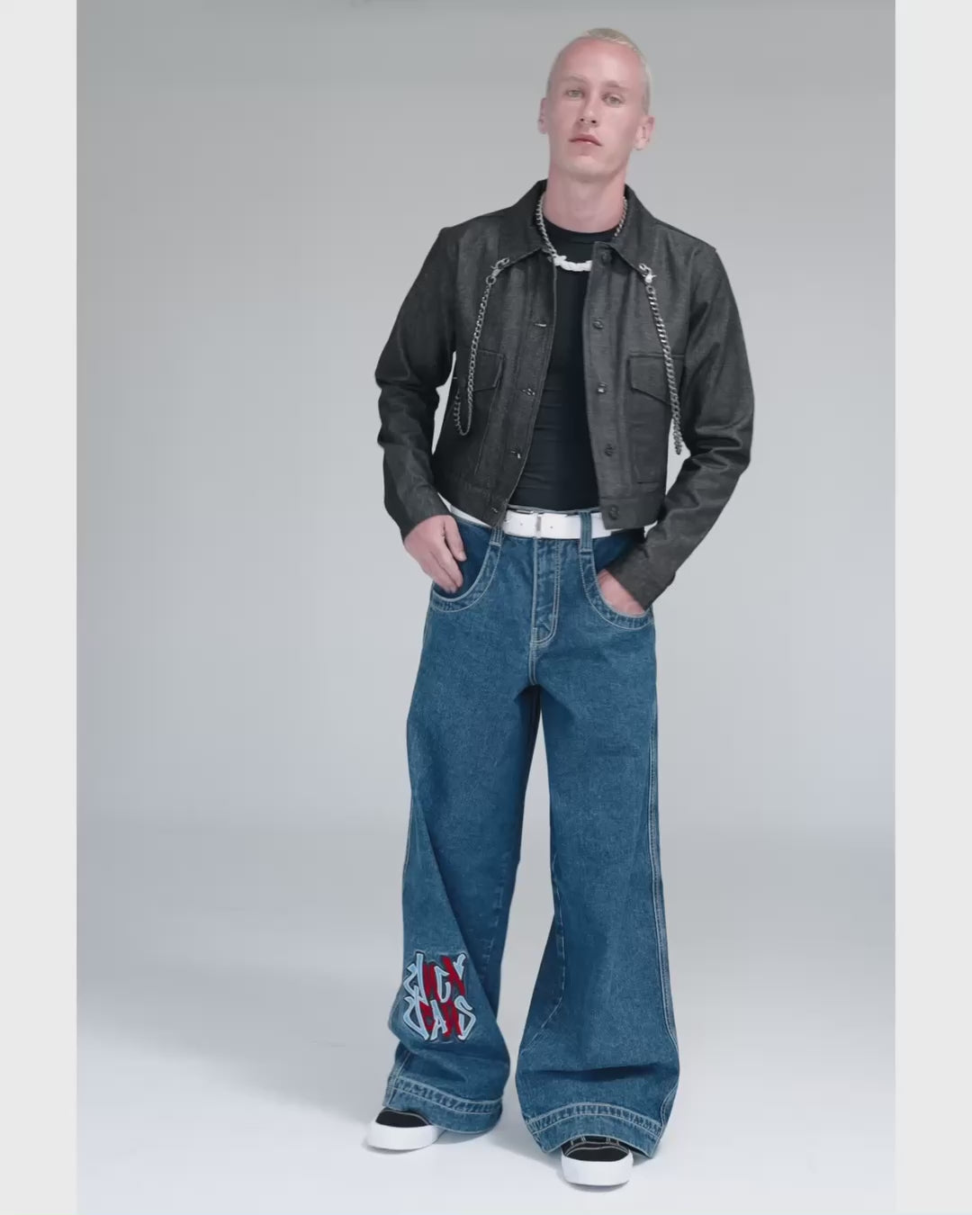 Collector’s item from the iconic JNCO Roots Collection. Dark Stone Wash, 14oz 100% cotton denim with a 3x1 left-hand weave. Classic 26" bottom opening and heavy double contrast stitching. Features “Rollin' Style 360” graffiti embroidery on front leg with nearly 78,000 stitches. Collectible Rollin' flasher included. Limited Edition – limited stock.