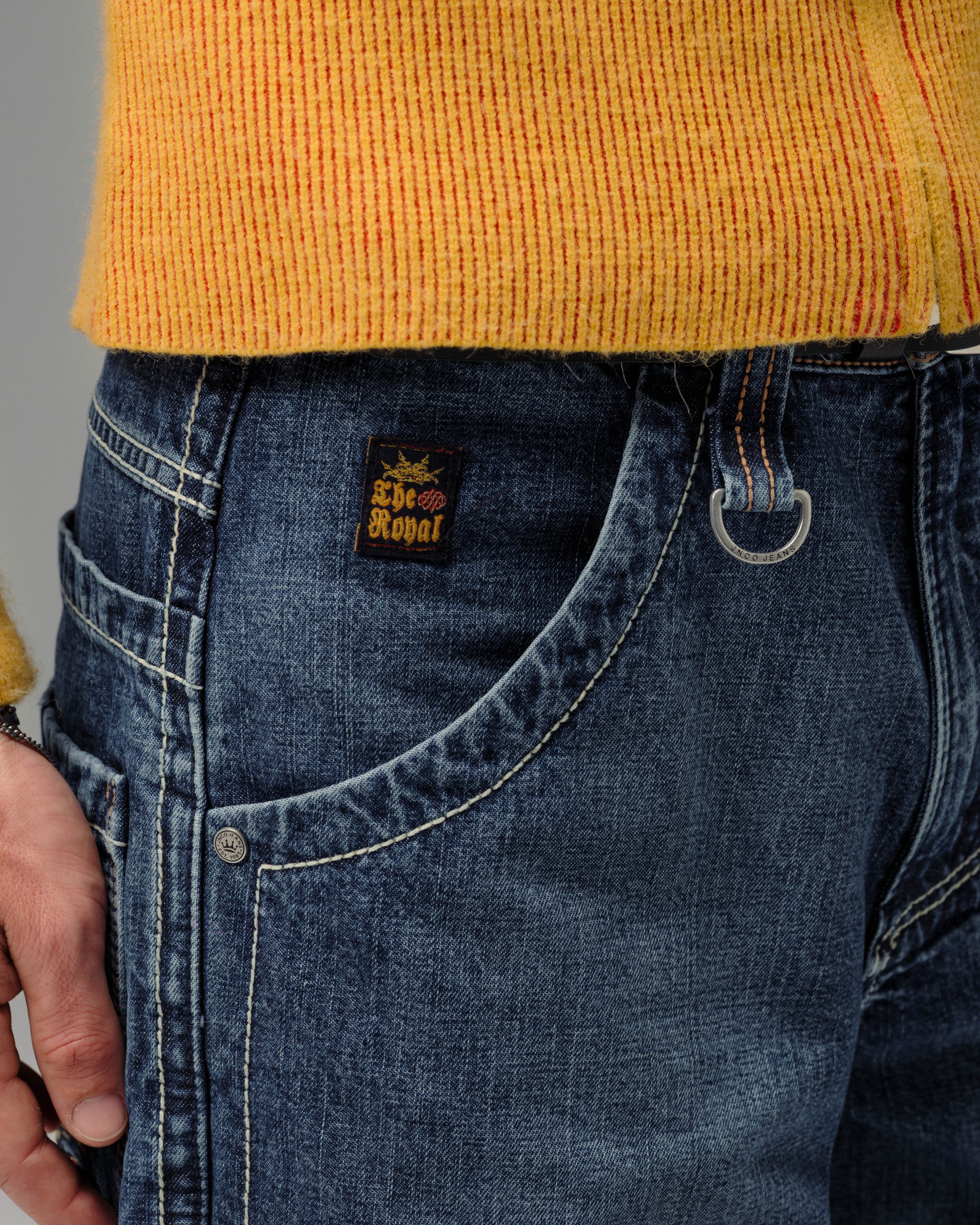 Collector’s item from JNCO’s workwear-inspired line. Hand-Sand Medium Dark Stone Wash, 23" bottom opening. 12.5oz 100% cotton cross-hatch denim with four-thread contrast stitching. 4 back pockets, “JNCO Jeans '85” dragon patch, crown plaque, and chain loops (chain not included). Original “JNCO Royal” embroidery with 80,000 stitches. Collectible matte and gloss flasher included. Limited Edition – very limited stock.