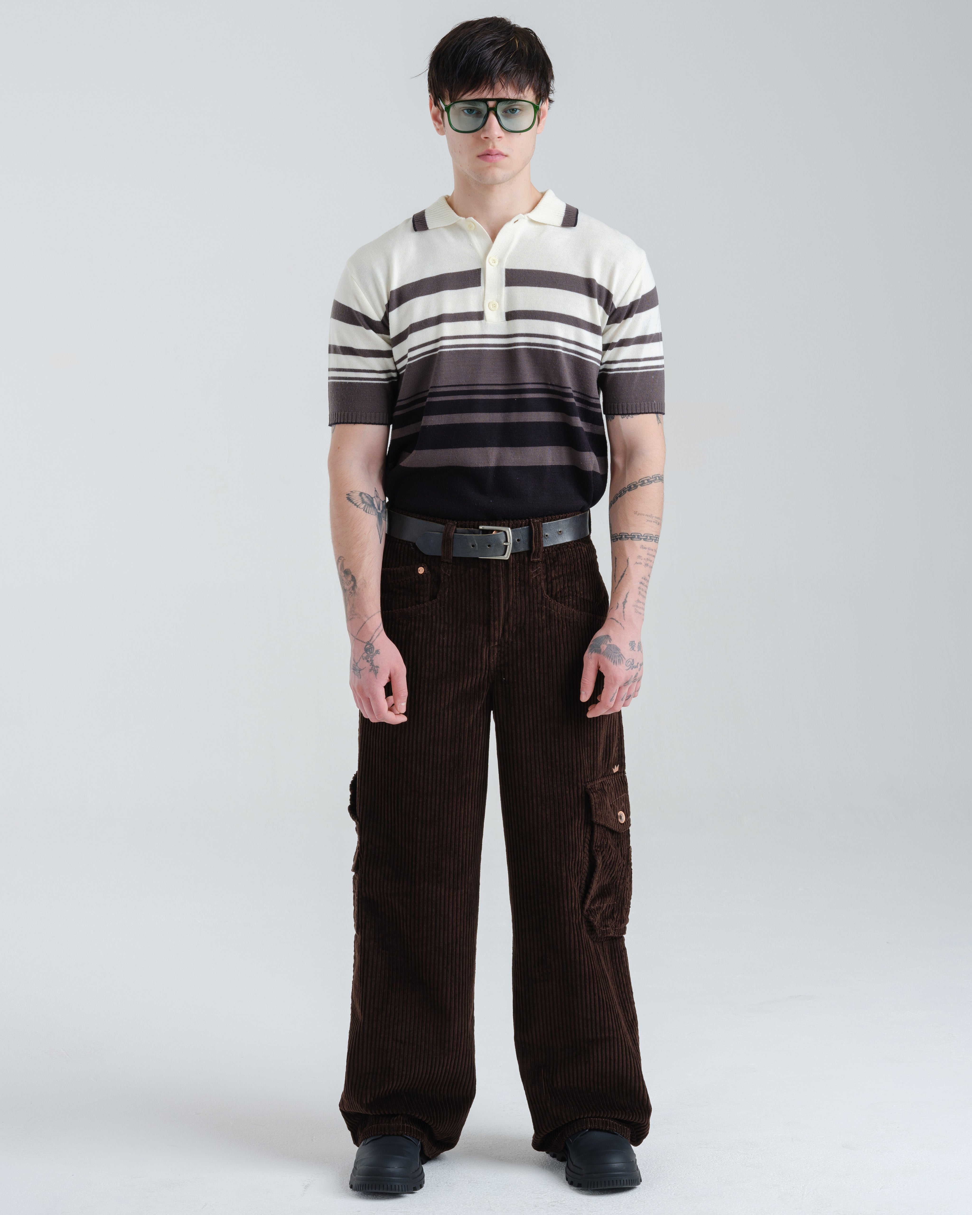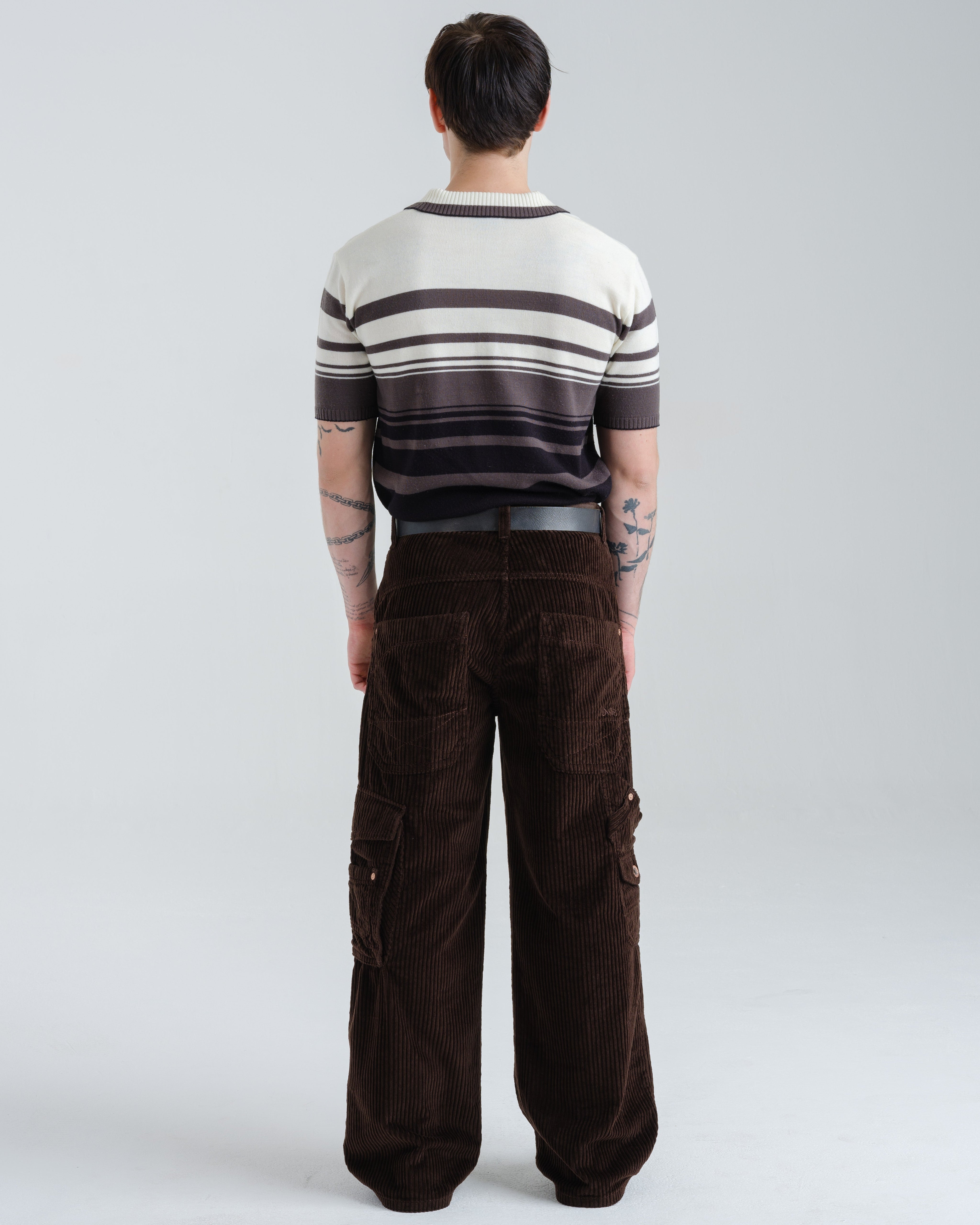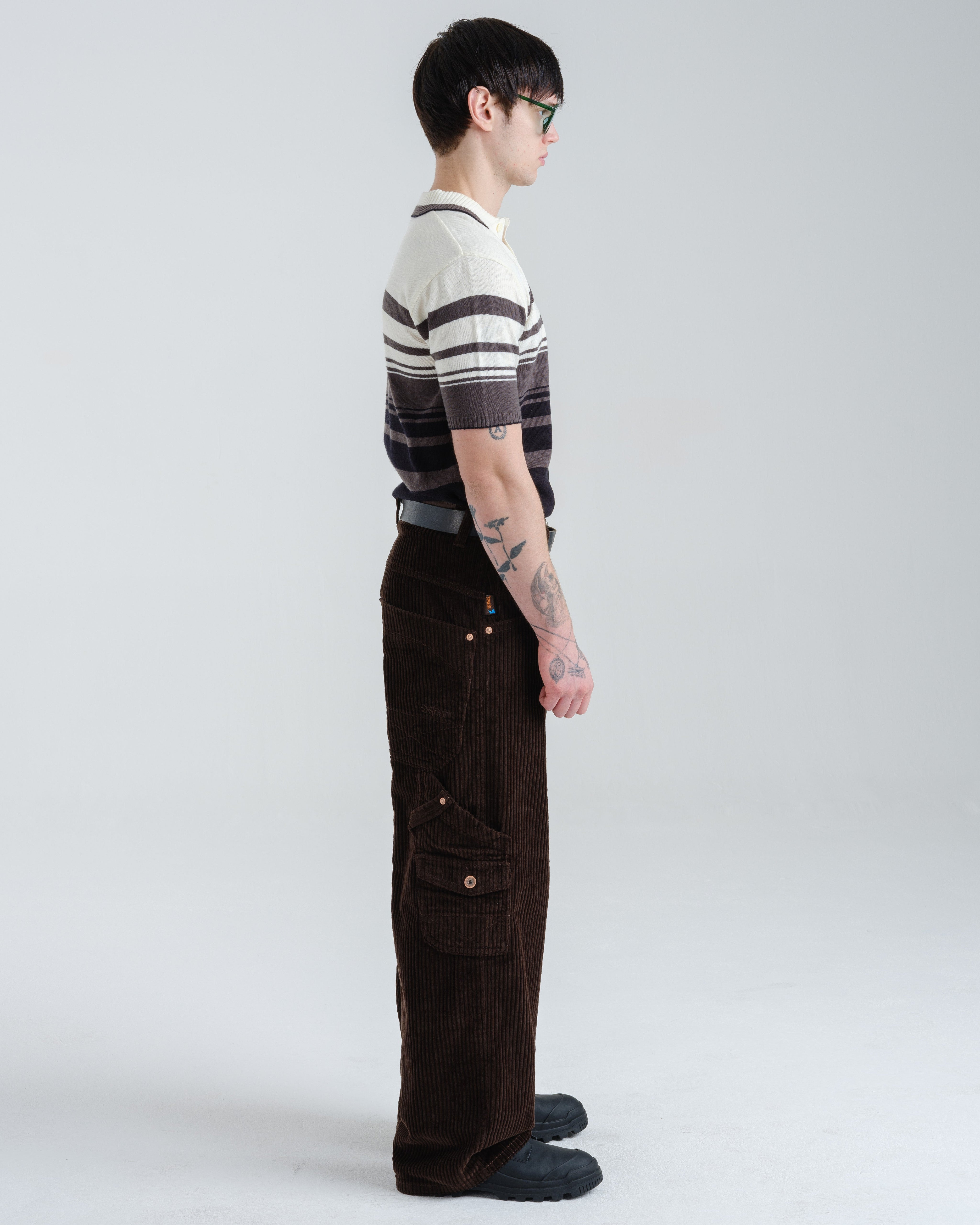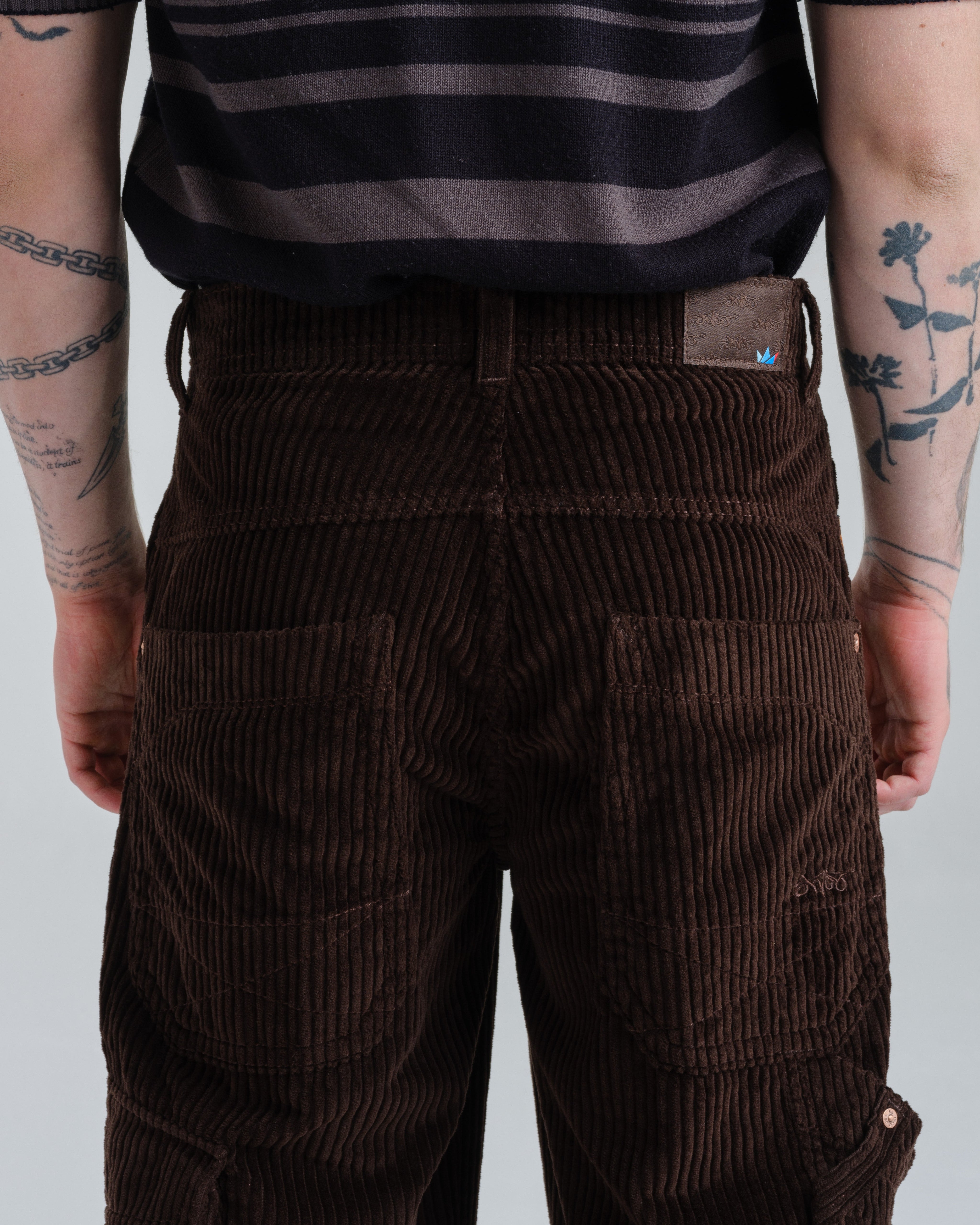 A modern twist on a classic workwear staple. 12oz 100% 4-Wale Corduroy in rich Java Brown. 23" stove-pipe bottom opening with a relaxed, wide-leg fit. Features a signature carpenter pocket and asymmetrical cargo pocket, and vintage-inspired details like angled front pockets, a hand-watch pocket, and oversized back patch pockets with mitered corners and “X” stitching. Finished with tonal stitching, reinforced utility belt loops, and premium hardware.