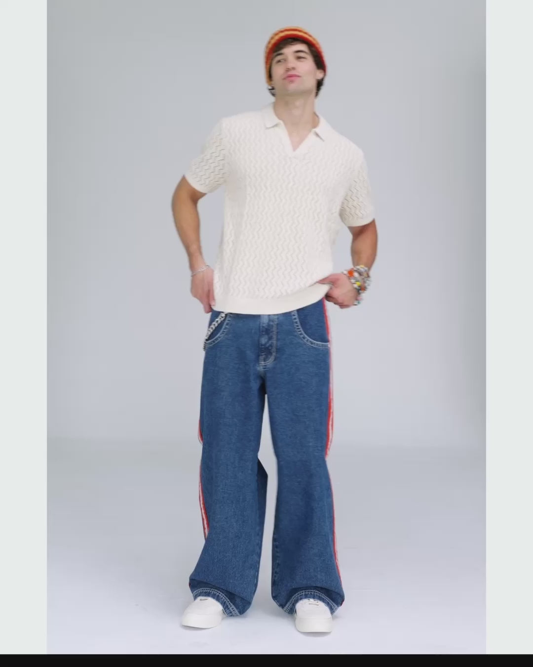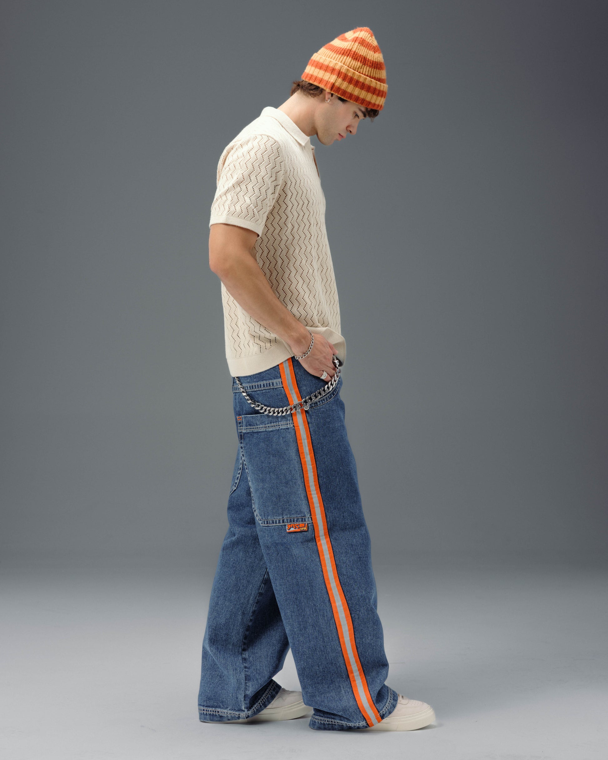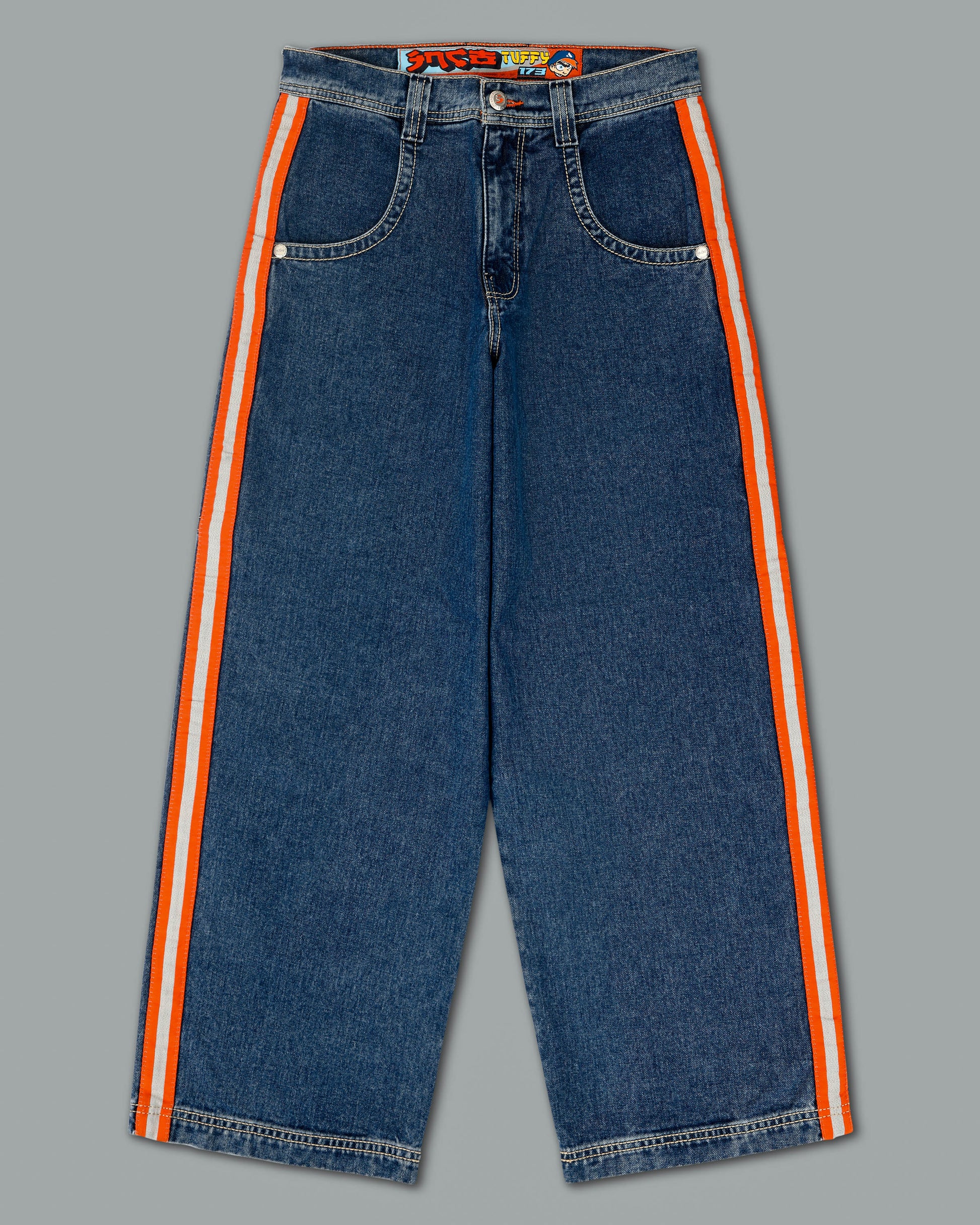 A true archival revival, the Tuffy stands as one of the most distinctive styles from JNCO’s late-’90s era of innovation. Featuring a 23" bottom opening and our signature Dark Stone denim wash, it’s developed for a naturally broken-in texture and effortless drape that deepens with wear. 14 oz. 100% cotton. 3x1 left hand weave. An underground favorite, the Tuffy stands apart with bright orange and reflective stripes, inspired by street-crew uniforms and highway-signage visibility. Every detail of this reissue honors the original: custom hardware, heavy contrast stitching, original Tuffy embroidery and woven labels, and the archival collectible flasher. Collector’s Edition. Limited quantities.