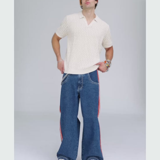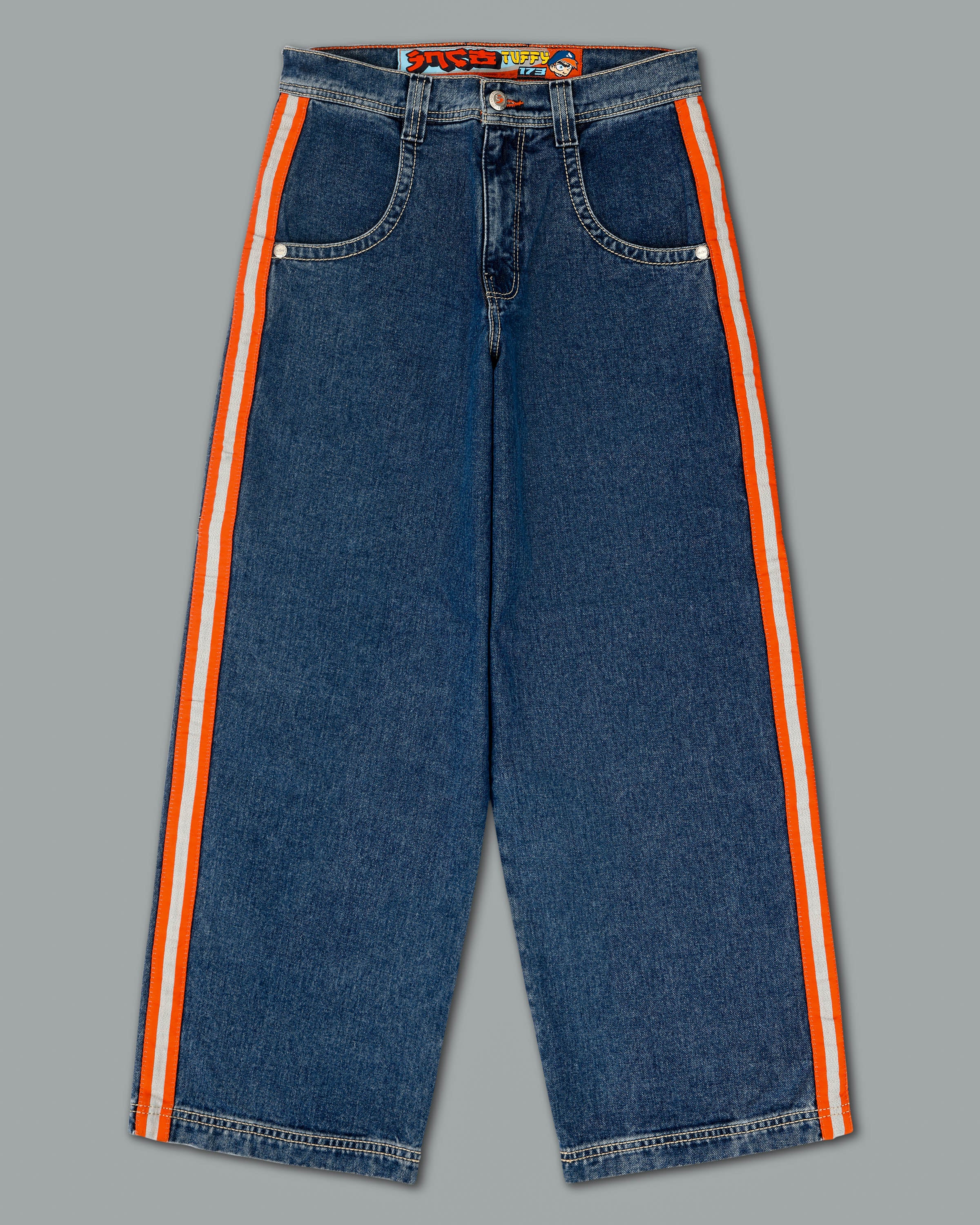 A true archival revival, the Tuffy stands as one of the most distinctive styles from JNCO’s late-’90s era of innovation. Featuring a 23" bottom opening and our signature Dark Stone denim wash, it’s developed for a naturally broken-in texture and effortless drape that deepens with wear. 14 oz. 100% cotton. 3x1 left hand weave. An underground favorite, the Tuffy stands apart with bright orange reflective stripes, inspired by street-crew uniforms and highway-signage visibility. Every detail of this reissue honors the original: custom hardware, heavy contrast stitching, original Tuffy embroidery and woven labels, and the archival collectible flasher. Collector’s Edition. Limited quantities.