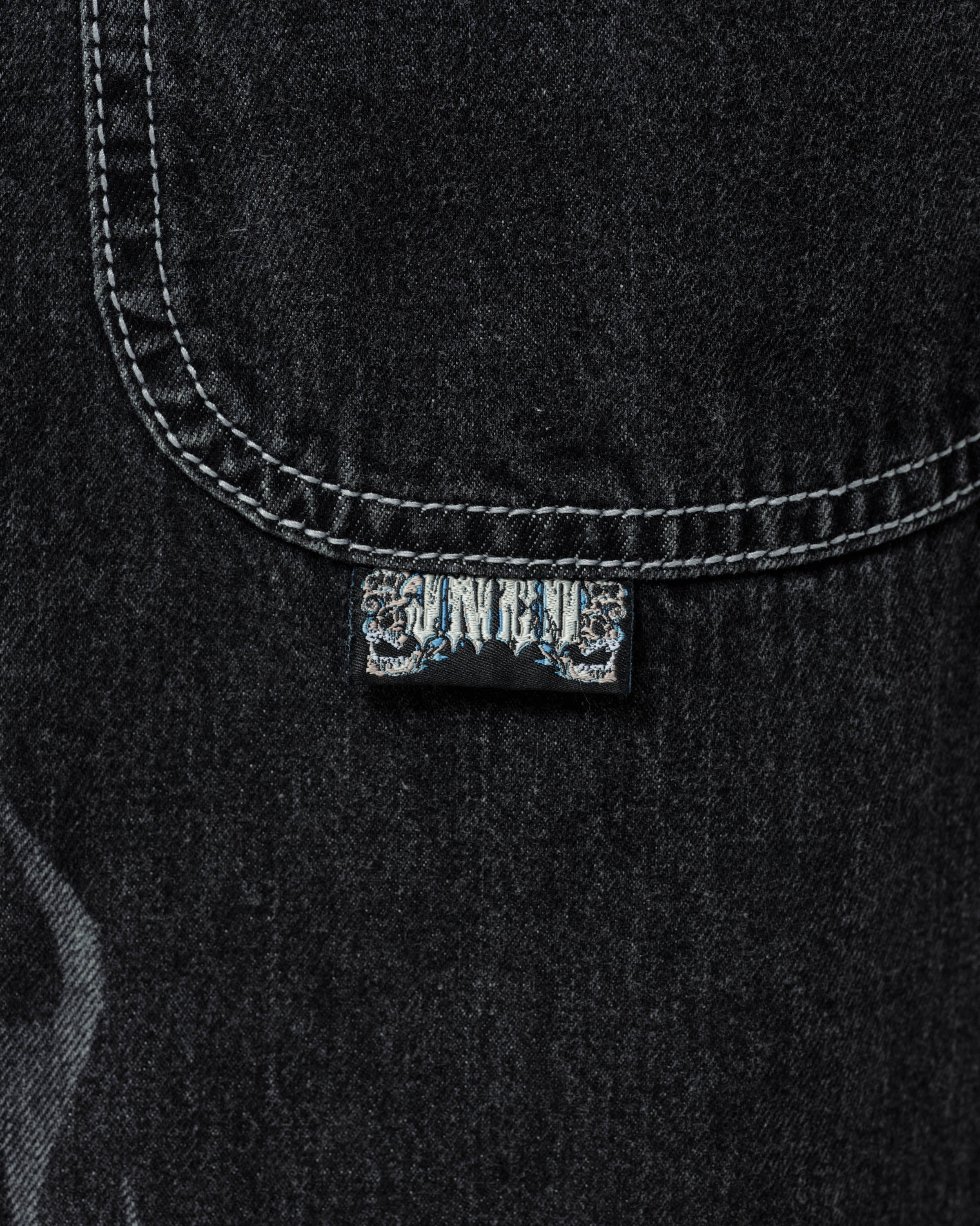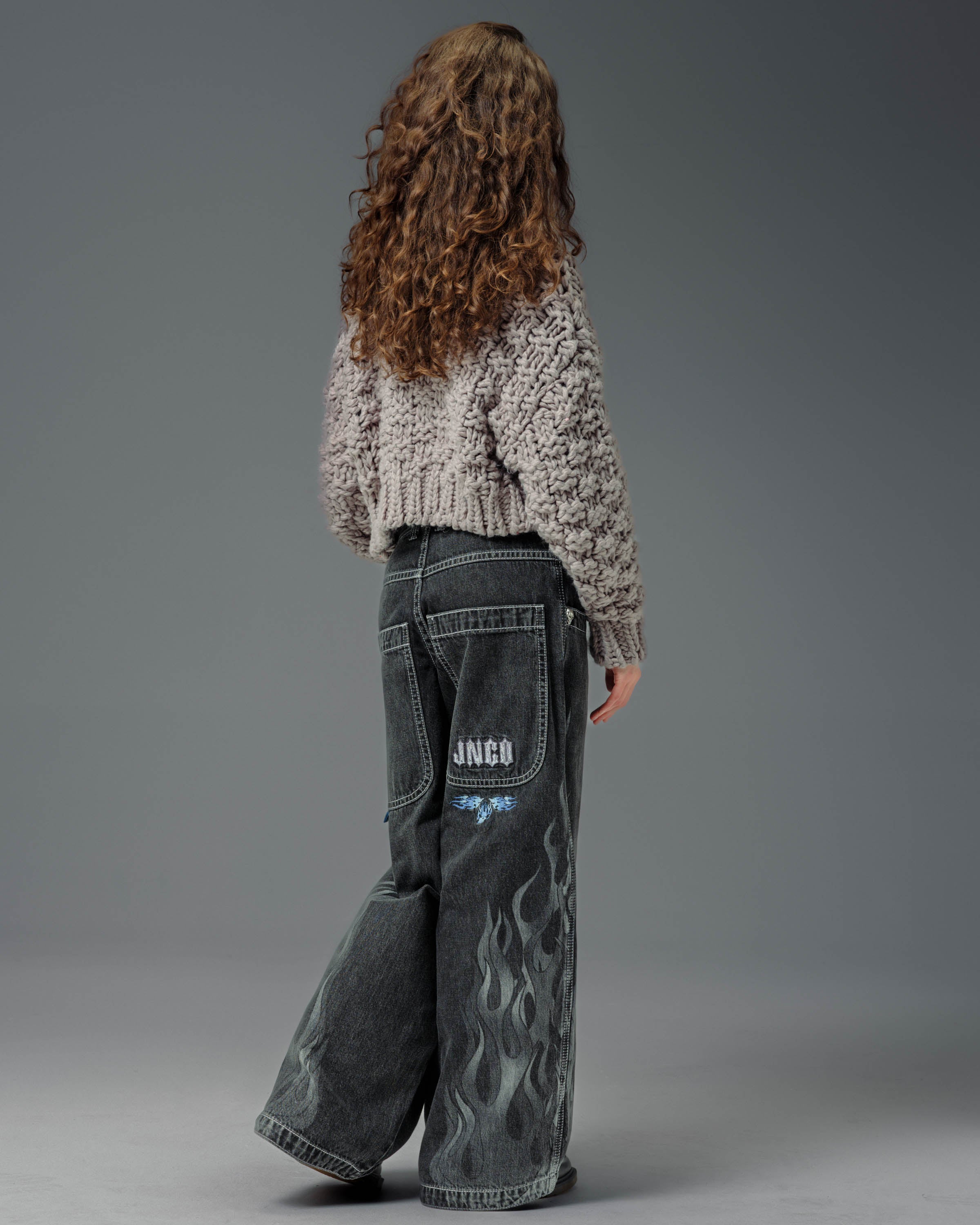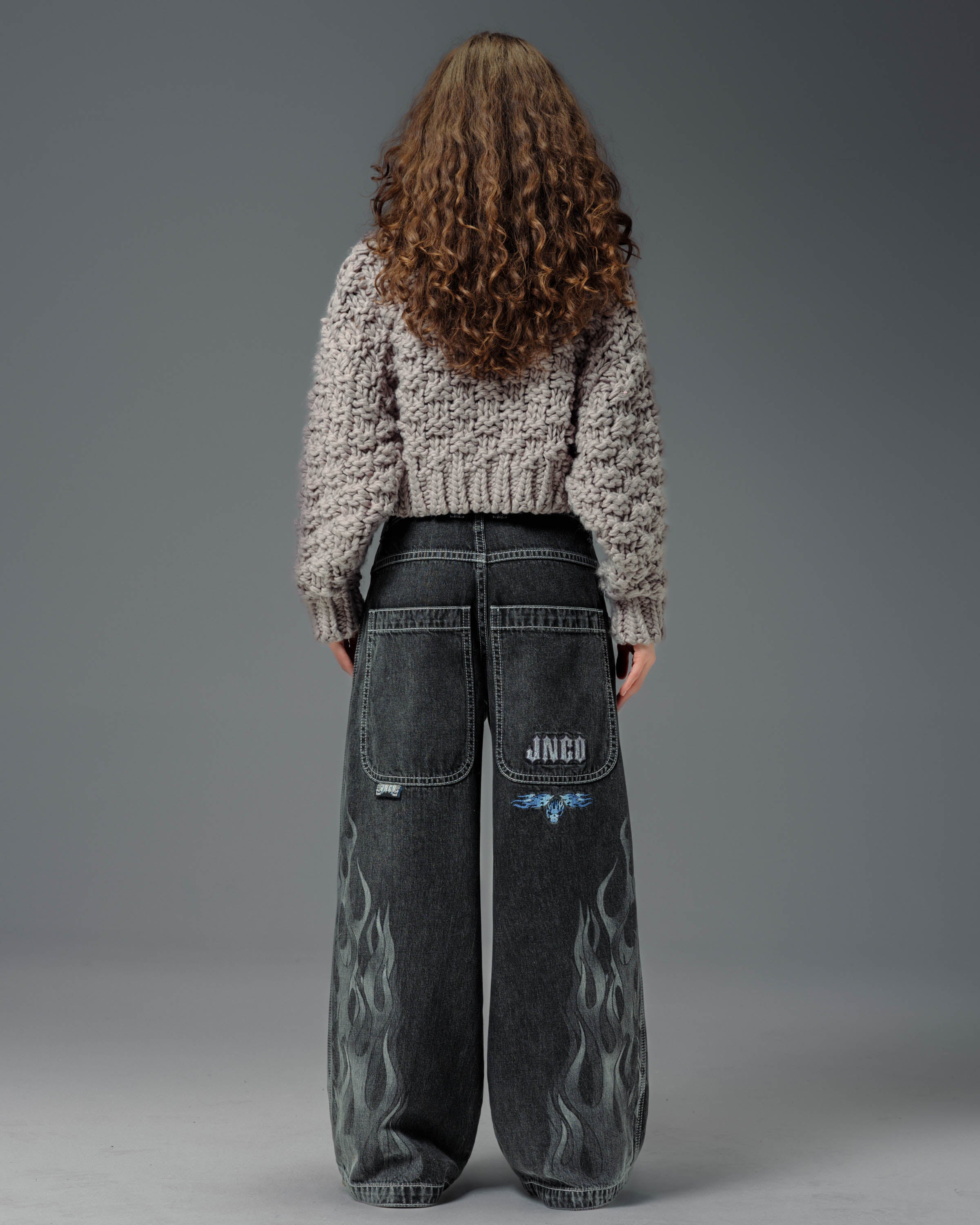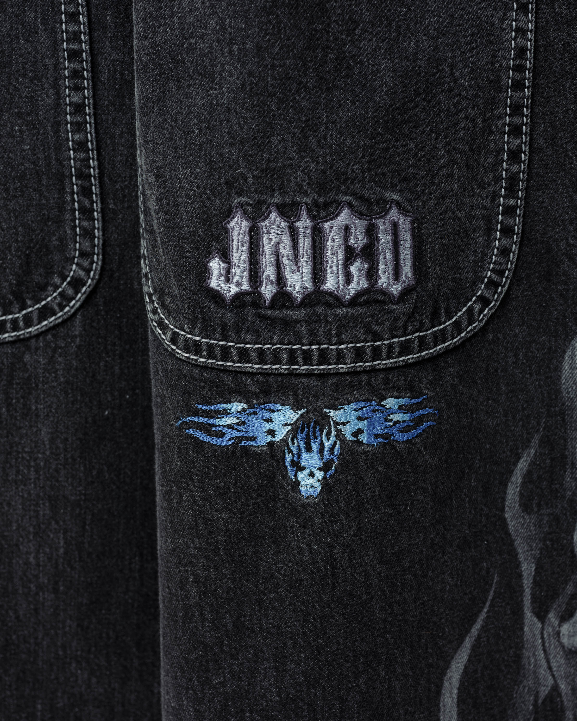 From the famous Tribal Collection. 13.5oz 100% cotton rope-dyed with a luxe starch wax finish in distressed vintage black. 26” bottom opening with contrast stitching and a classic oversized fit. Features original Tribal labels, tonal tribal flame artwork laser printed down both legs, skull and flame JNCO embroideries, and custom skull and jewel hardware with an antique finish and quartz stones. Collectible flasher included.