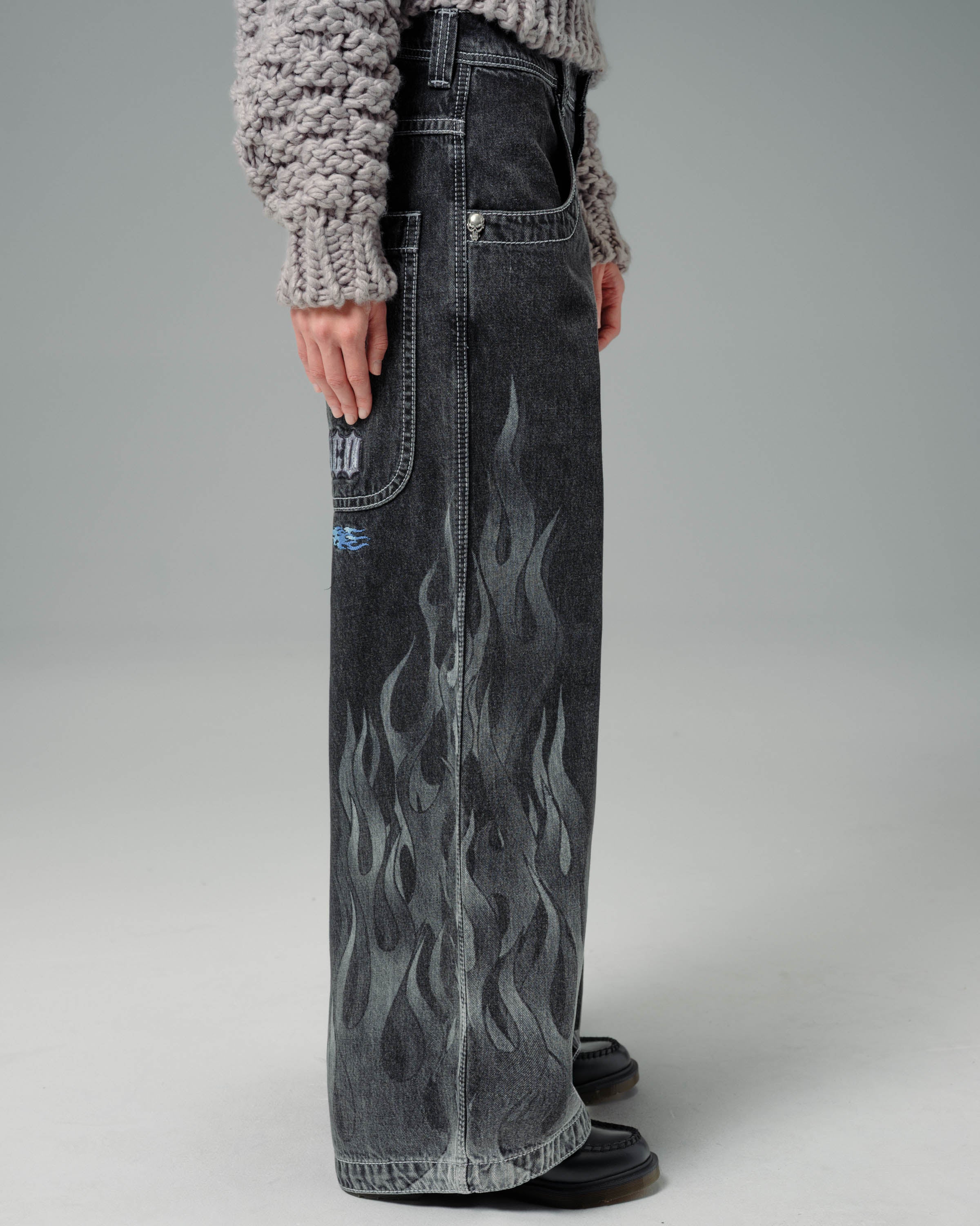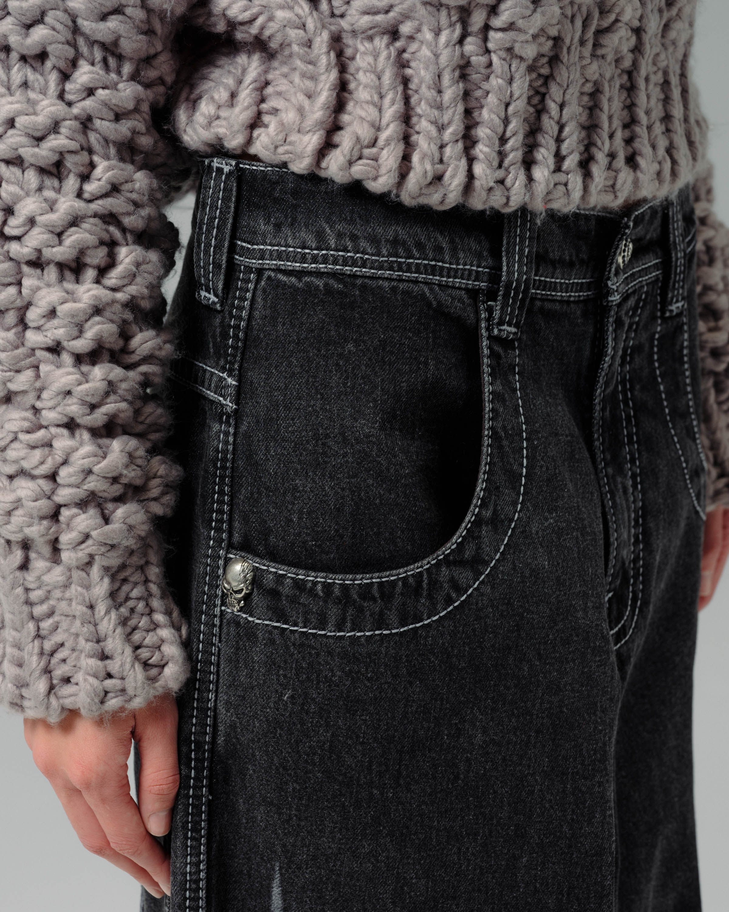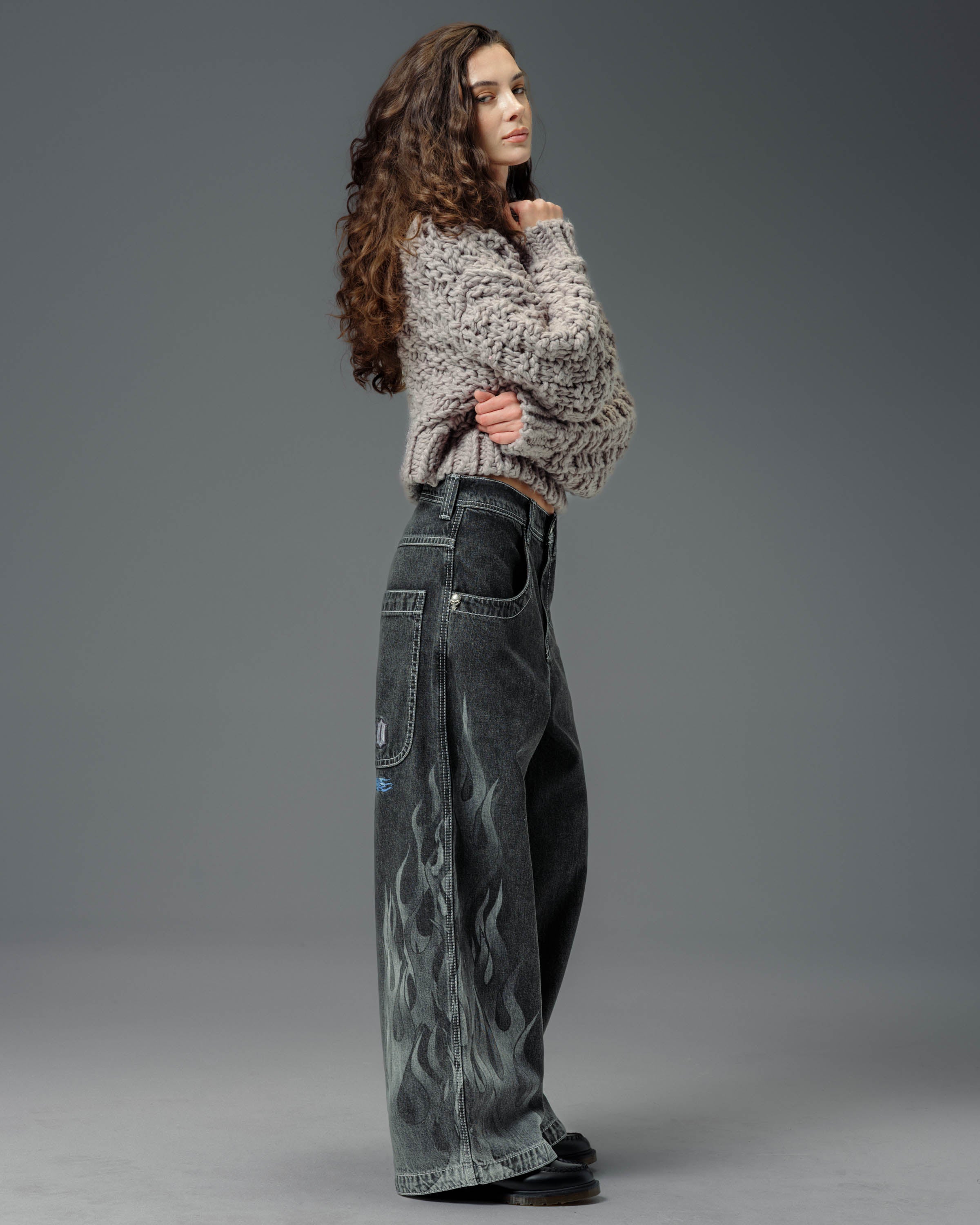 From the famous Tribal Collection. 13.5oz 100% cotton rope-dyed with a luxe starch wax finish in distressed vintage black. 26” bottom opening with contrast stitching and a classic oversized fit. Features original Tribal labels, tonal tribal flame artwork laser printed down both legs, skull and flame JNCO embroideries, and custom skull and jewel hardware with an antique finish and quartz stones. Collectible flasher included.
