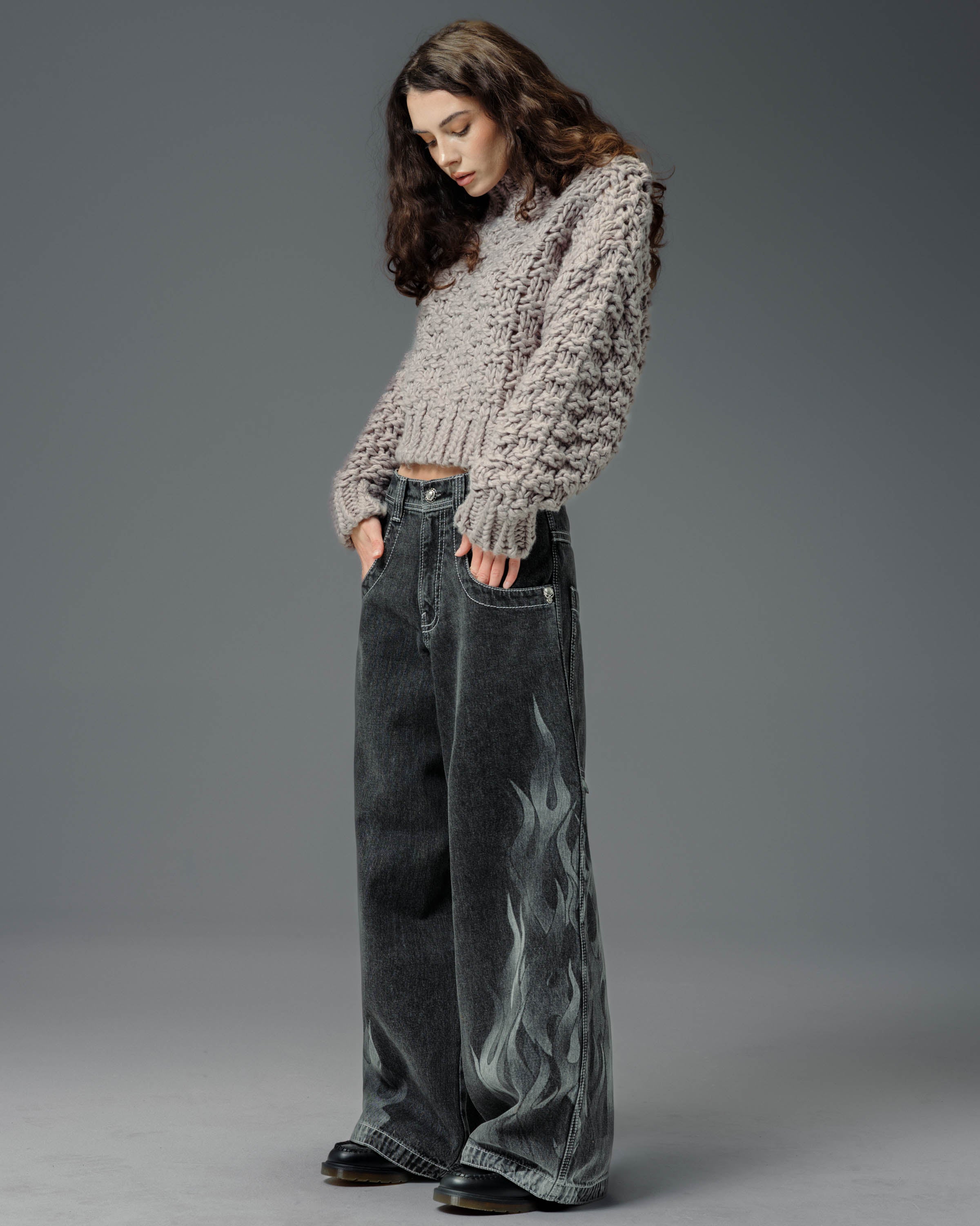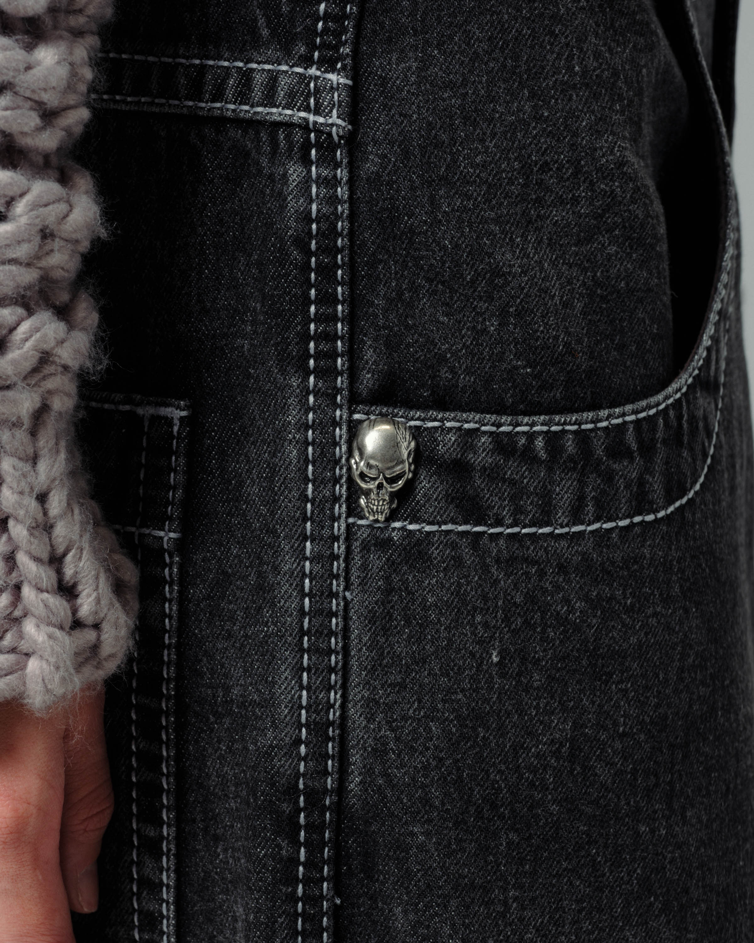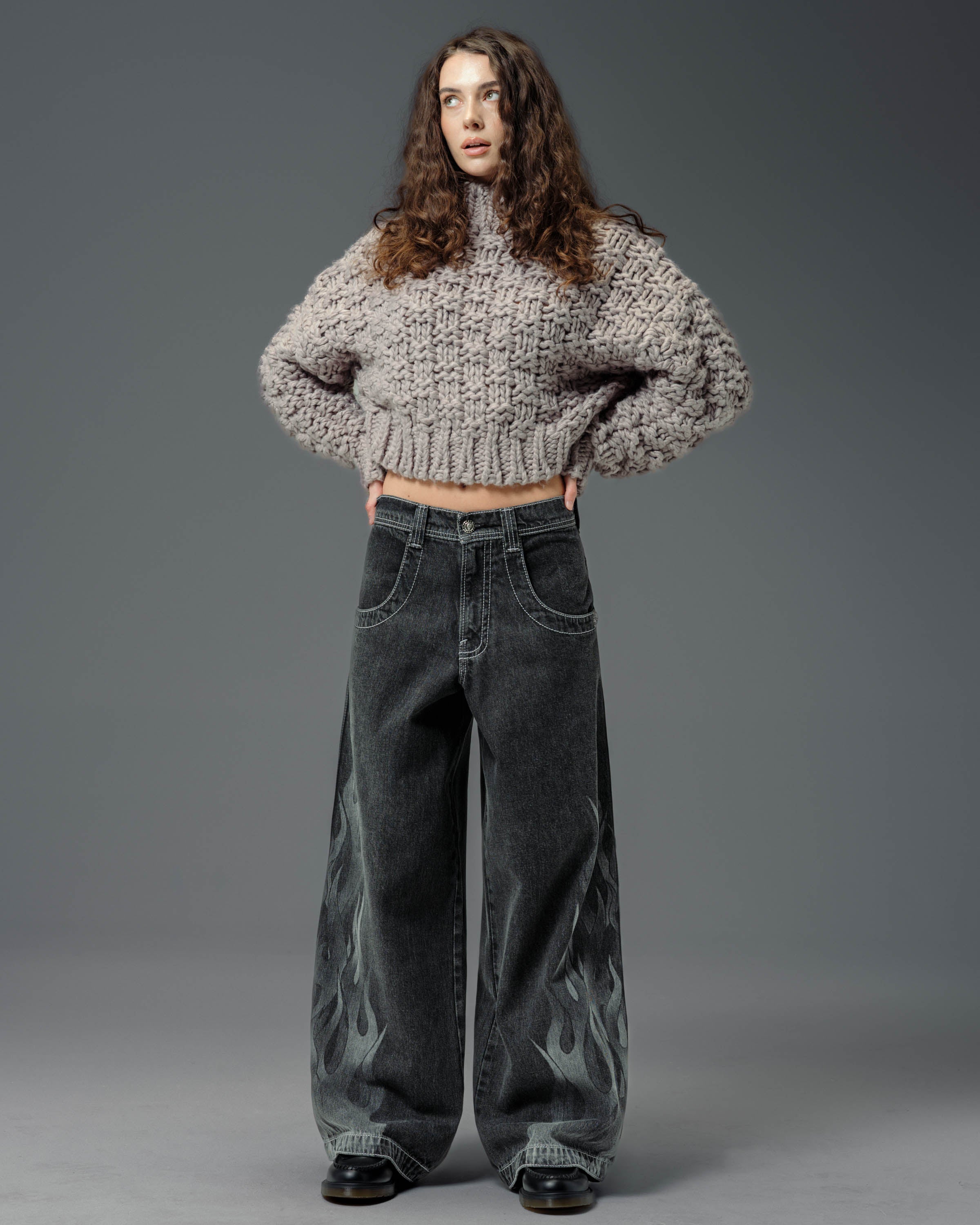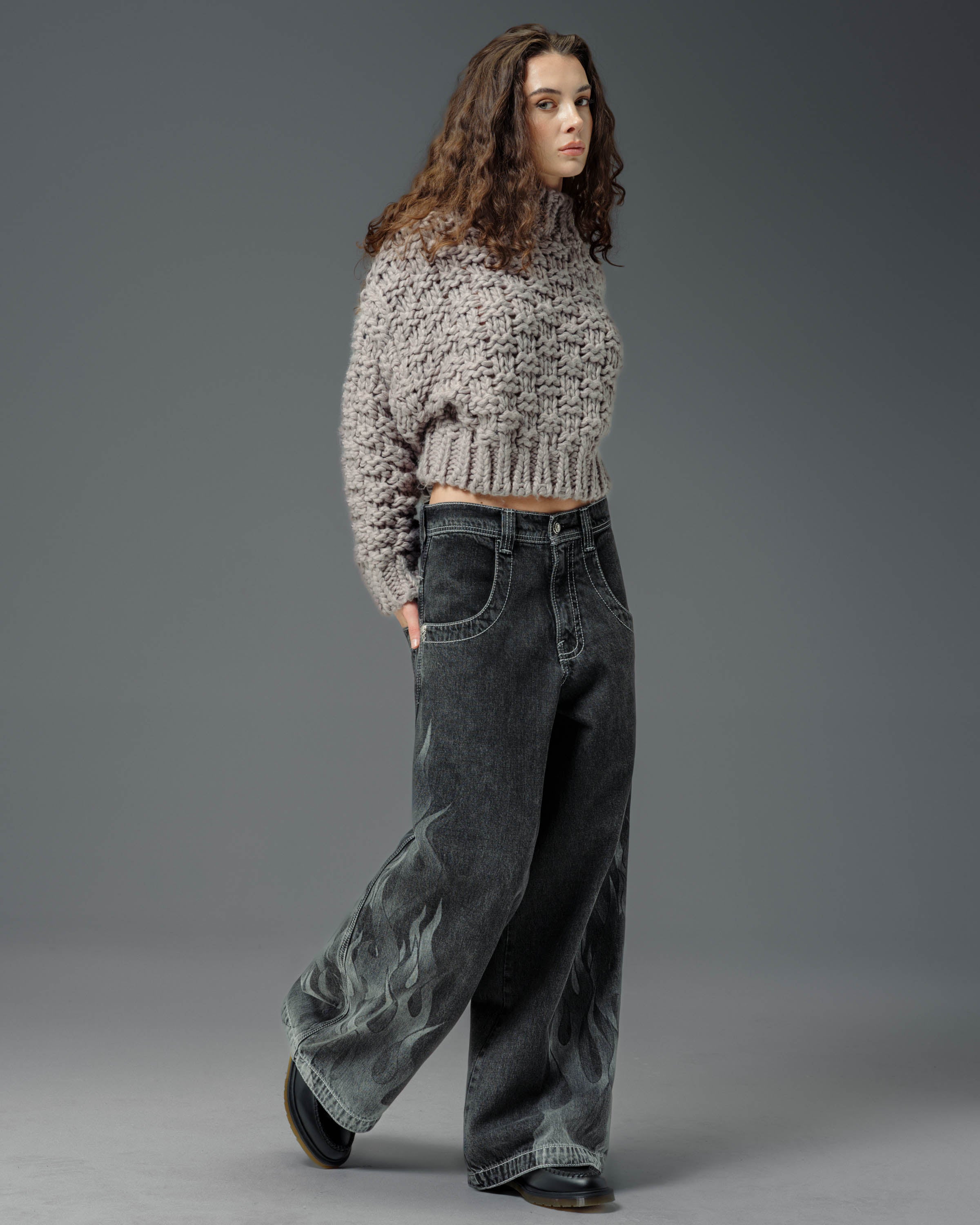 From the famous Tribal Collection. 13.5oz 100% cotton rope-dyed with a luxe starch wax finish in distressed vintage black. 26” bottom opening with contrast stitching and a classic oversized fit. Features original Tribal labels, tonal tribal flame artwork laser printed down both legs, skull and flame JNCO embroideries, and custom skull and jewel hardware with an antique finish and quartz stones. Collectible flasher included.