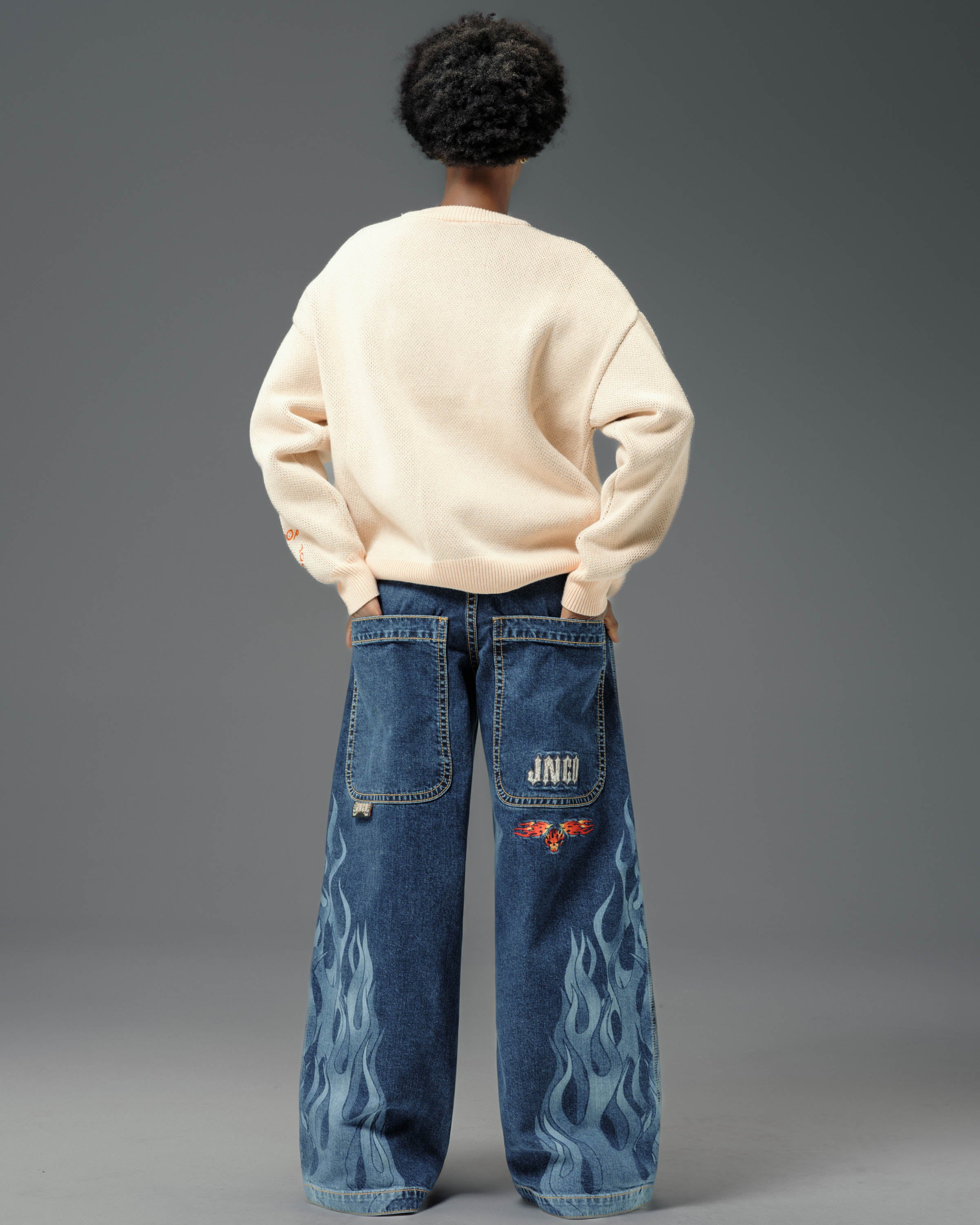 From the famous Tribal Collection. 13oz ring-spun denim in original Dark Stone Wash. 26” bottom opening with contrast stitching and a classic oversized fit. Features original Tribal labels, tonal tribal flame artwork laser printed down both legs, skull and flame JNCO embroideries, and custom skull and jewel hardware with an antique finish and quartz stones. Collectible flasher included.