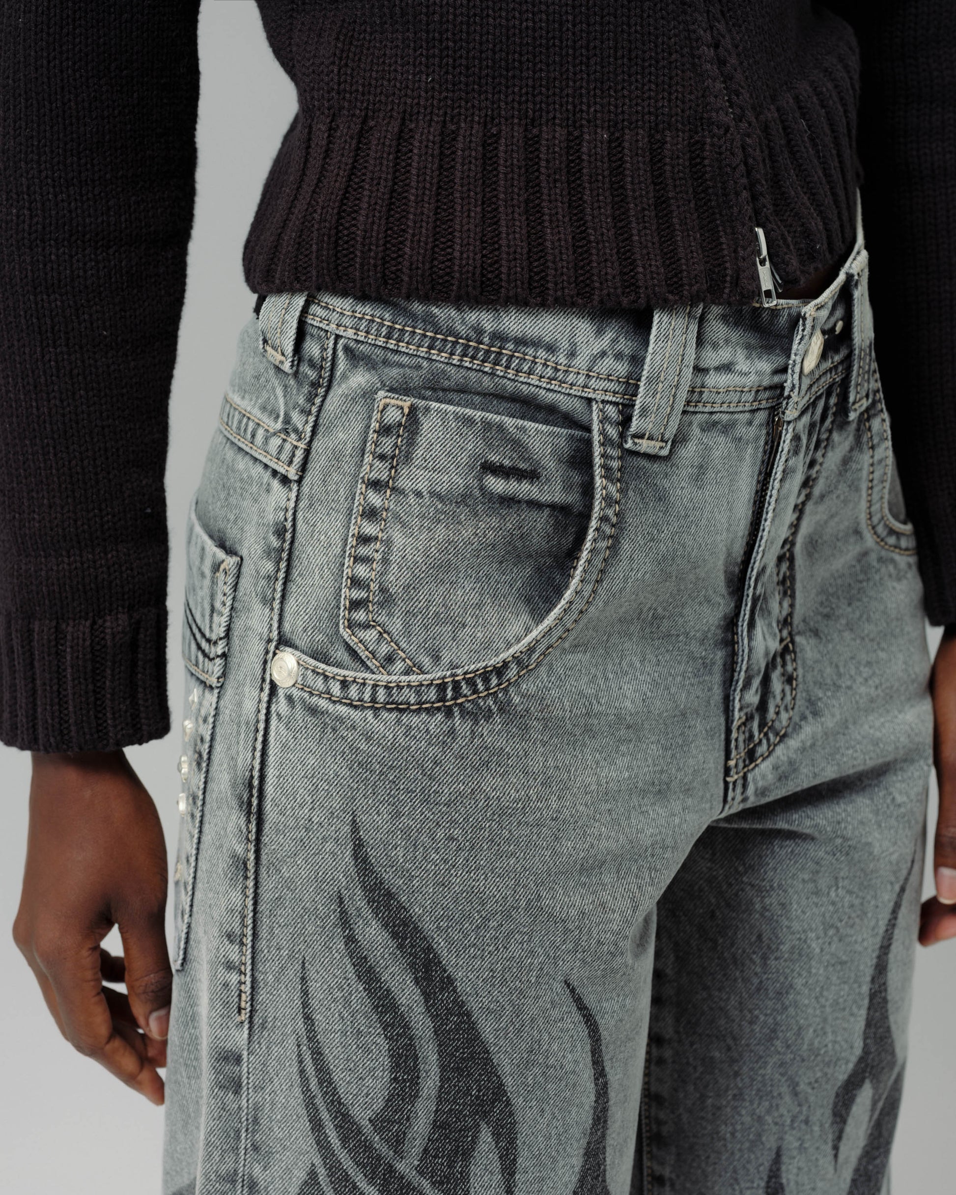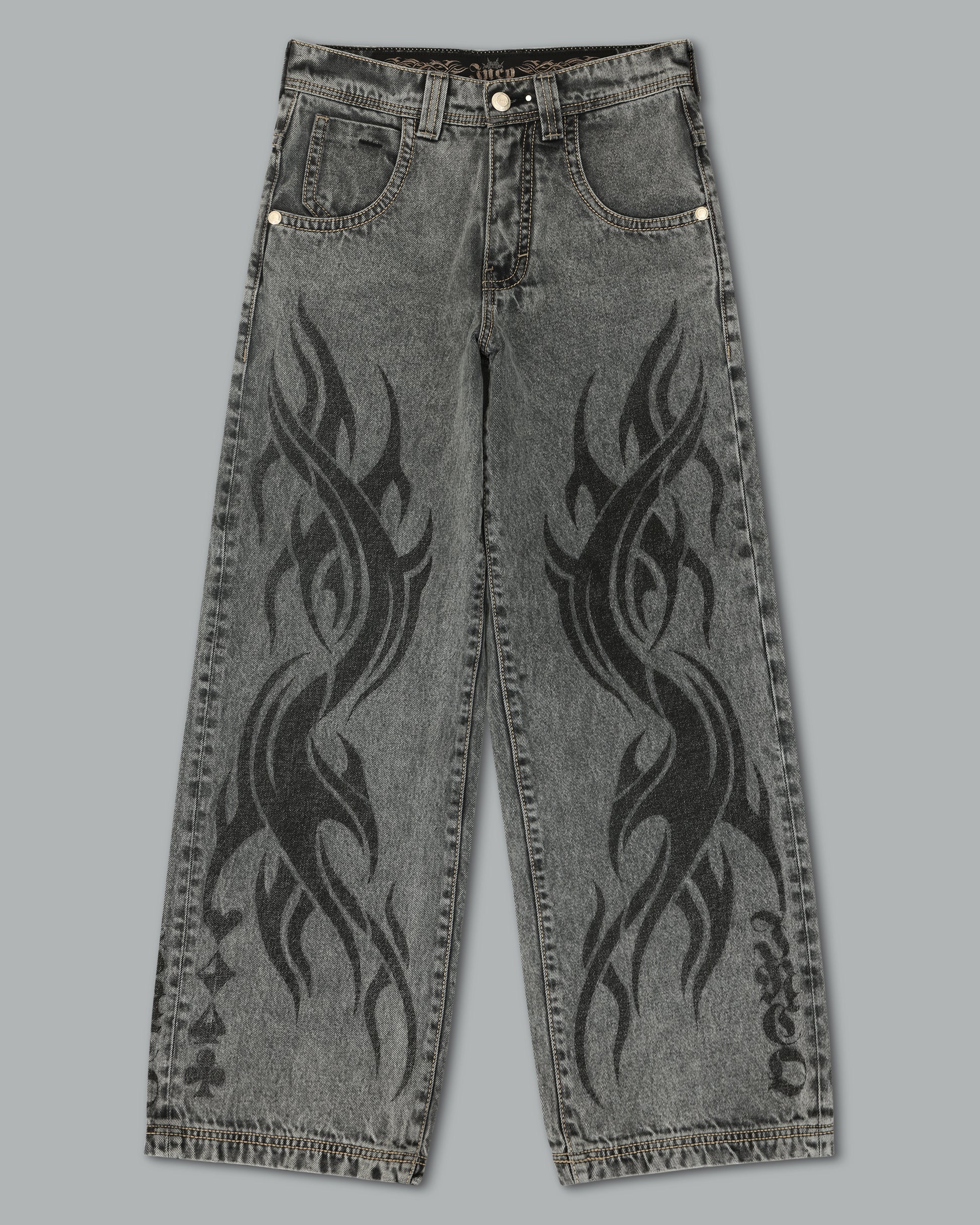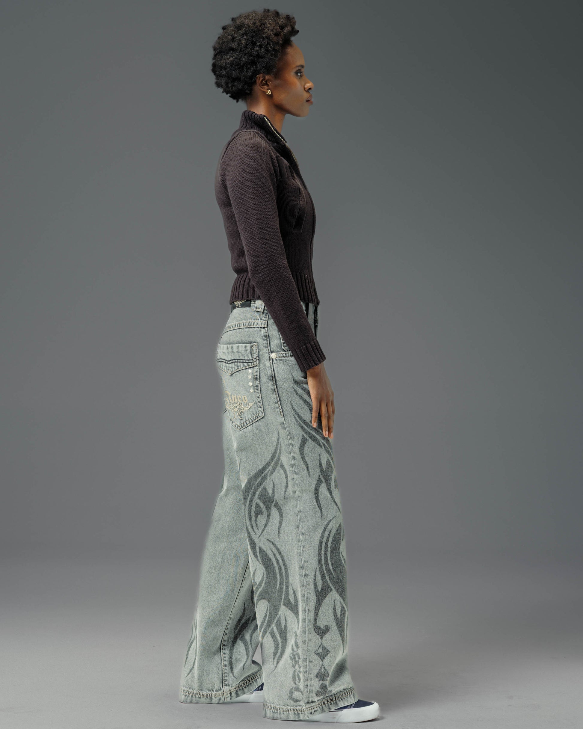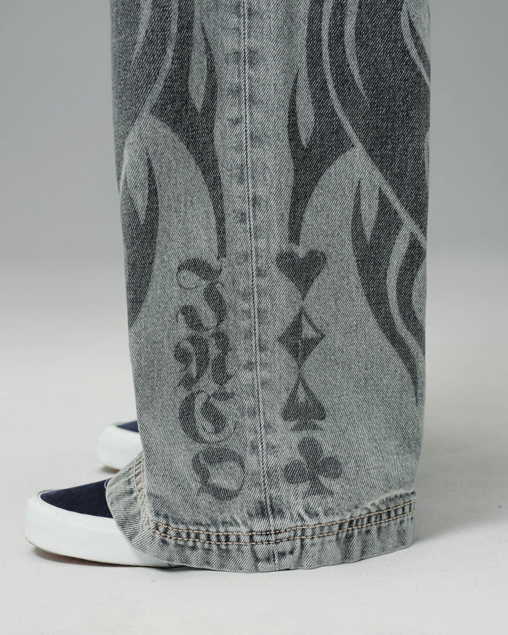 From the famous Tribal Collection. 13oz 100% cotton rope-dyed with a luxe starch wax finish and vintage “moonlight” wash. 23" bottom opening with contrast stitching and a wide-leg fit. Features tribal flame artwork printed down both legs, original Celtic-inspired tribal embroidery on the back pocket in pale white gold metallic thread, and the signature four-suit rivets. Collectible flasher included.