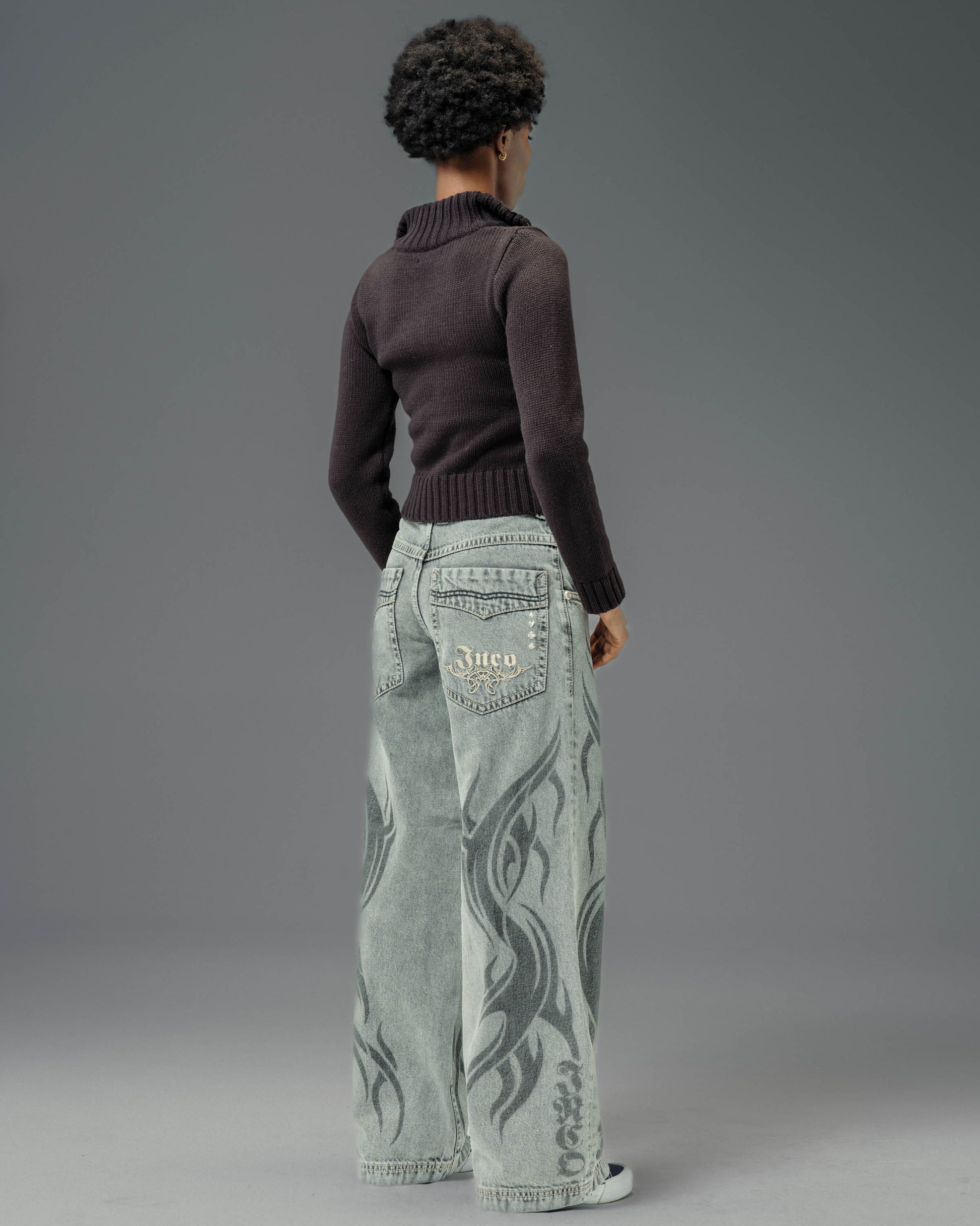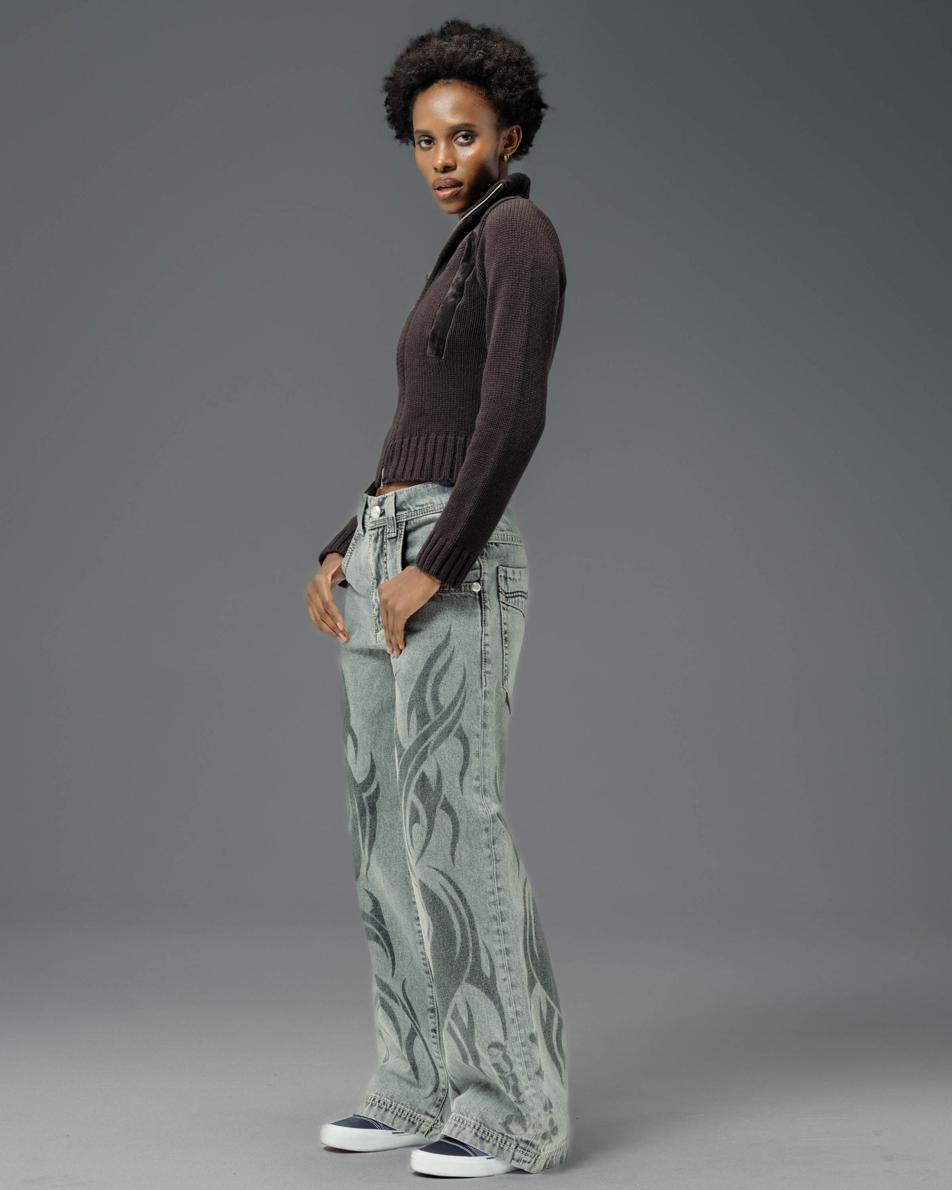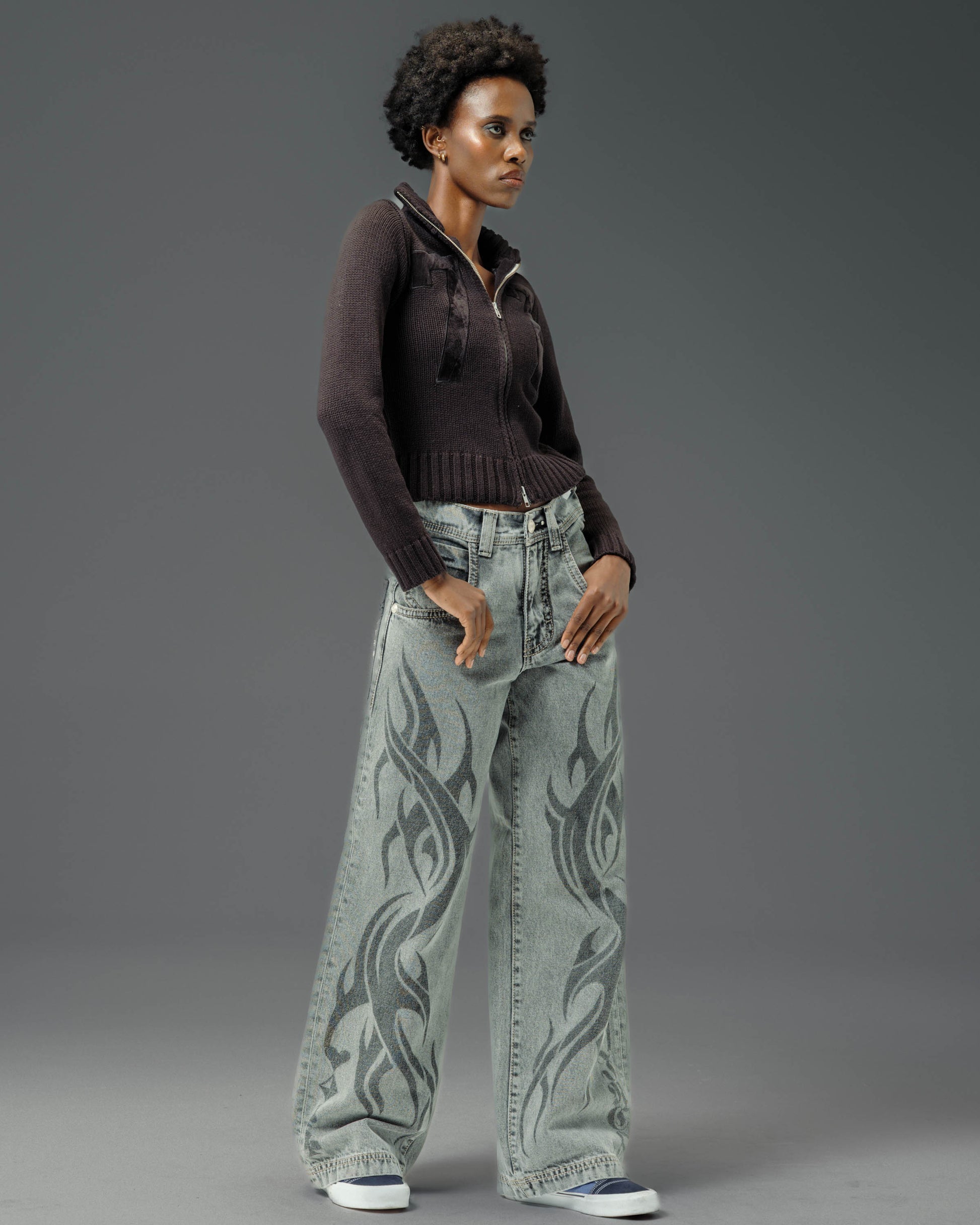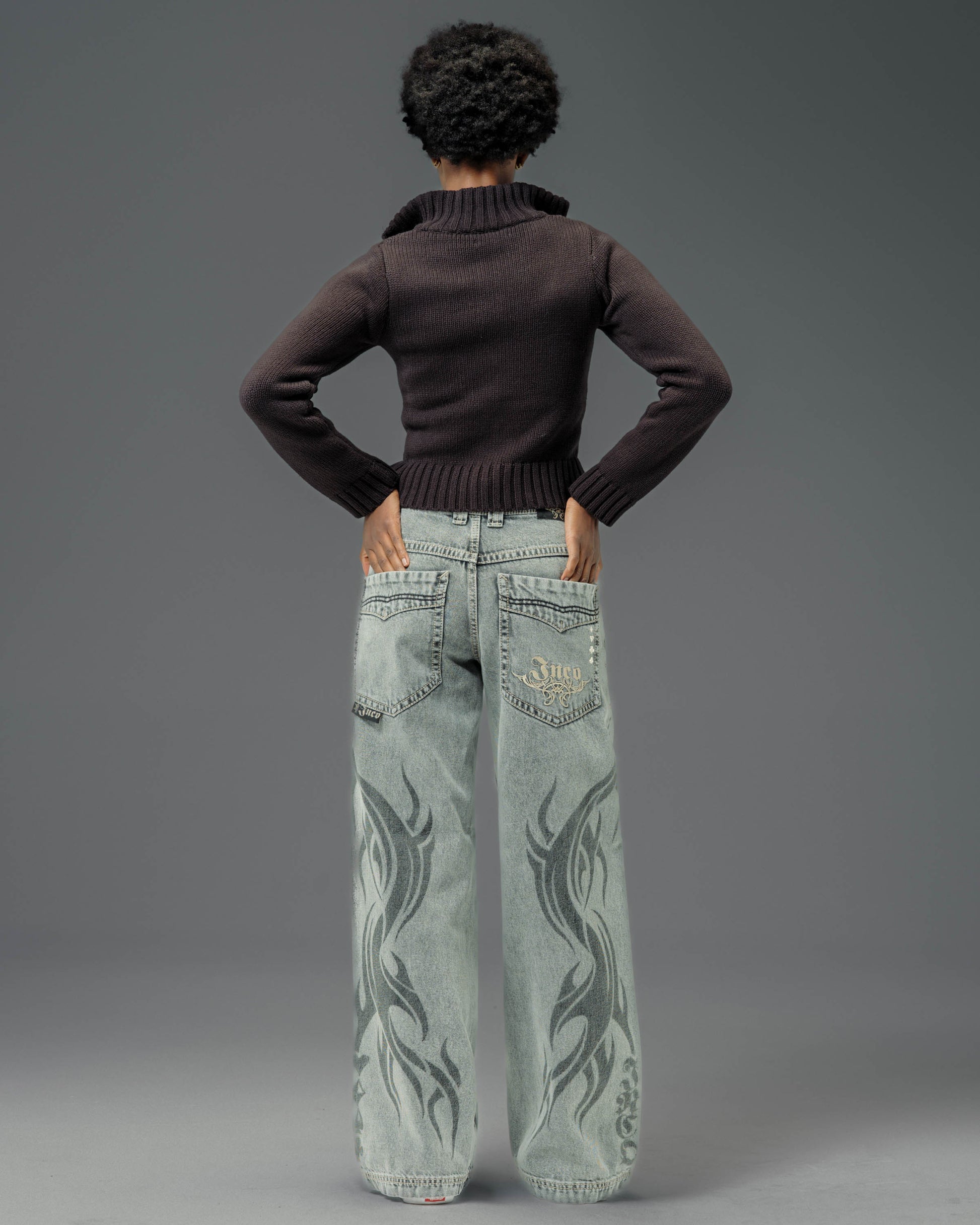 From the famous Tribal Collection. 13oz 100% cotton rope-dyed with a luxe starch wax finish and vintage “moonlight” wash. 23" bottom opening with contrast stitching and a wide-leg fit. Features tribal flame artwork printed down both legs, original Celtic-inspired tribal embroidery on the back pocket in pale white gold metallic thread, and the signature four-suit rivets. Collectible flasher included.