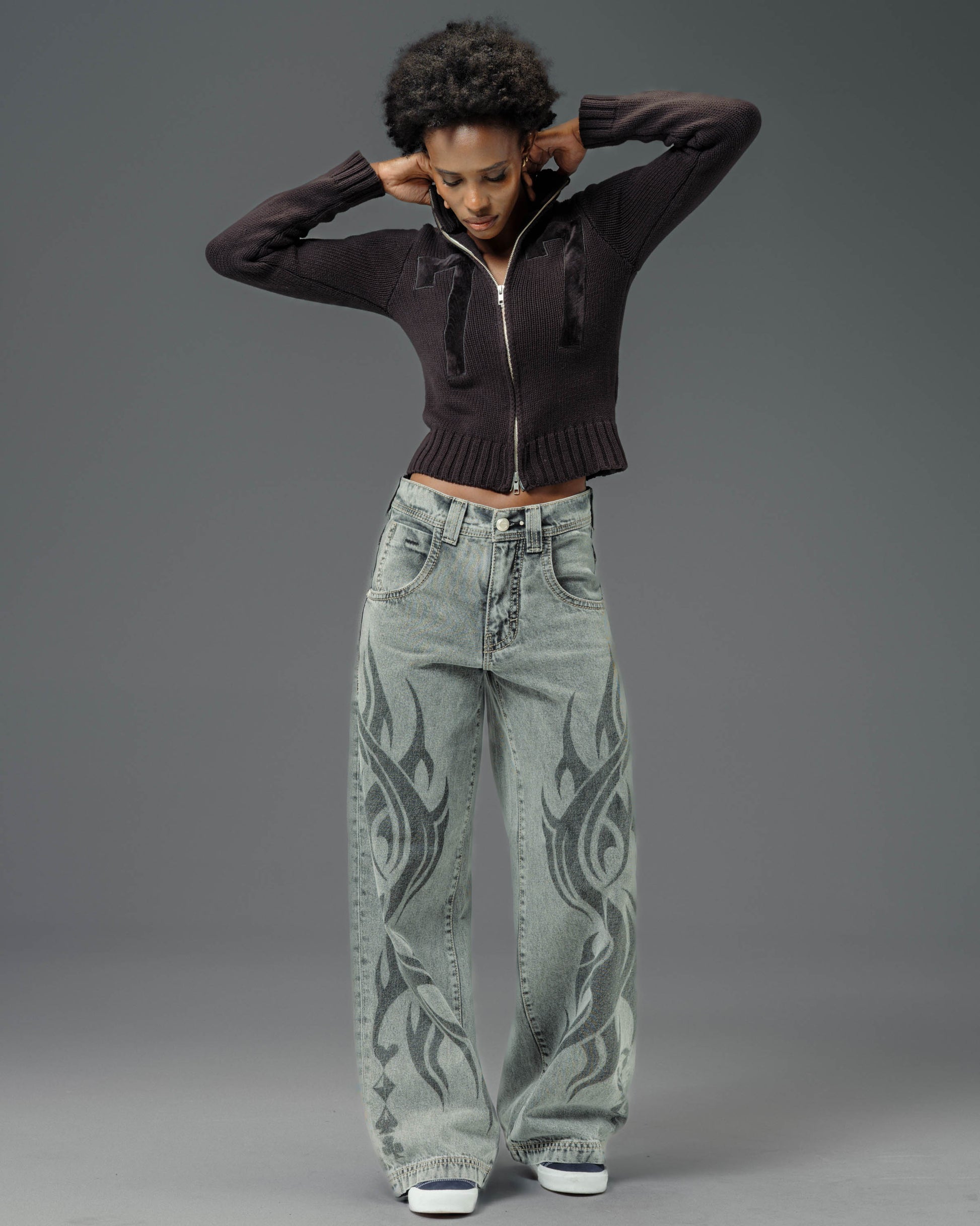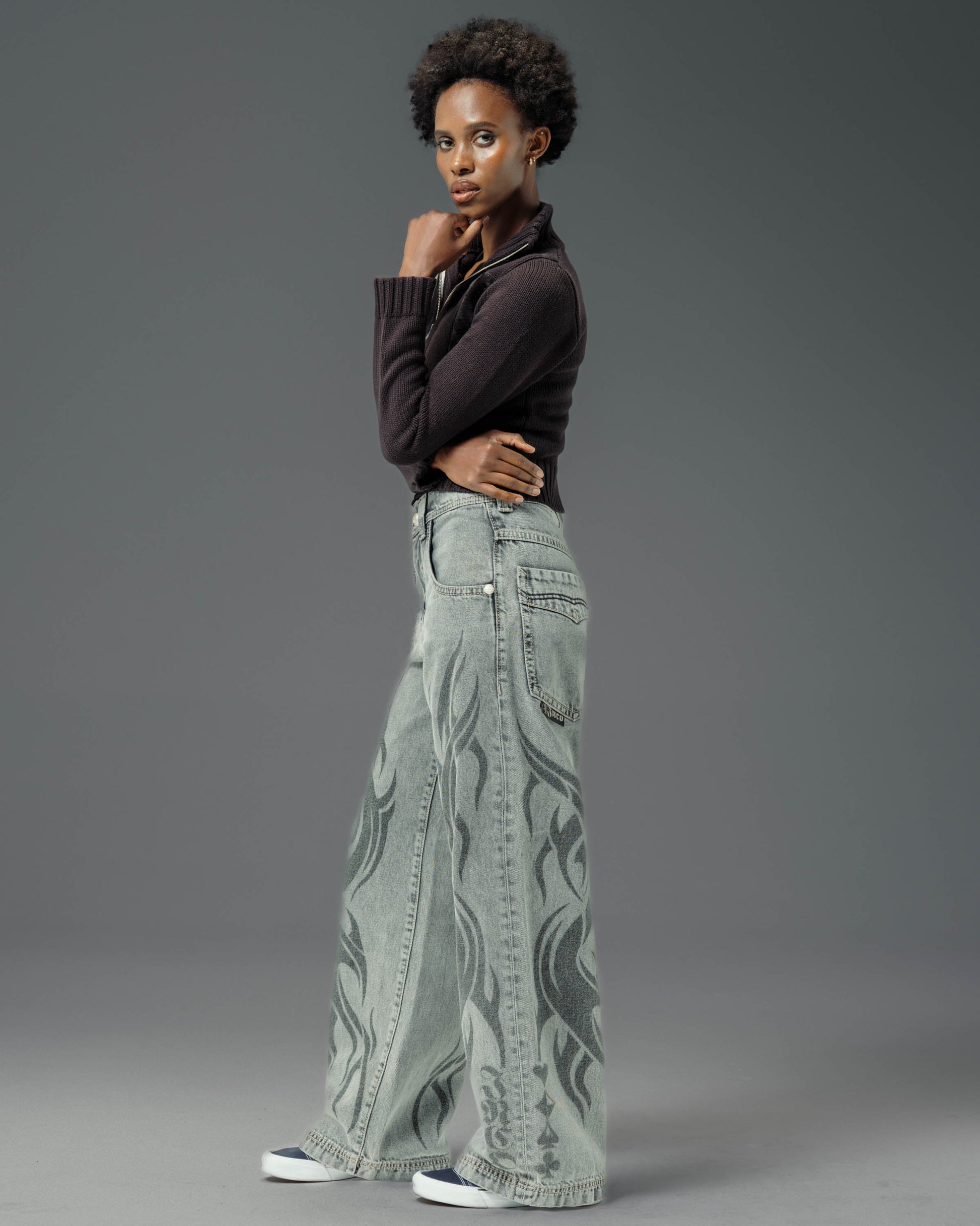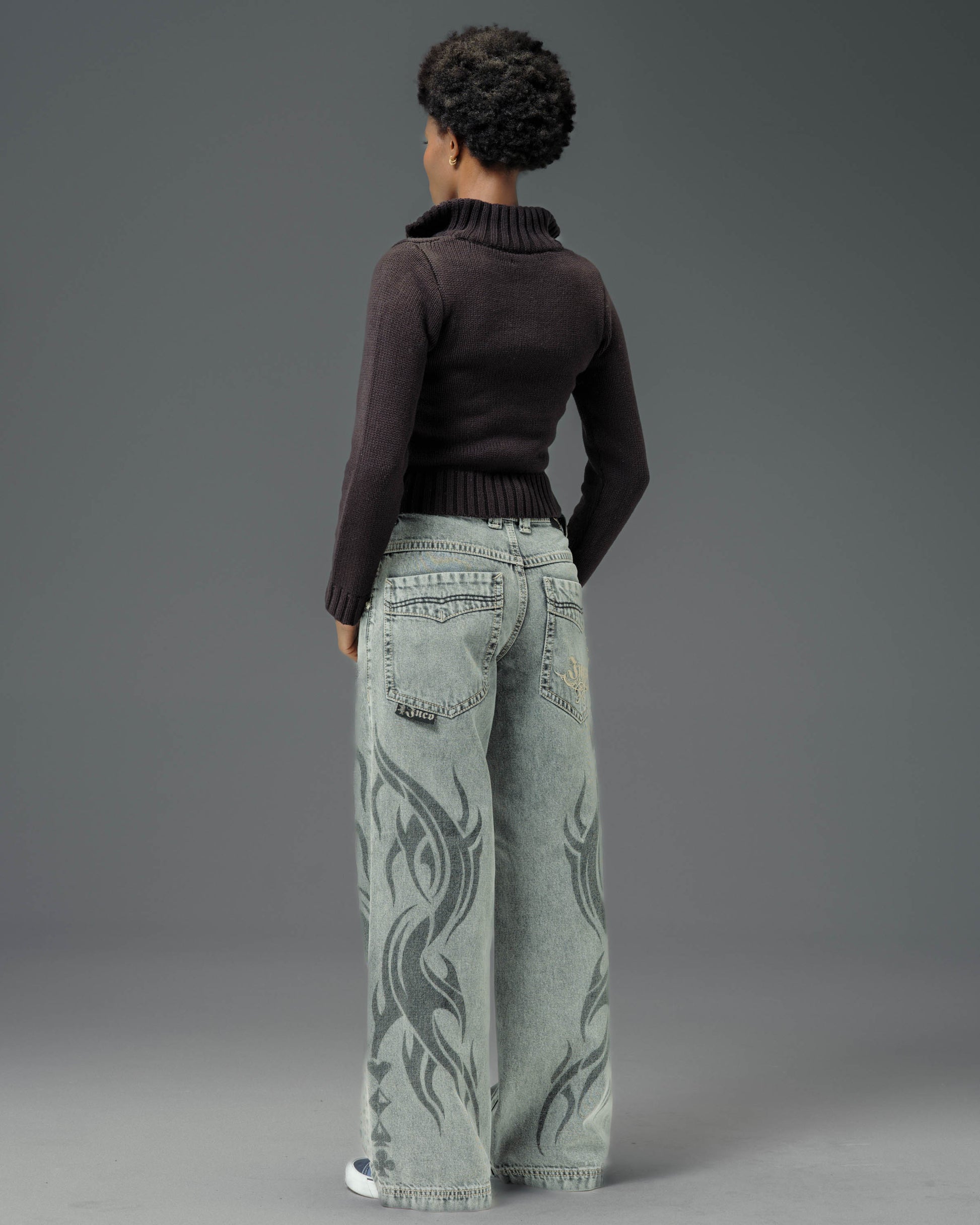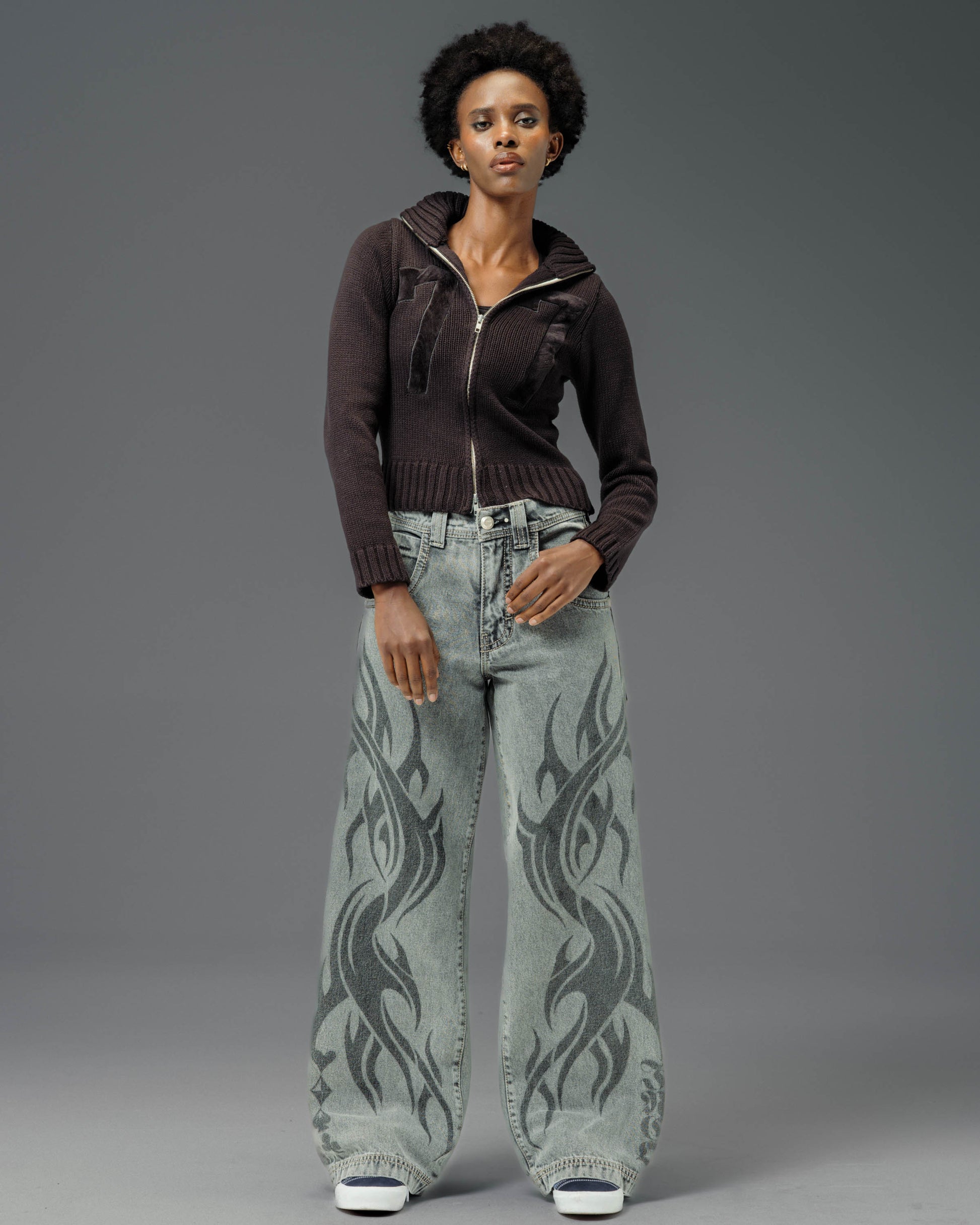 From the famous Tribal Collection. 13oz 100% cotton rope-dyed with a luxe starch wax finish and vintage “moonlight” wash. 23" bottom opening with contrast stitching and a wide-leg fit. Features tribal flame artwork printed down both legs, original Celtic-inspired tribal embroidery on the back pocket in pale white gold metallic thread, and the signature four-suit rivets. Collectible flasher included.