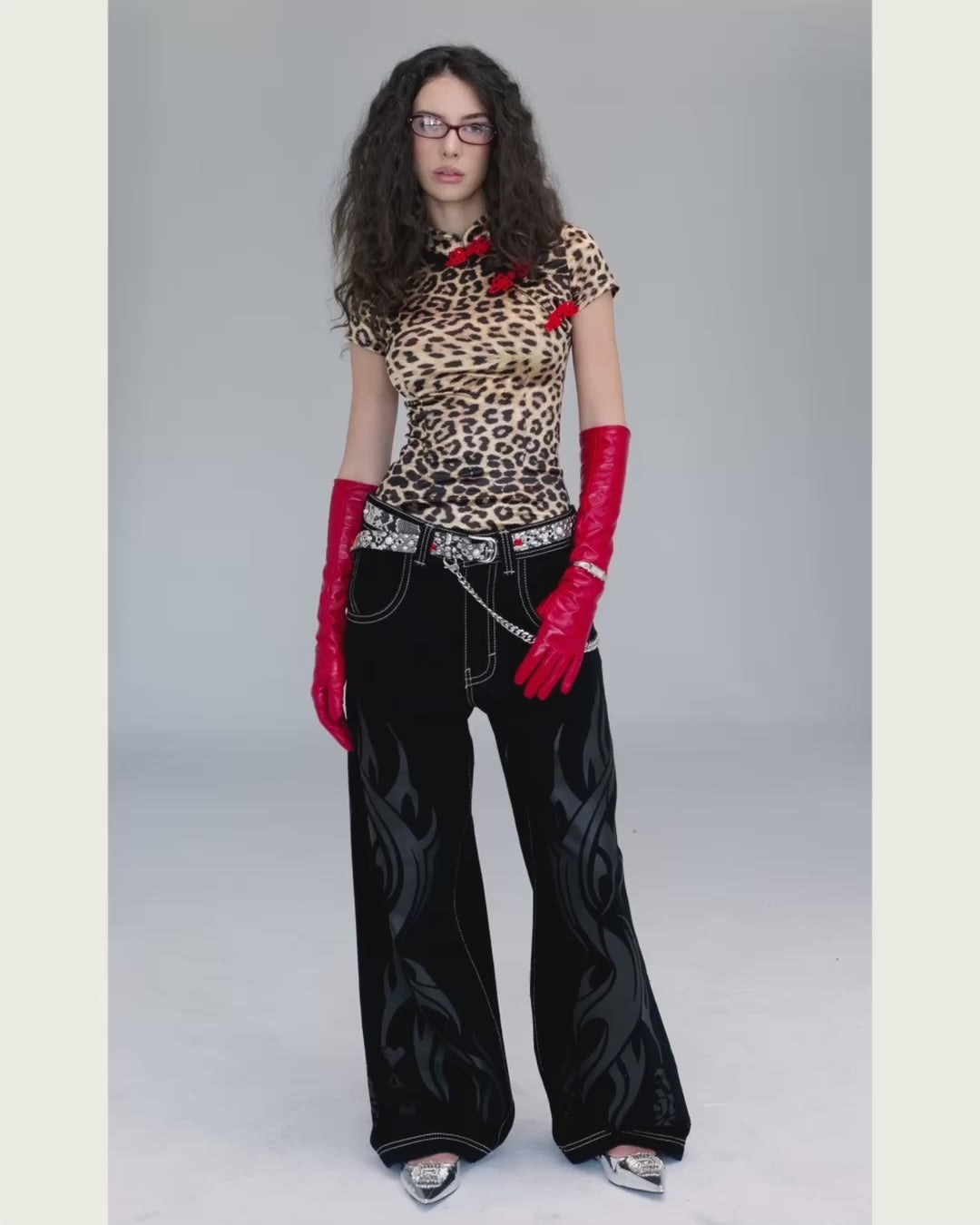 From the famous Tribal Collection. 13 oz. rope-dyed jet black denim, finished with a luxe blended starch wax for a smooth, structured feel. 23" bottom opening with contrast stitching and a wide-leg fit. Features tonal tribal flame artwork printed down both legs, original Celtic-inspired tribal embroidery on the back pocket in palladium metallic thread, and the signature four-suit rivets. Collectible flasher included.