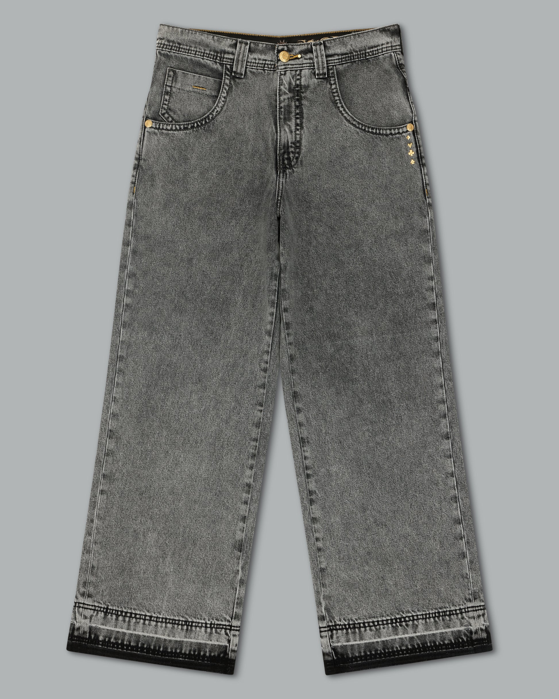 From the famous Tribal Collection. 13oz 100% cotton rope-dyed with a luxe starch wax finish and vintage “moonlight” wash. 23" bottom opening with an oversized fit and frayed edge. Features original Tribal labels, custom hardware, and gilded four-suit house rivet set. Collectible flasher included.