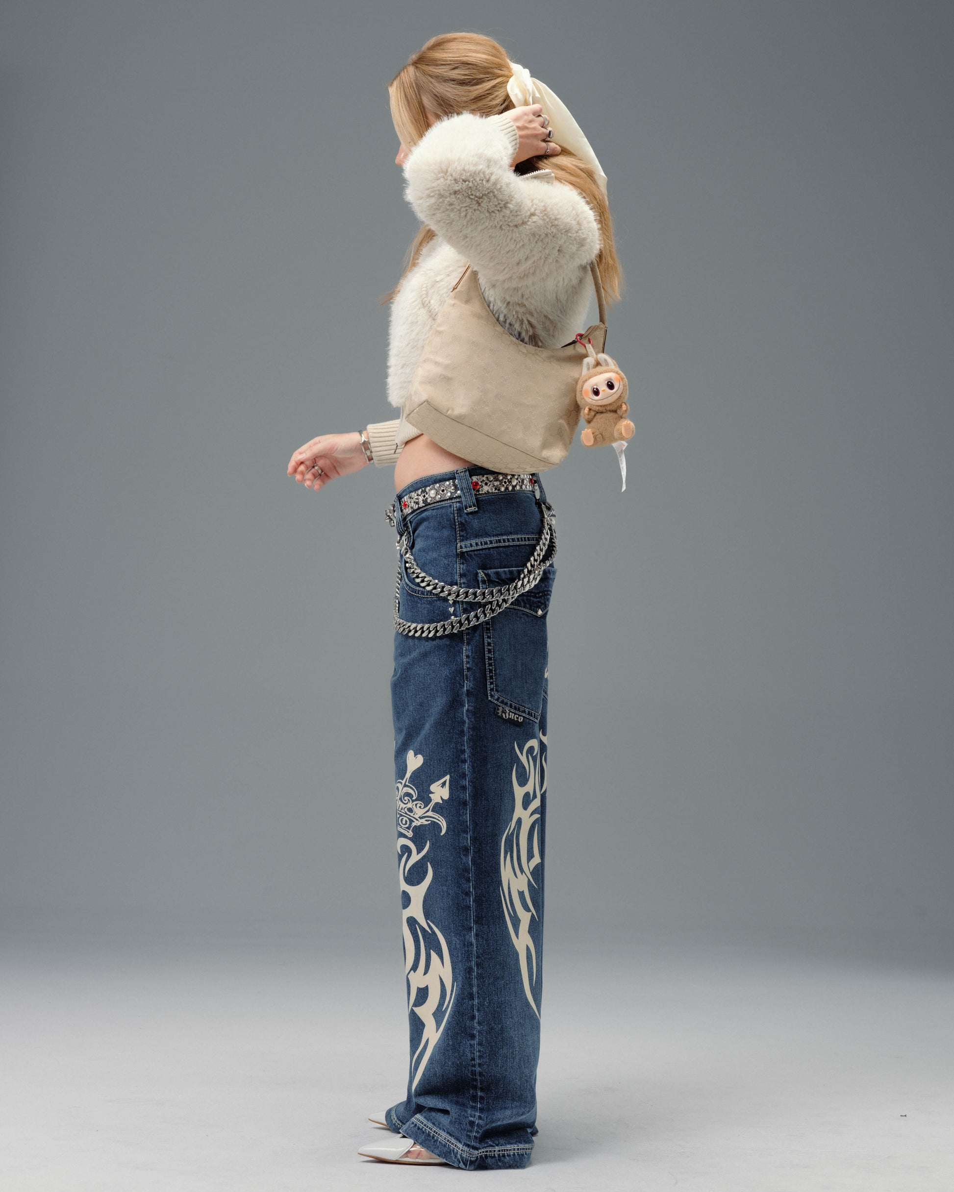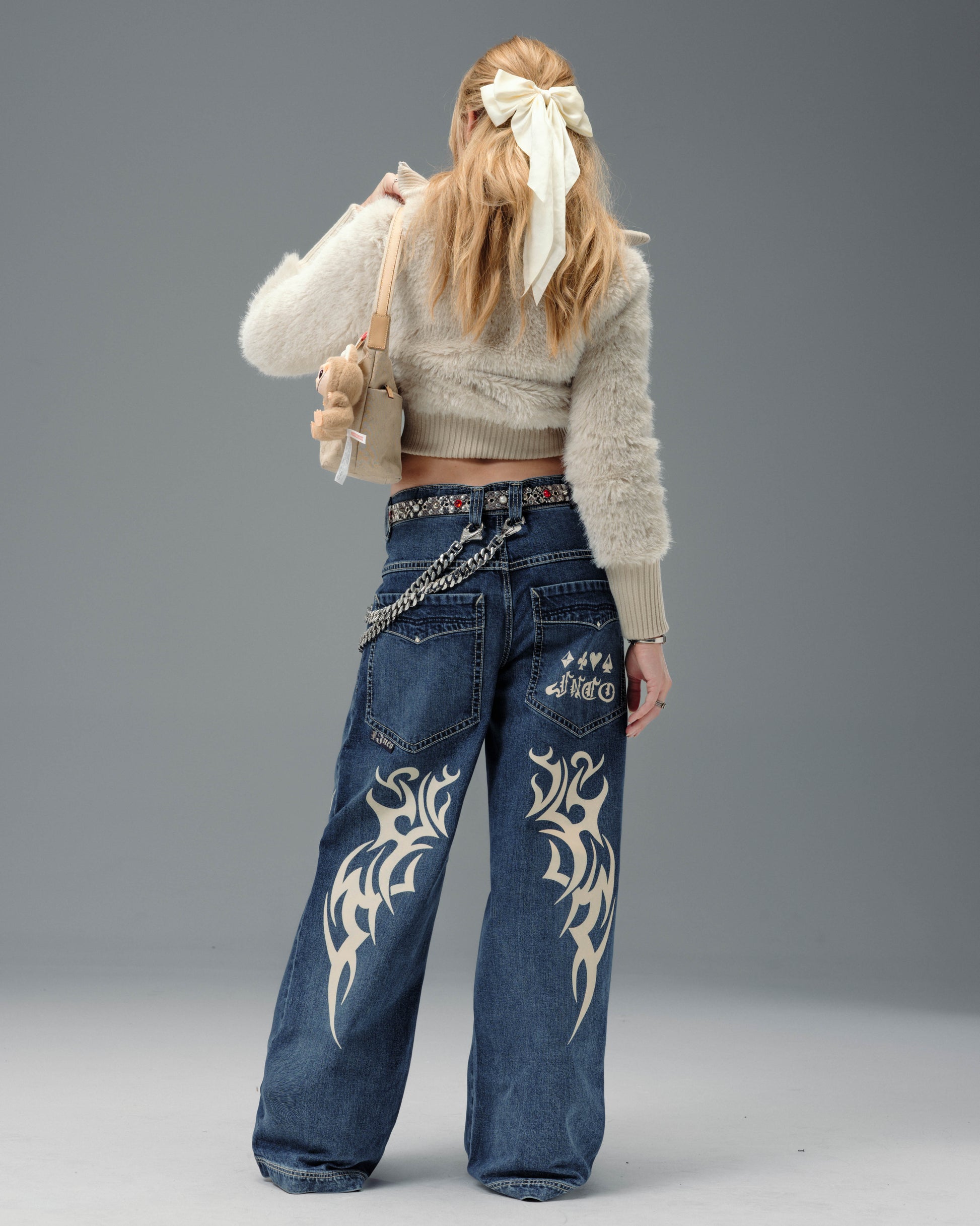 Features symmetrical tribal graphics on front and back legs, Old English logos, crowned icons, and card suit embroidery.