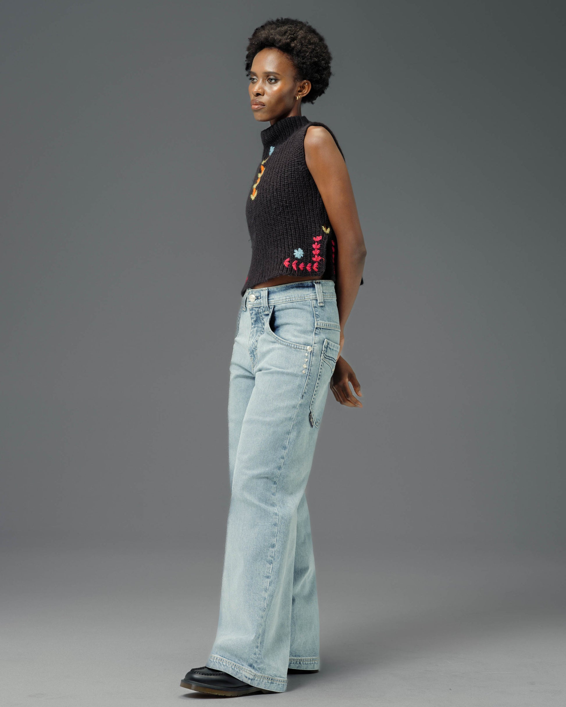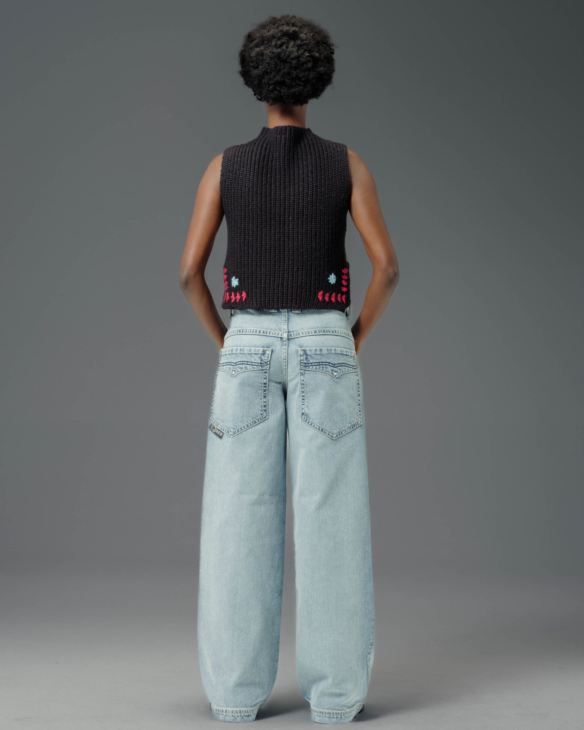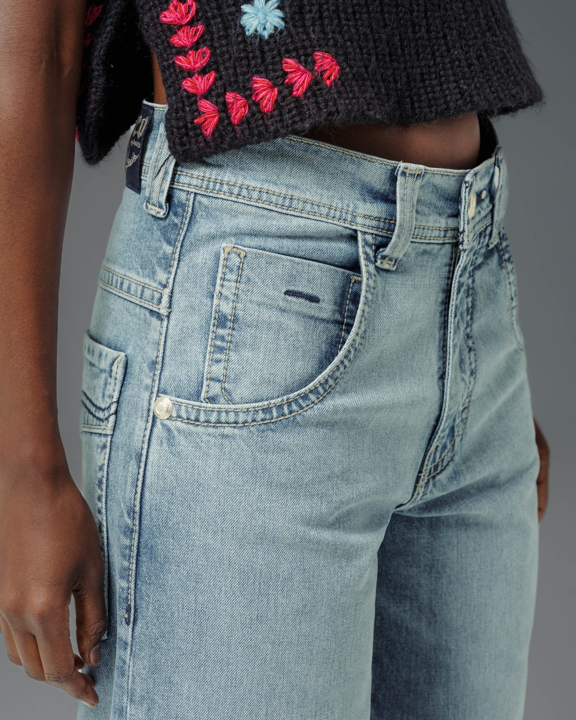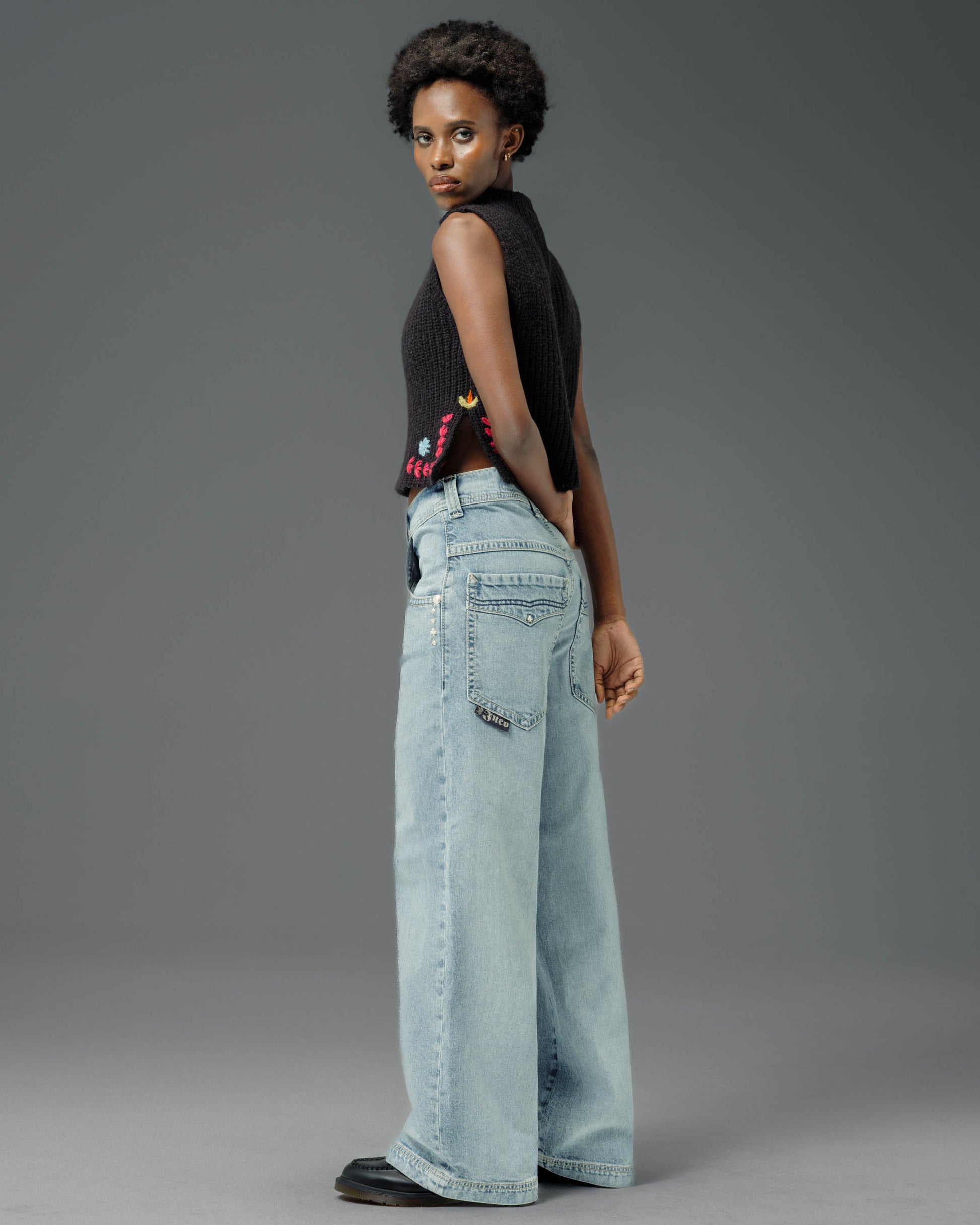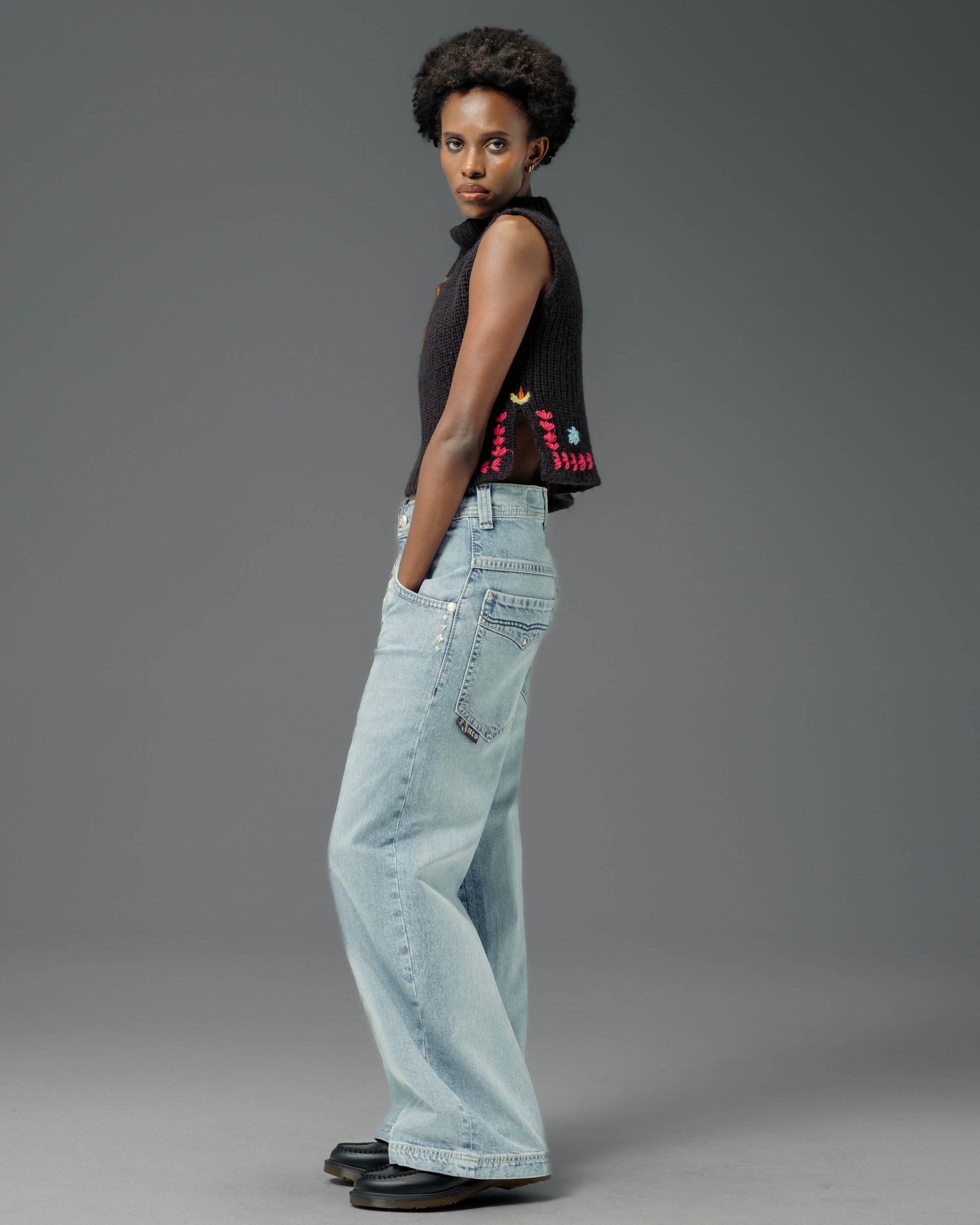 From the famous Tribal Collection in Hand-Sand Vintage Wash. 13oz ring-spun denim with an authentic, retro-inspired finish. 23" bottom opening with contrast stitching and an oversized fit. Features original Tribal labels, custom hardware, and gilded four-suit house rivet set. Collectible flasher included.