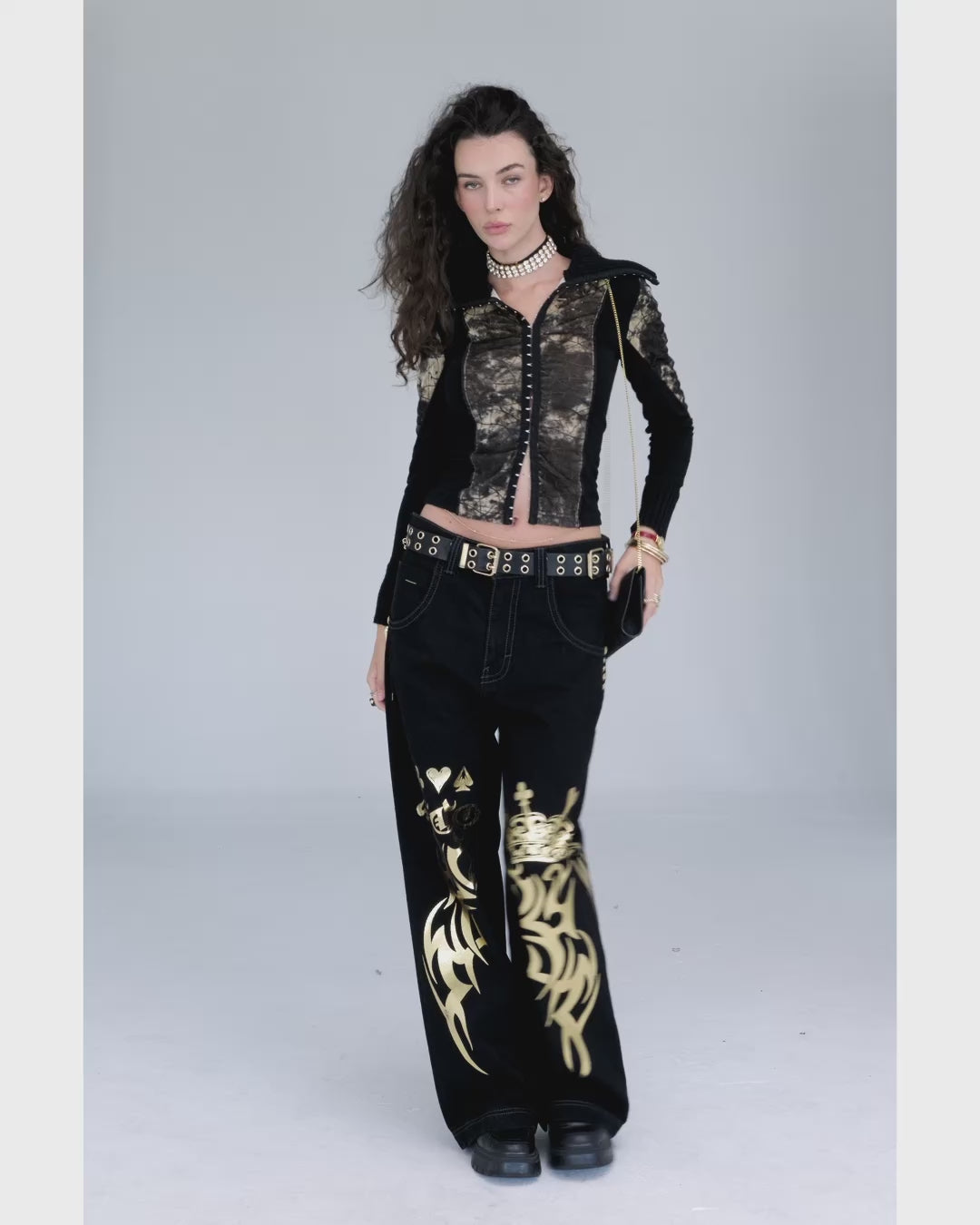 From the famous Tribal Collection. 13.5oz ring-spun cotton denim in a deep Jet Black wash with bold twill texture and retro-inspired construction. 23" bottom opening with contrast stitching and an oversized fit. Features original Tribal Gambler graphics in heritage gold foil, Old English logos, crowned symbols, and card suit icons. Custom hardware and gilded four-suit rivet add refined detail. Collectible flasher included.