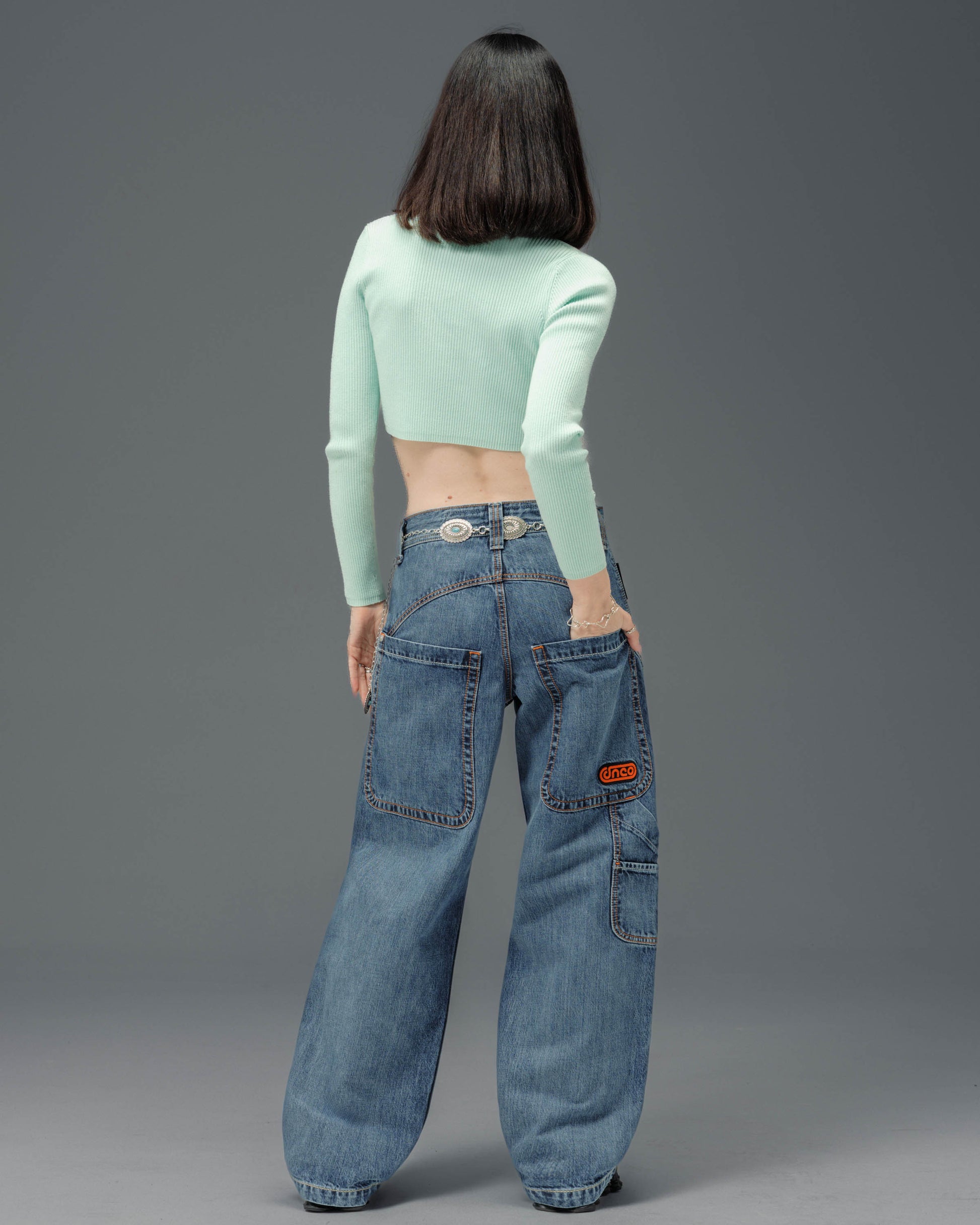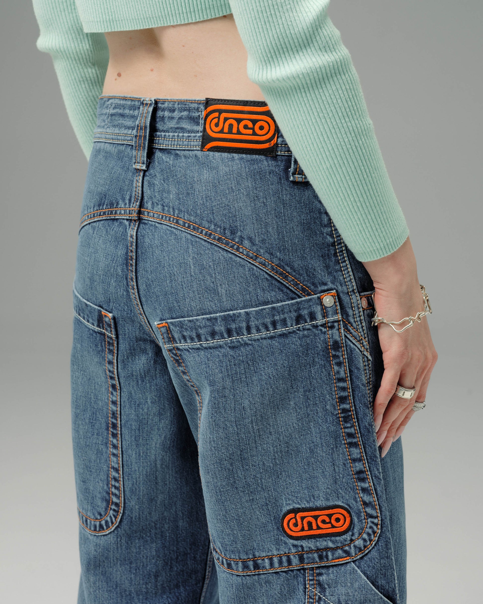 A one-of-a-kind JNCO classic, reintroducing our iconic carpenter style. 13.75oz 3x1 right-hand denim with a light crosshatch in a dark pure indigo shade and hand-sand finish. 20" bottom opening with heavy double thread stitching throughout. Features all original Handyman artwork, labels, and back right pocket logo embroidery. Collectible keychain sold separately. Limited Edition – very limited stock.