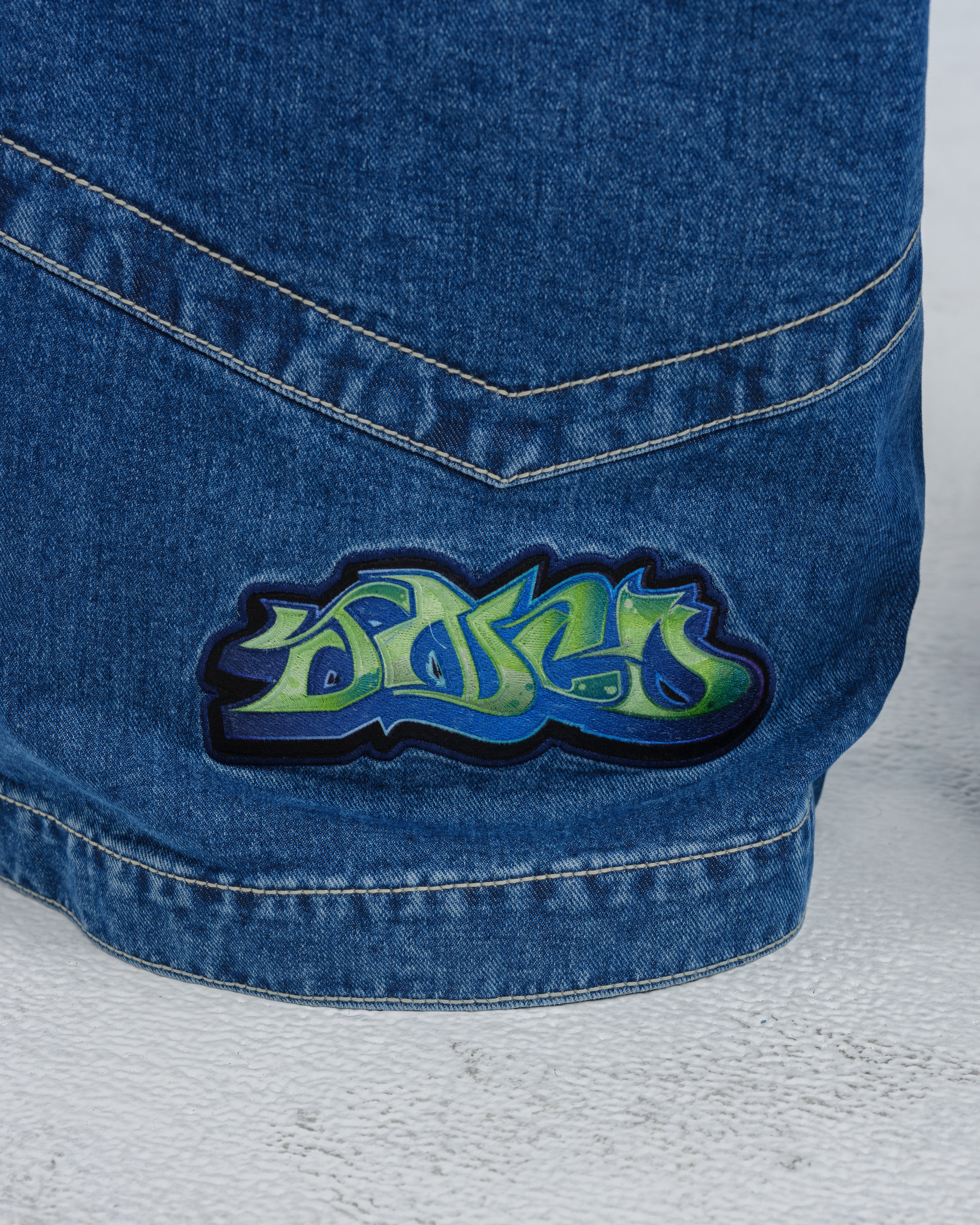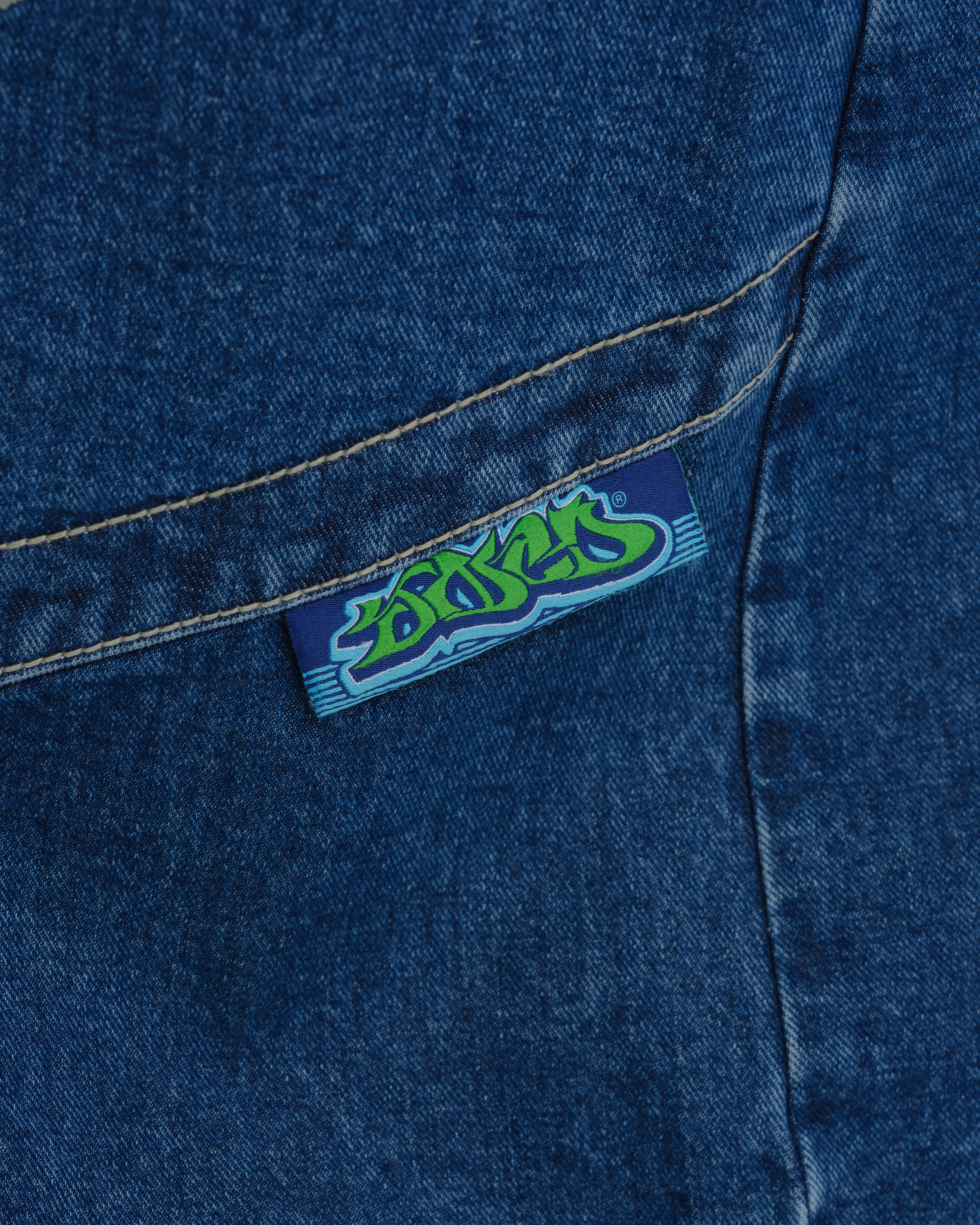 Collector’s item from the original JNCO Roots line. Dark Stone Wash, 34" bottom opening. 14oz 100% cotton denim with heavy double contrast stitching. Oversized back pockets with JNCO logo and “hangin' tagger” embroidery. Original labels and collectible metallic flasher. Limited Edition – very limited stock.