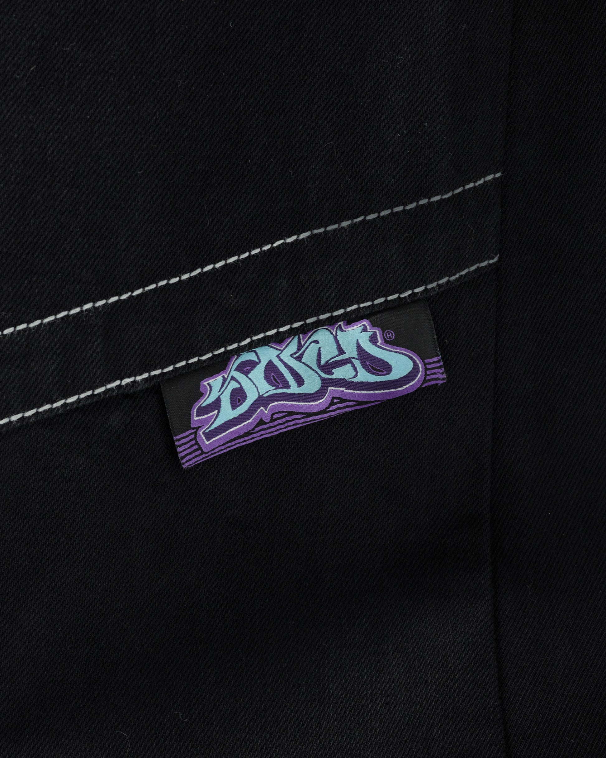 Collector’s item from the original JNCO “Roots” line. Jet Black denim, 34" bottom opening. 13oz rope-dyed 100% cotton with a luxe starch wax finish. Heavy double contrast stitching. Oversized back pockets with JNCO logo and “hangin’ tagger” embroidery. Original labels and collectible metallic flasher. Limited Edition – very limited stock.